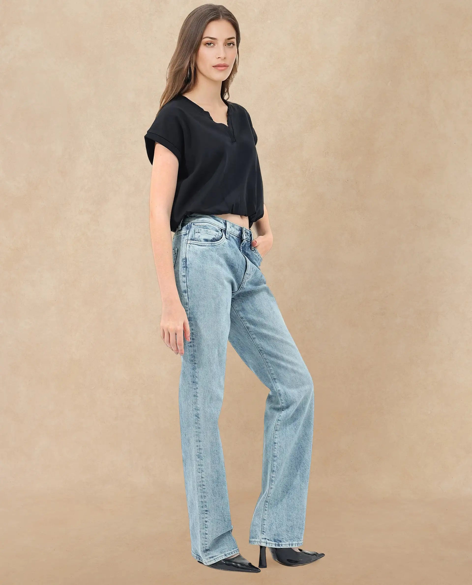 Rareism Women Sanderson Black Cotton Fabric Short Sleeve V-Neck Solid Regular Fit Top