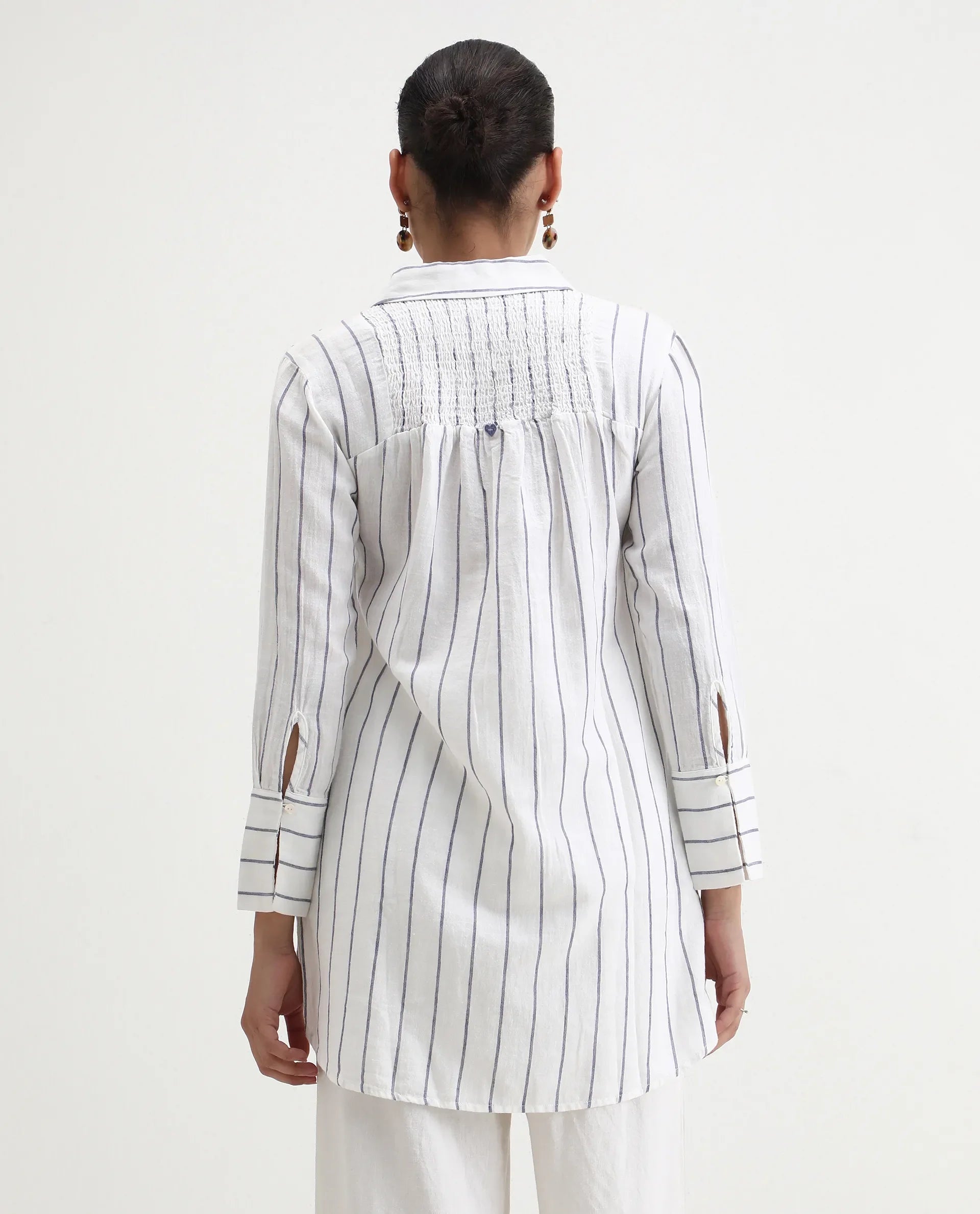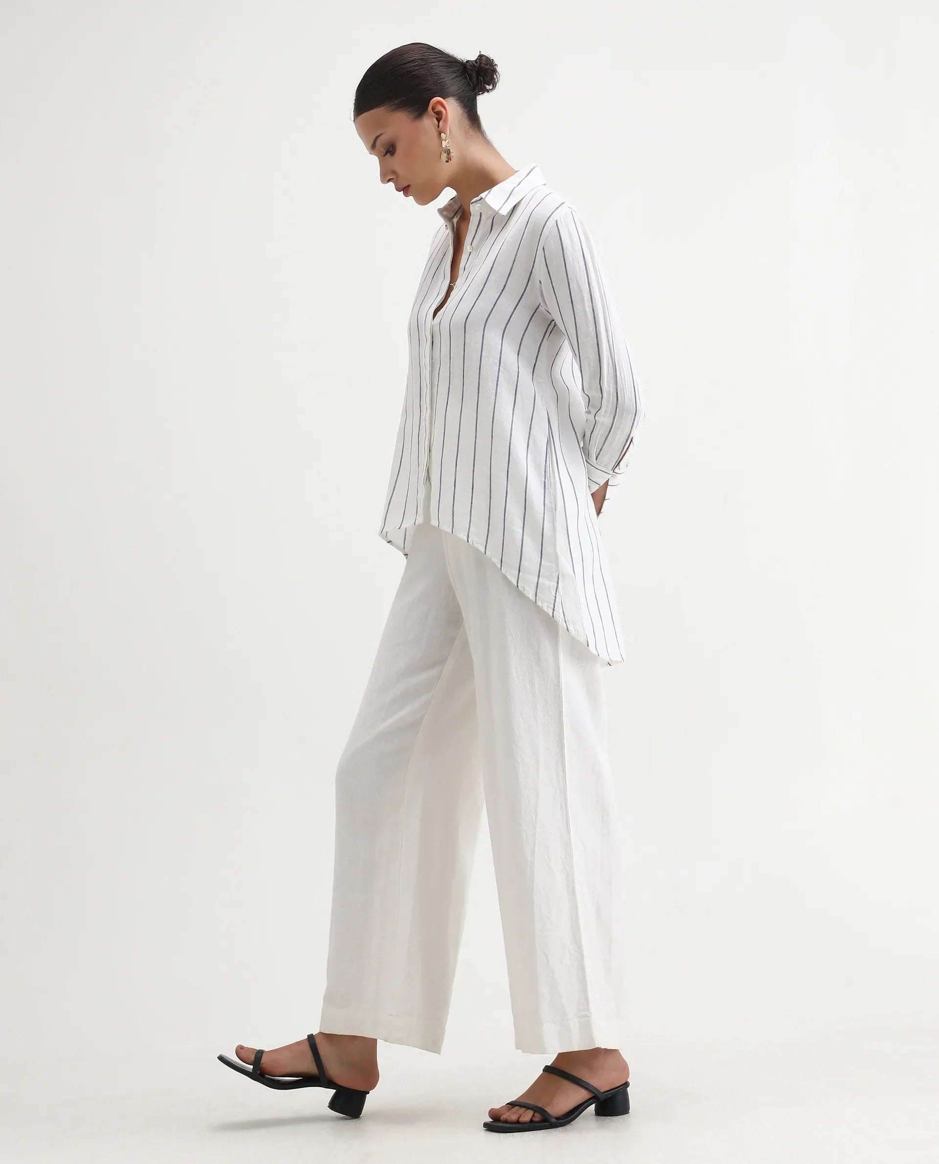 -A modern style asymmetrical linen shirt in vertical stripes.
