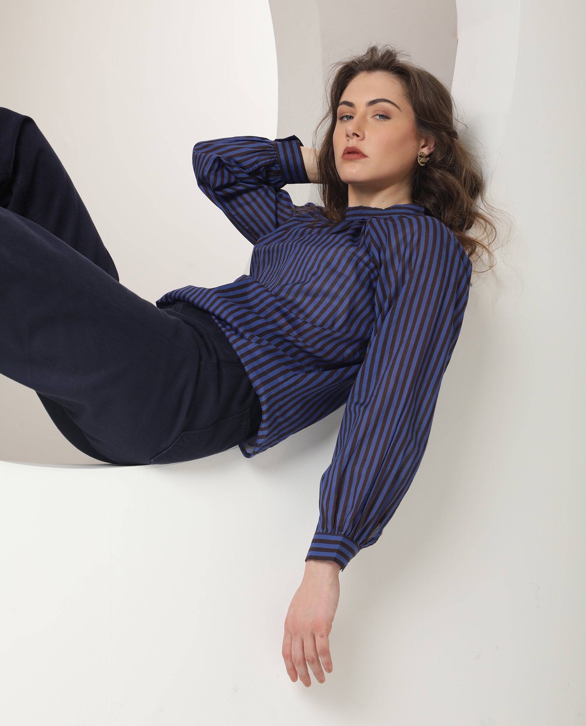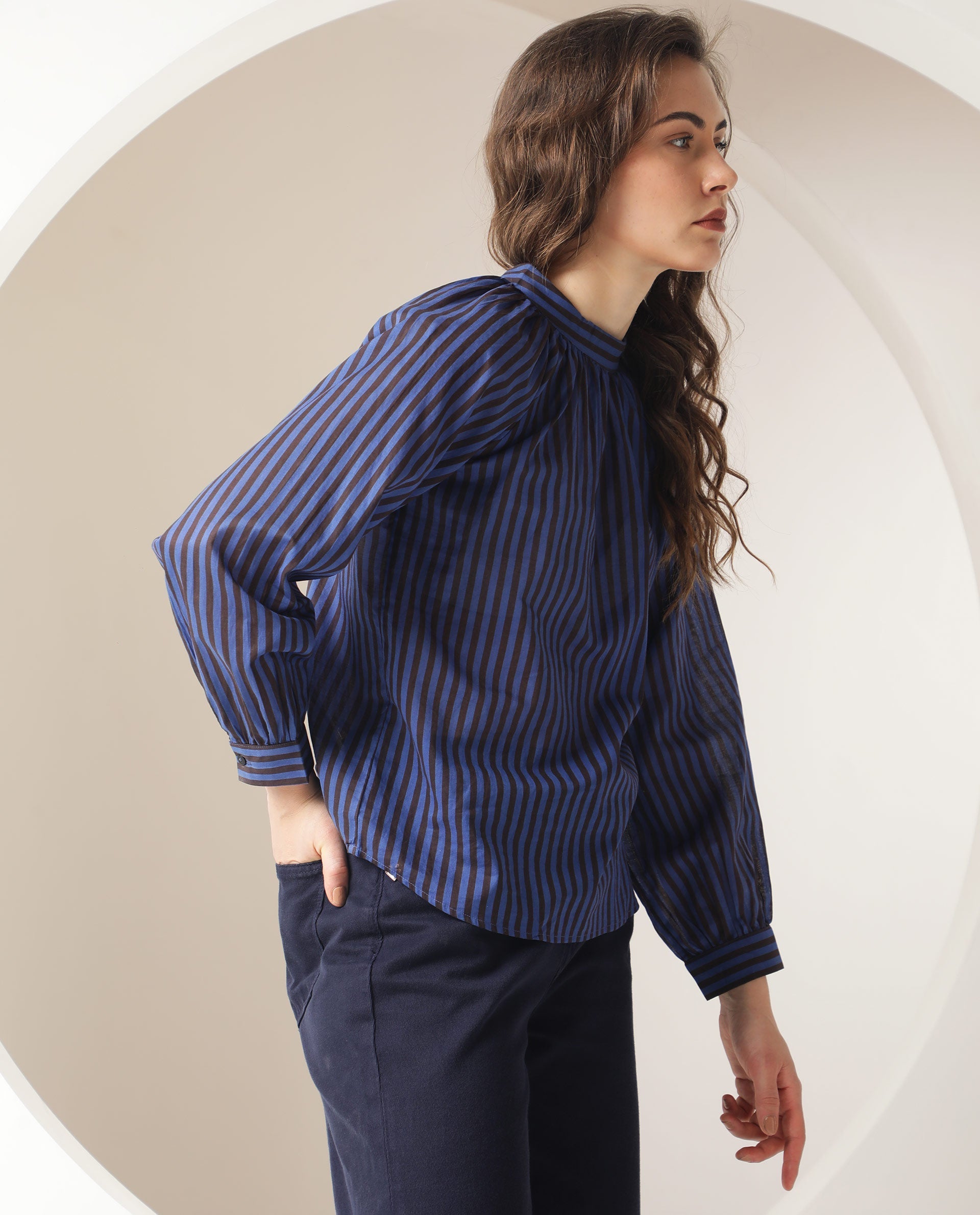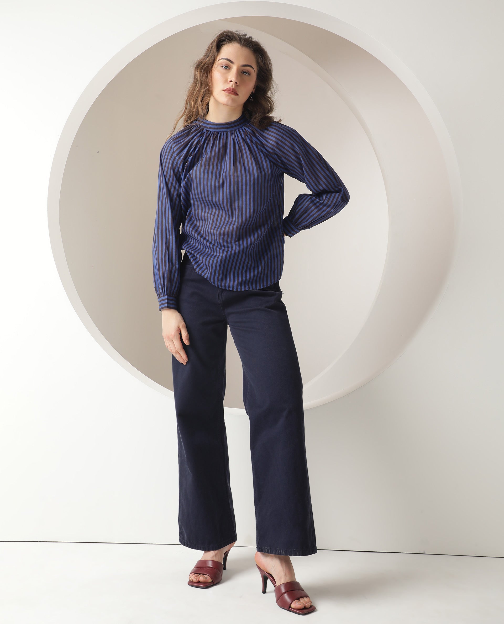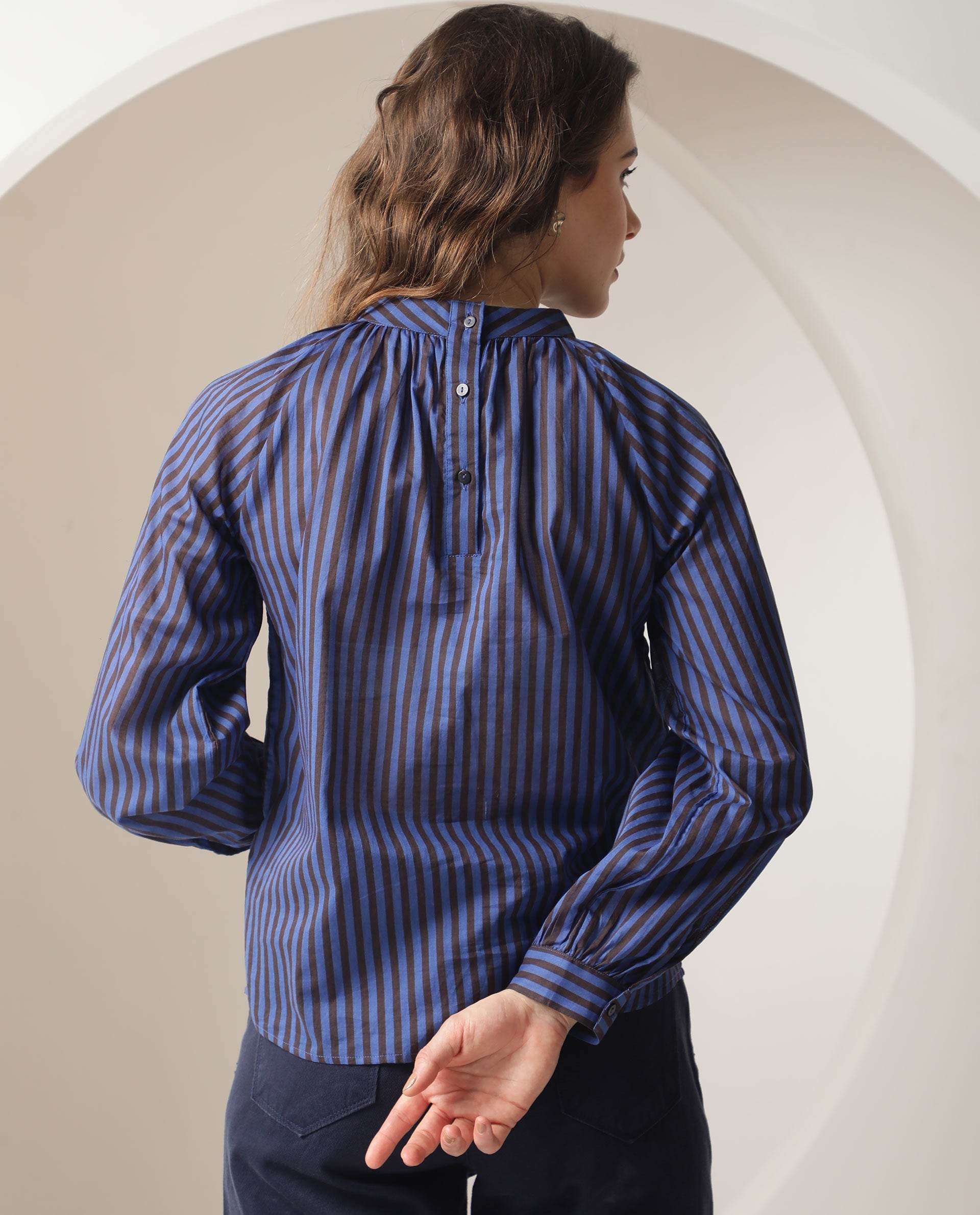 Unwind in style with our Relaxed Fit Stripe Top, featuring a high band neck, full-volume sleeves, and a back-buttoned closure for a blend of comfort and sophistication.