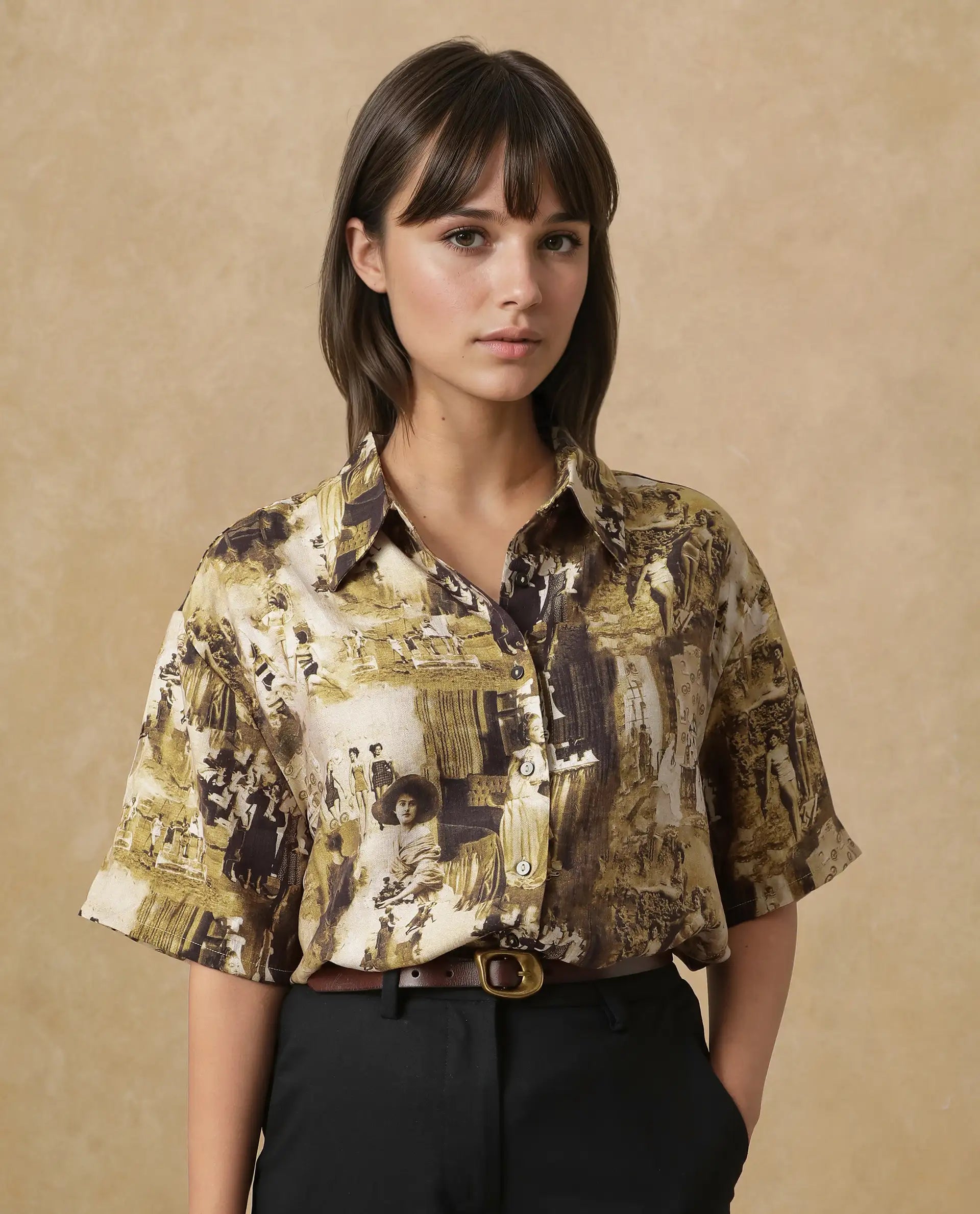 Elevate your casual wardrobe with this vintage printed half sleeve boxy shirt, perfect for women seeking a unique style statement. Featuring a collared neck and button closure, this top offers a comfortable boxy fit ideal for everyday wear. The woven fabric showcases an intriguing object print, adding a touch of retro charm to your ensemble. Designed for versatility, this shirt pairs effortlessly with various bottoms, making it a must-have for fashion-forward individuals. Embrace the latest trend in casual fashion with this distinctive piece, ensuring you stand out in any crowd.