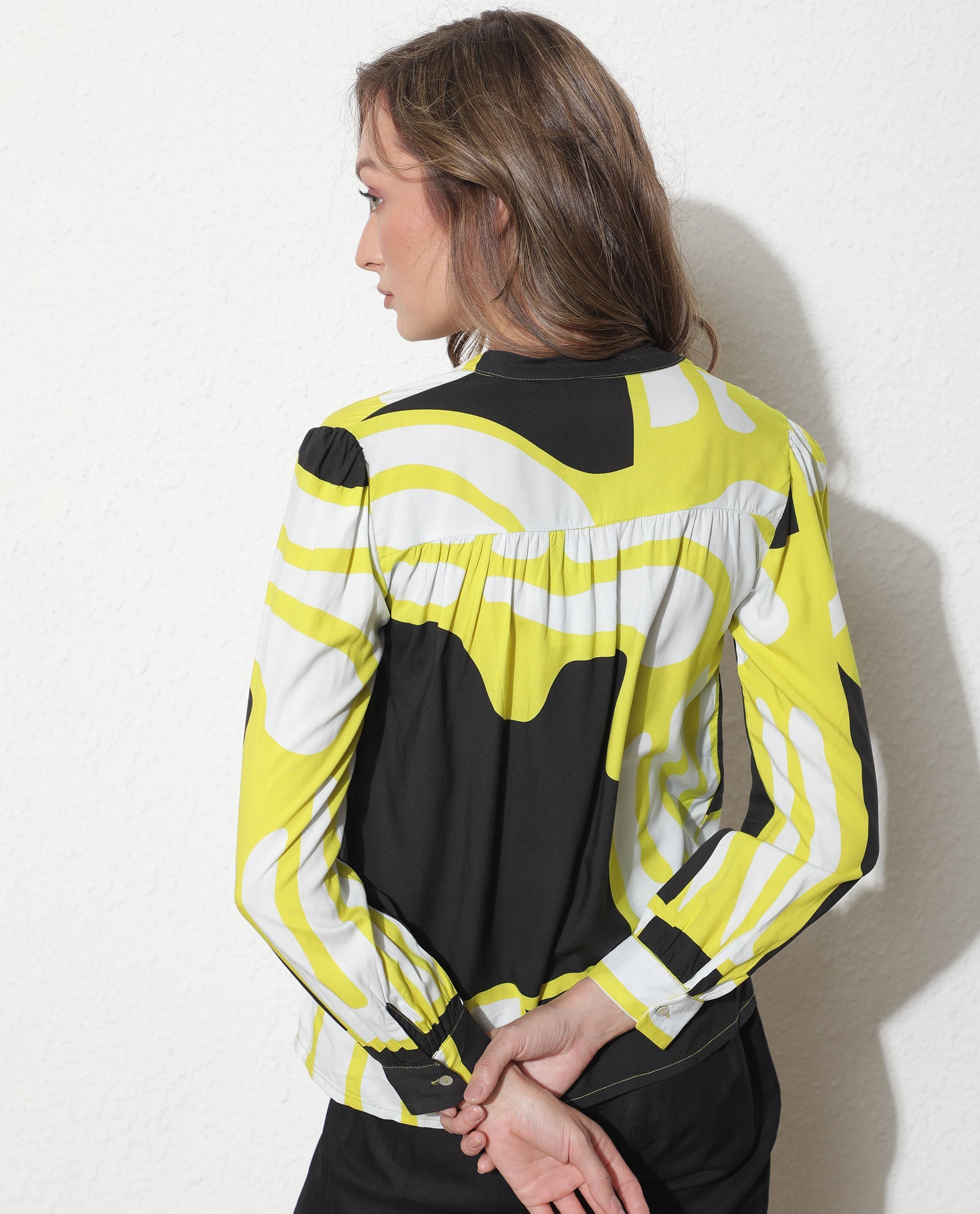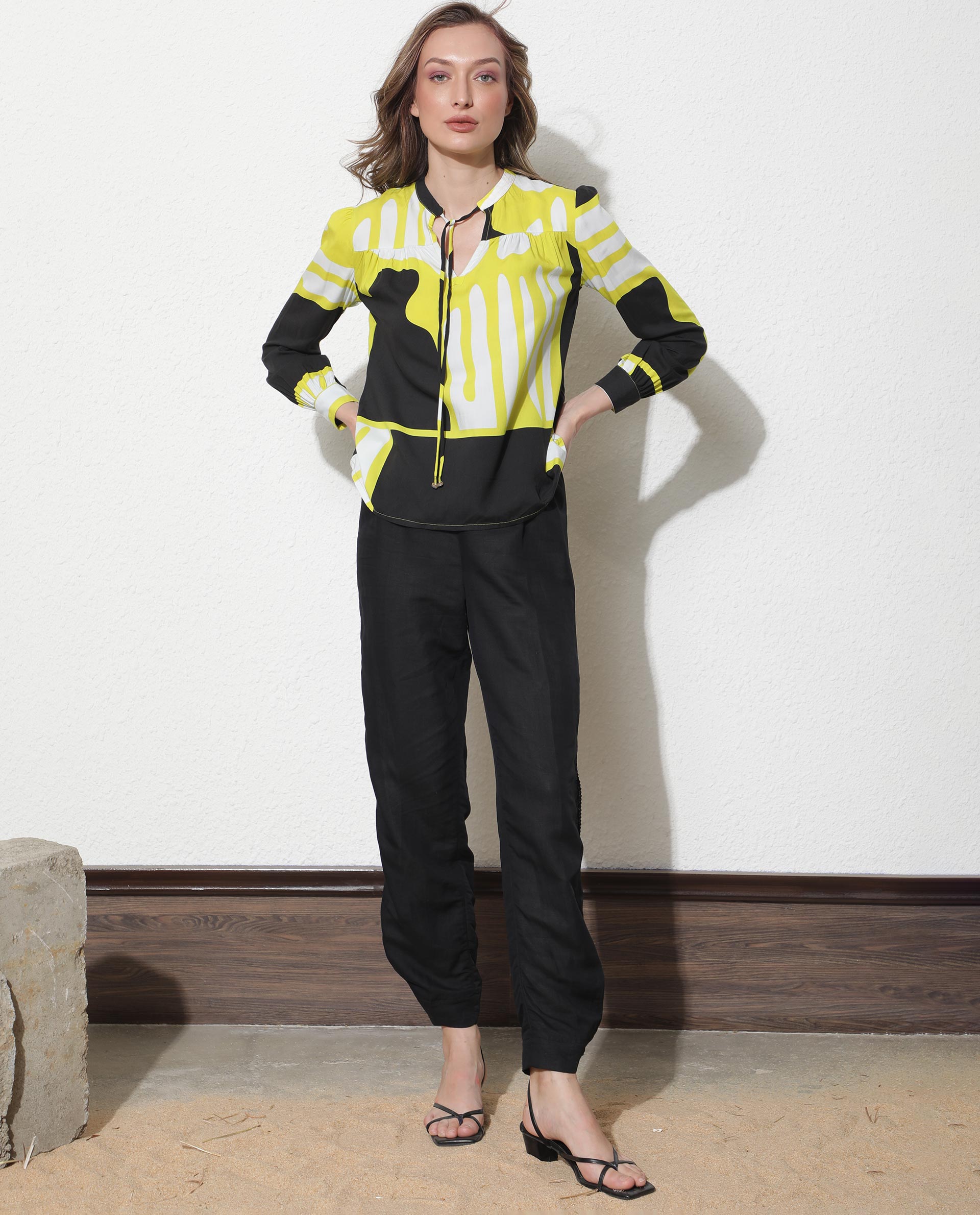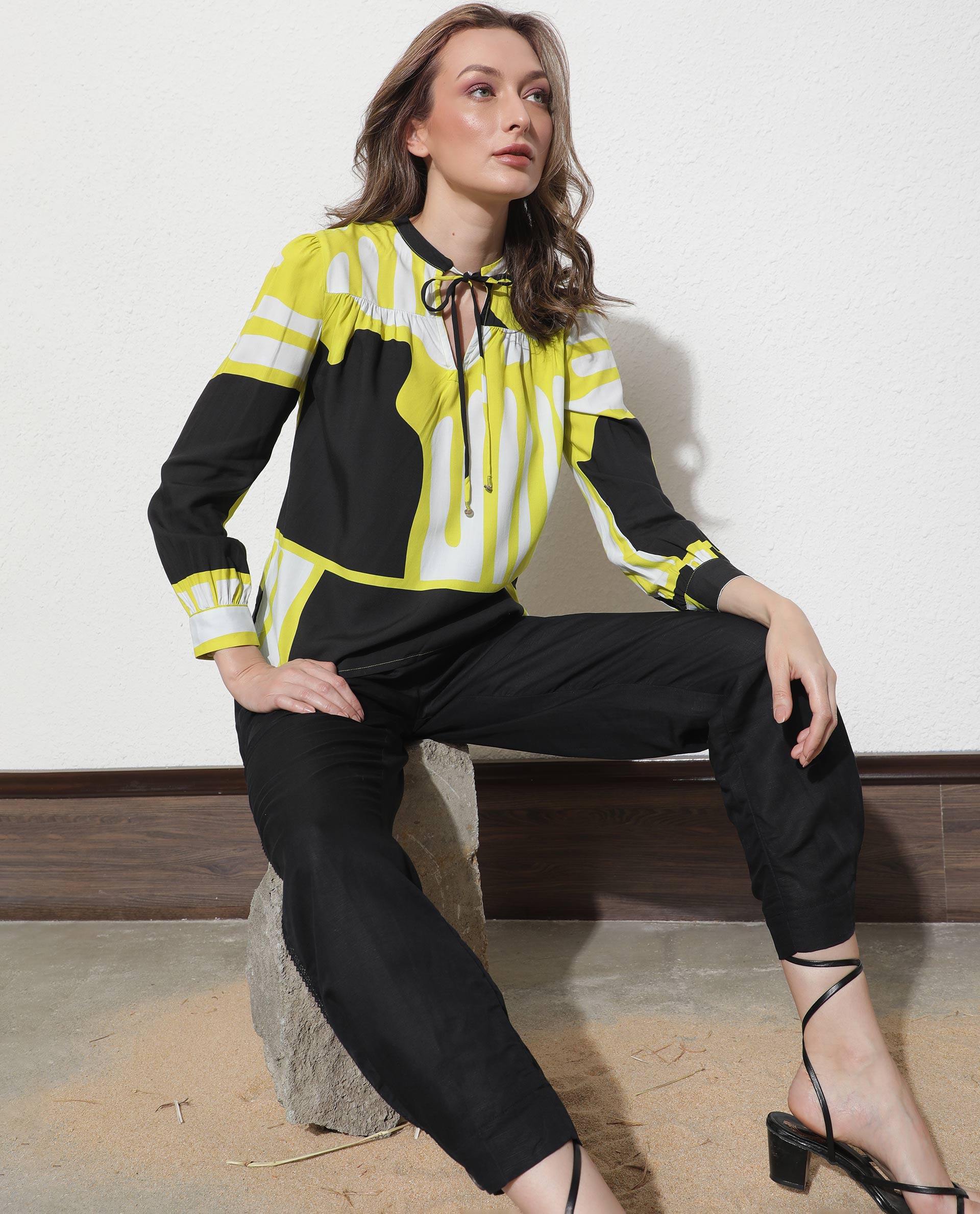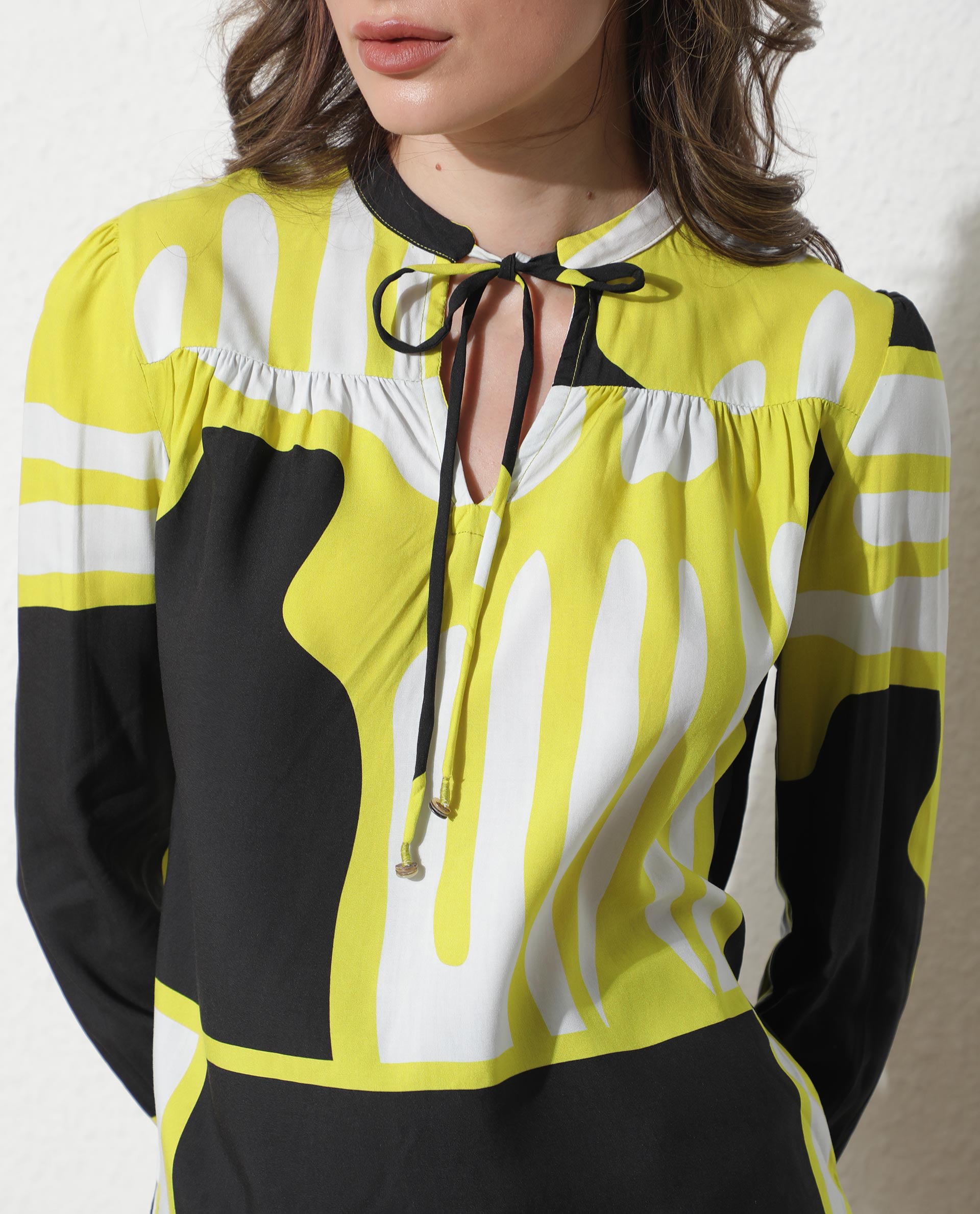 Rareism Women Vito Navy Viscose Fabric Slim Fit Key Hole Neck Full Sleeves Abstract Print Top