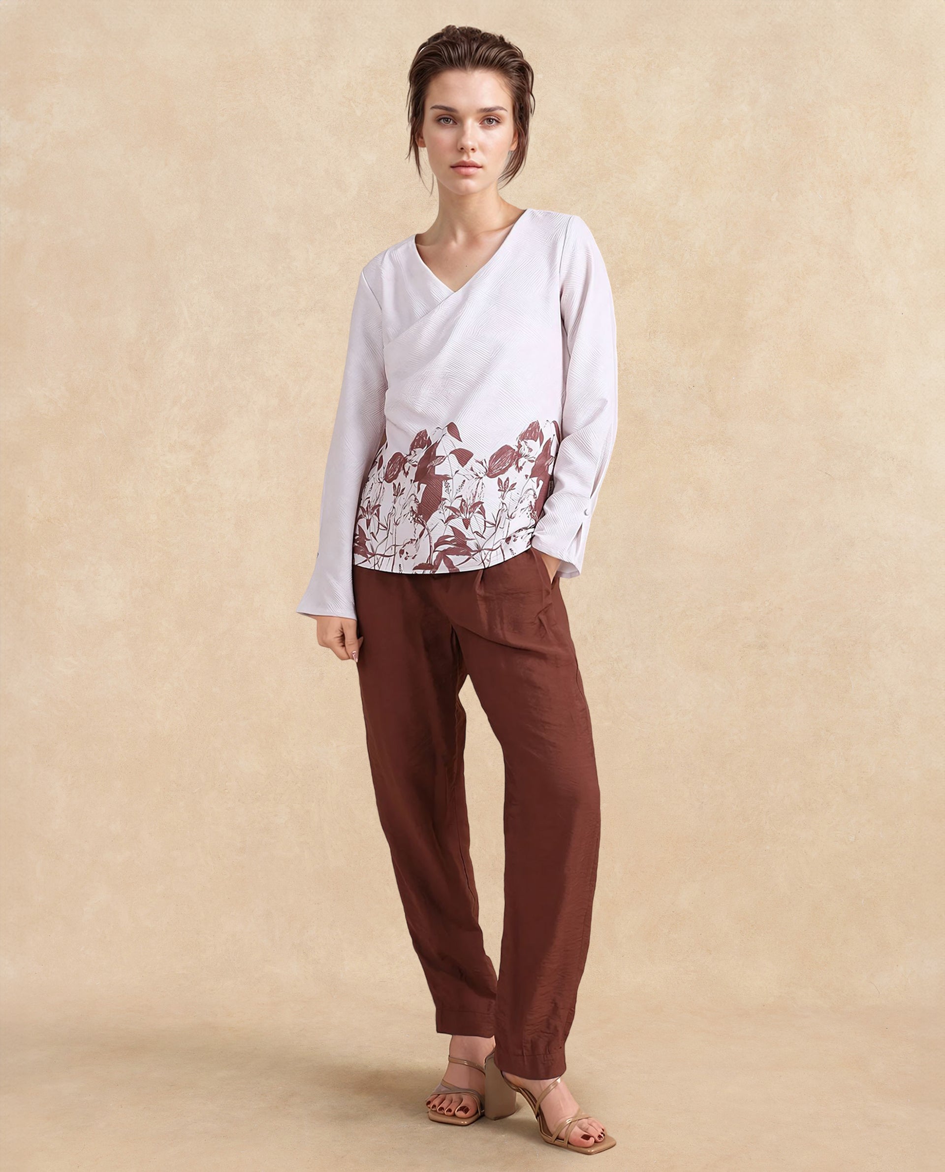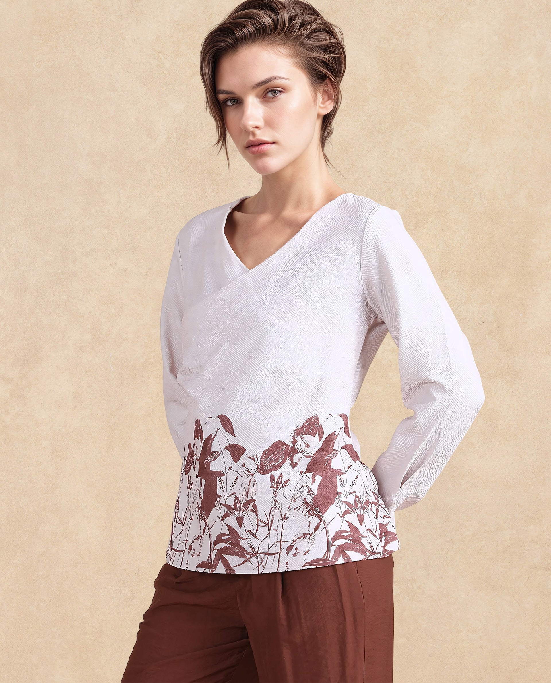 Rareism Women Whas Beige Polyester Fabric Full Sleeve V-Neck Button Closure Froral Print Top