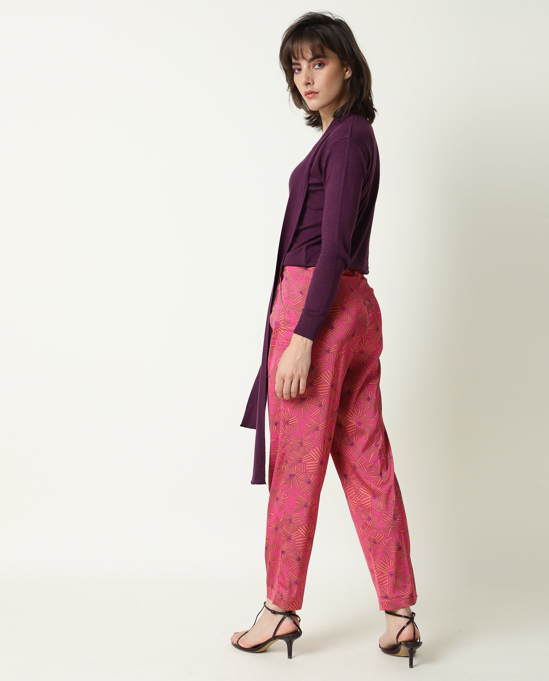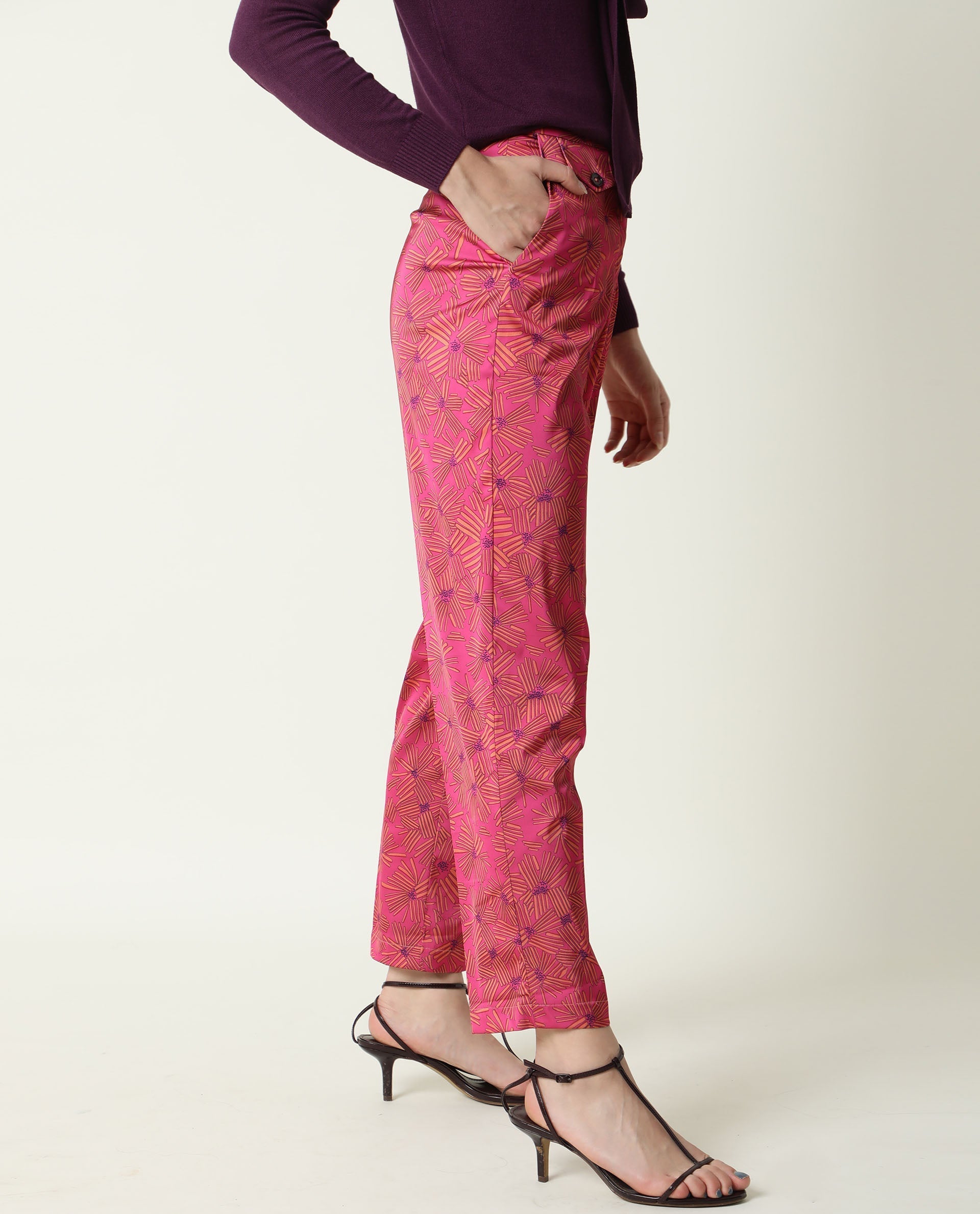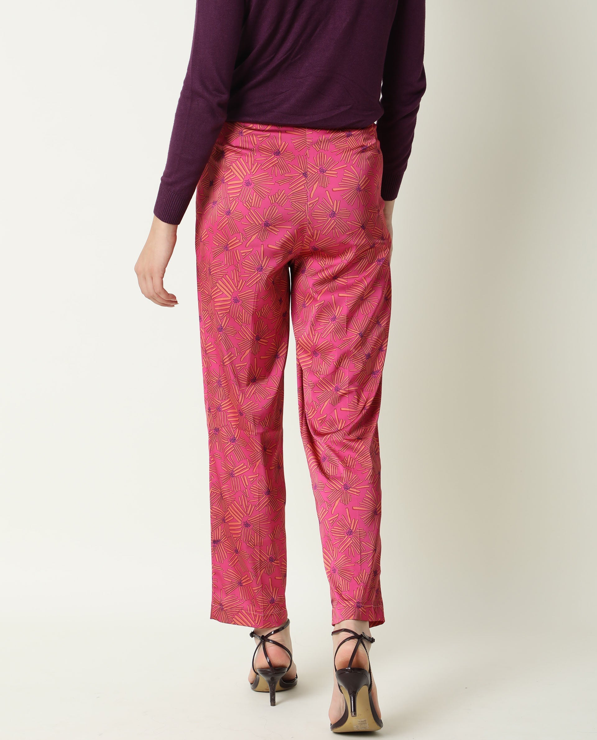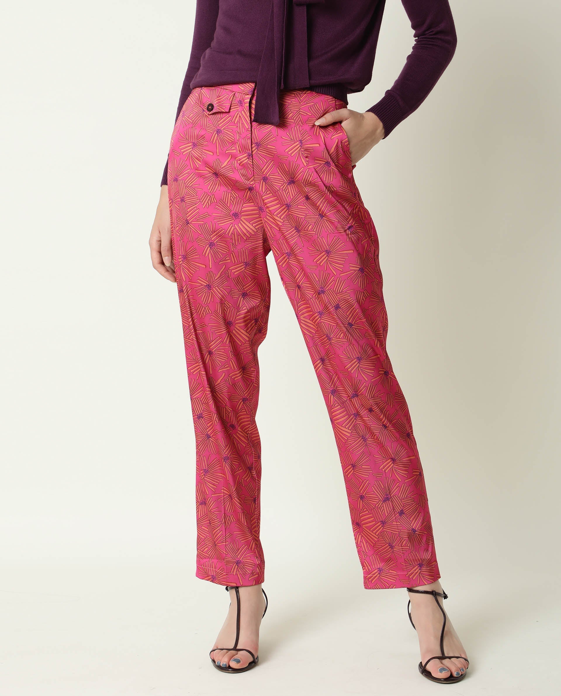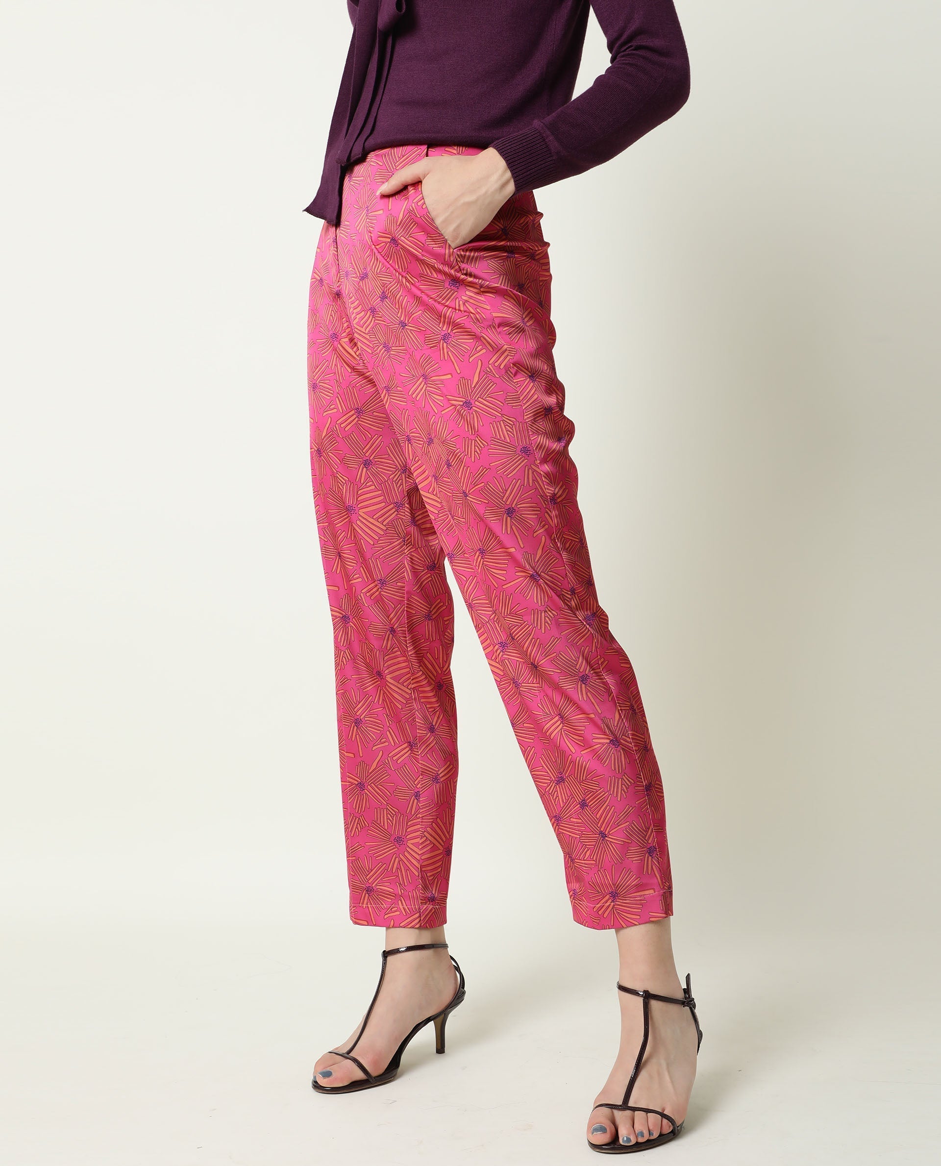 Rareism Women Catepil Flouroscent Pink Modal Fabric Tailored Fit Mid Rise Geometric Print Ankle Length Trousers