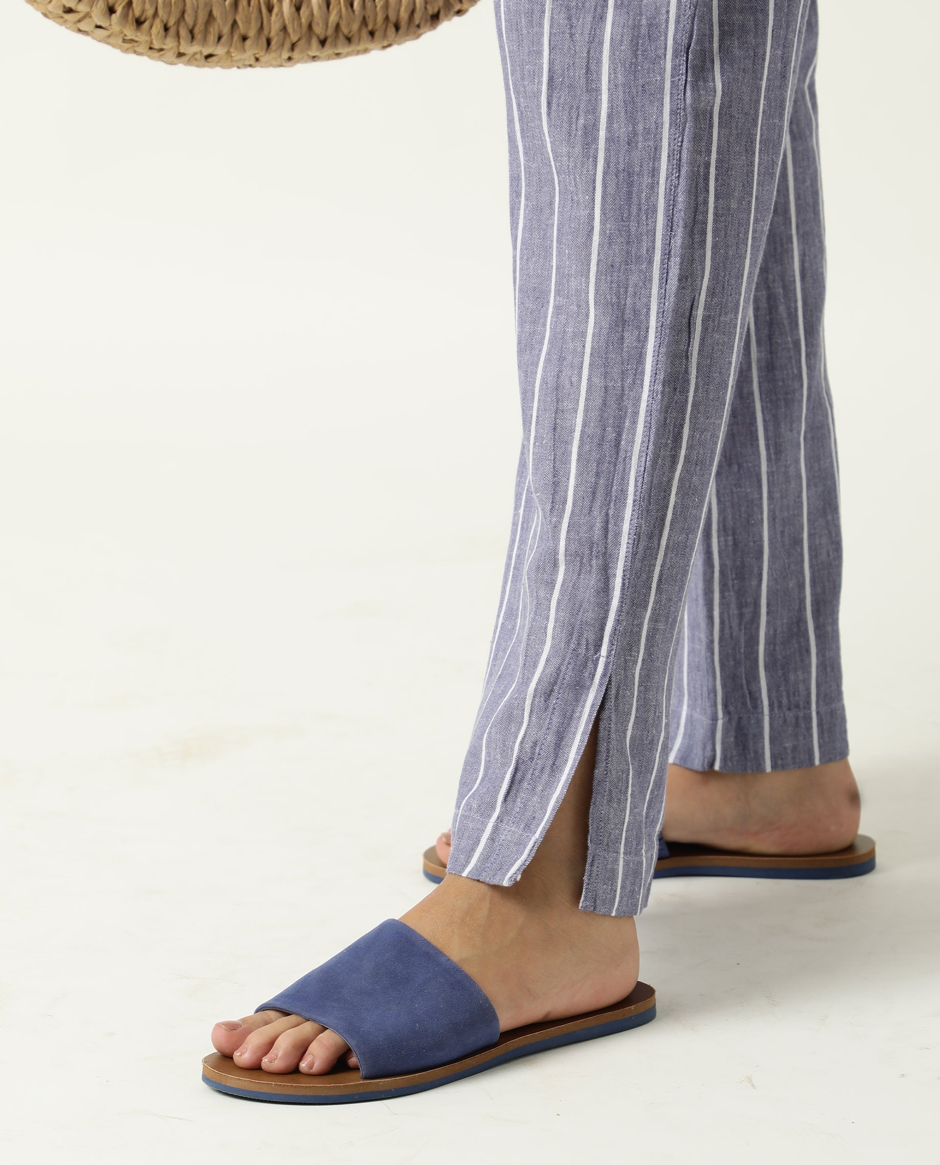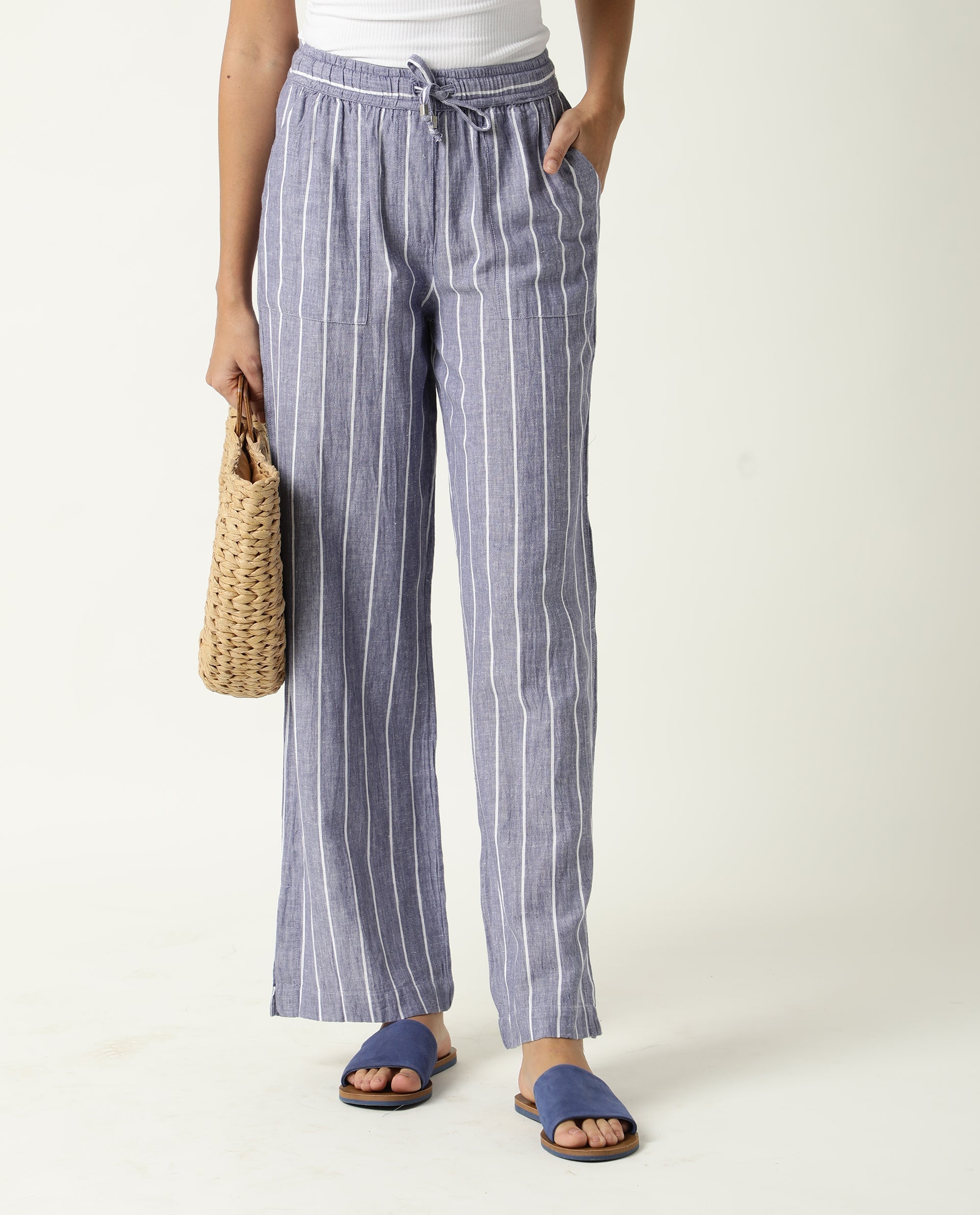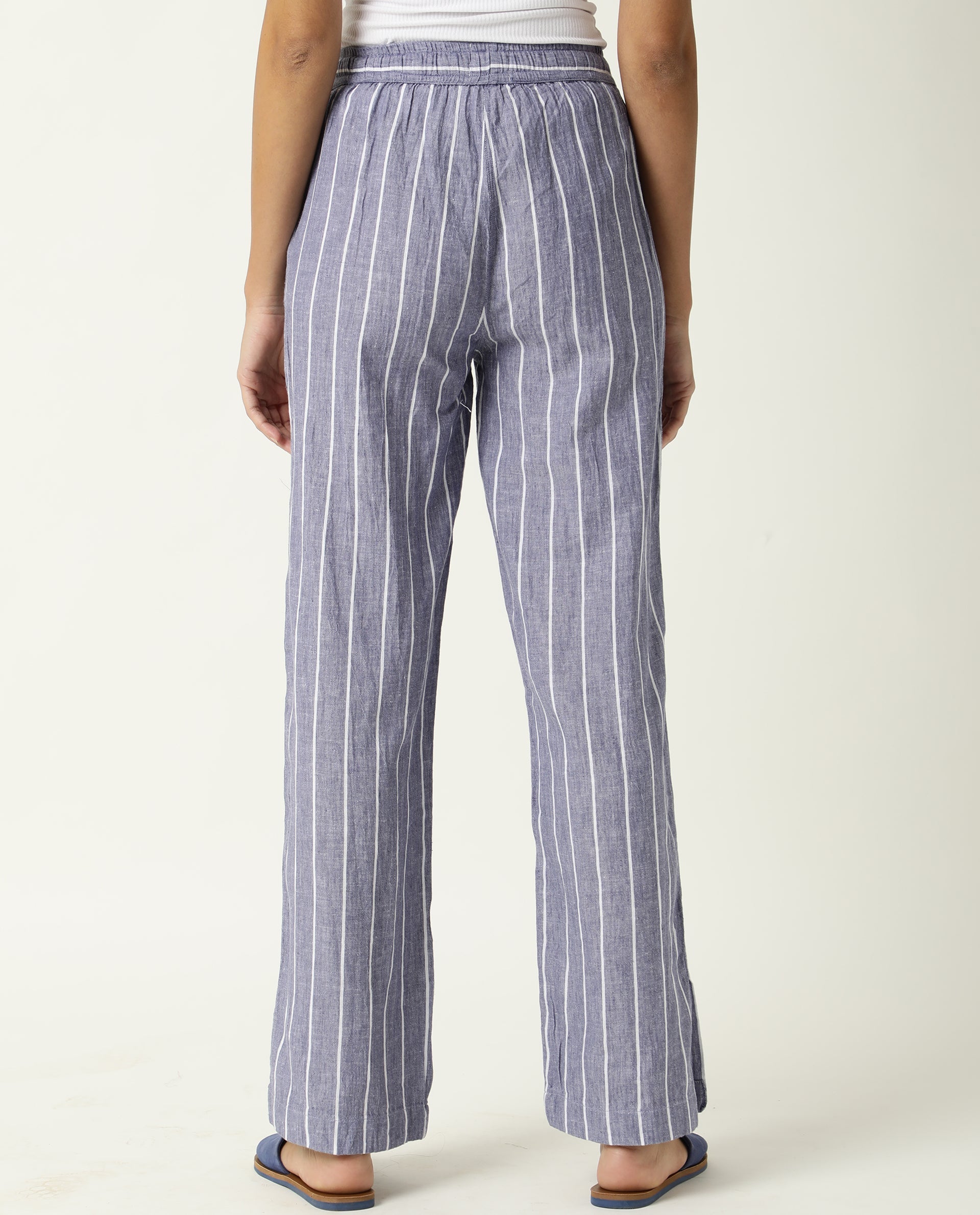 Rareism Women Helena Blue Cotton Linen Fabric Relaxed Fit Mid Rise Striped Ankle Length Trousers