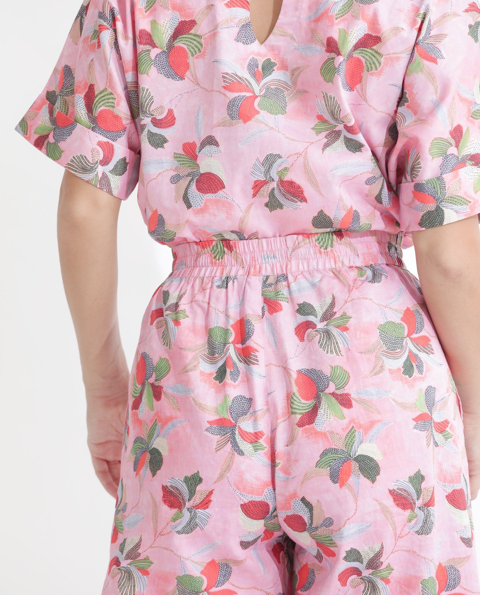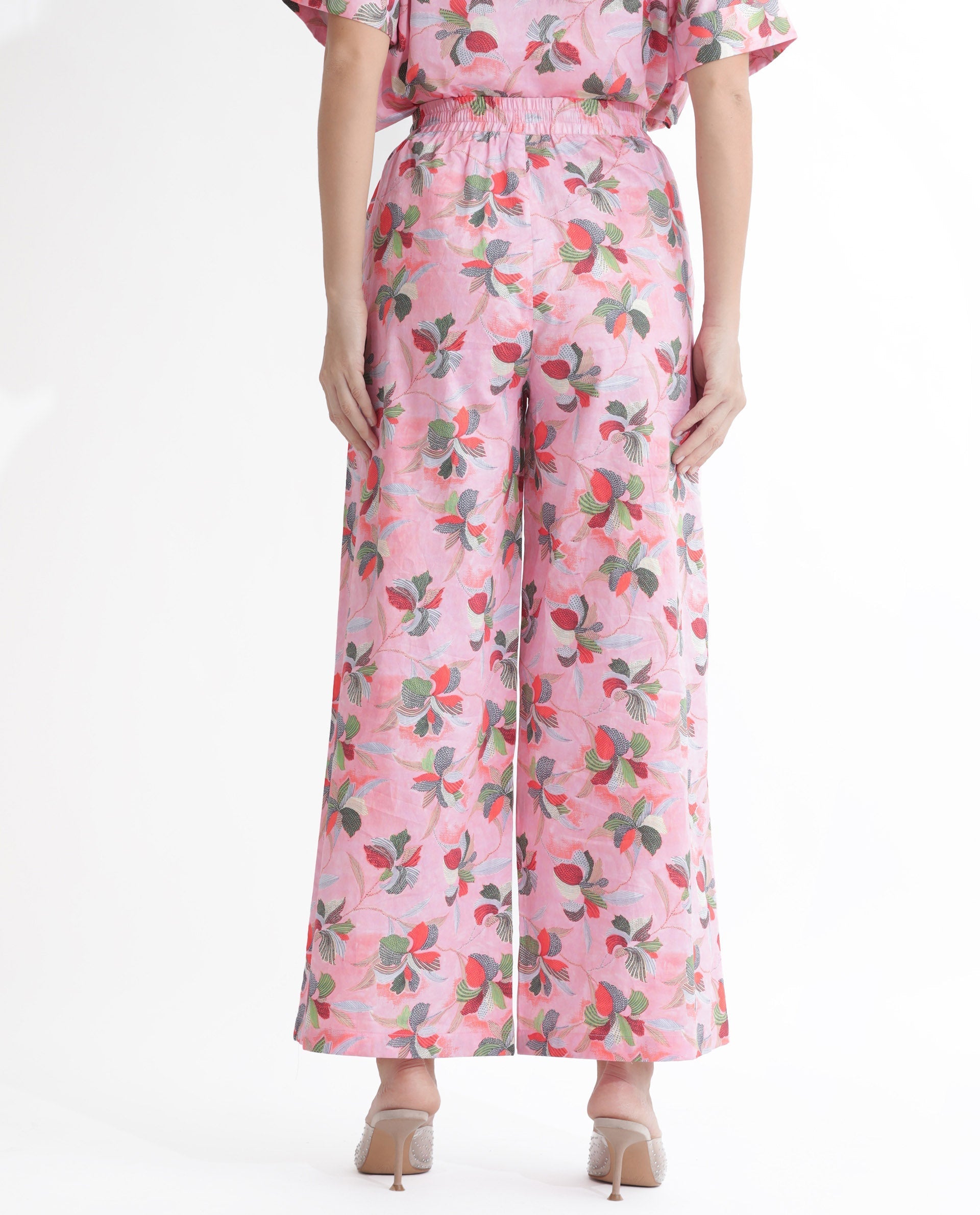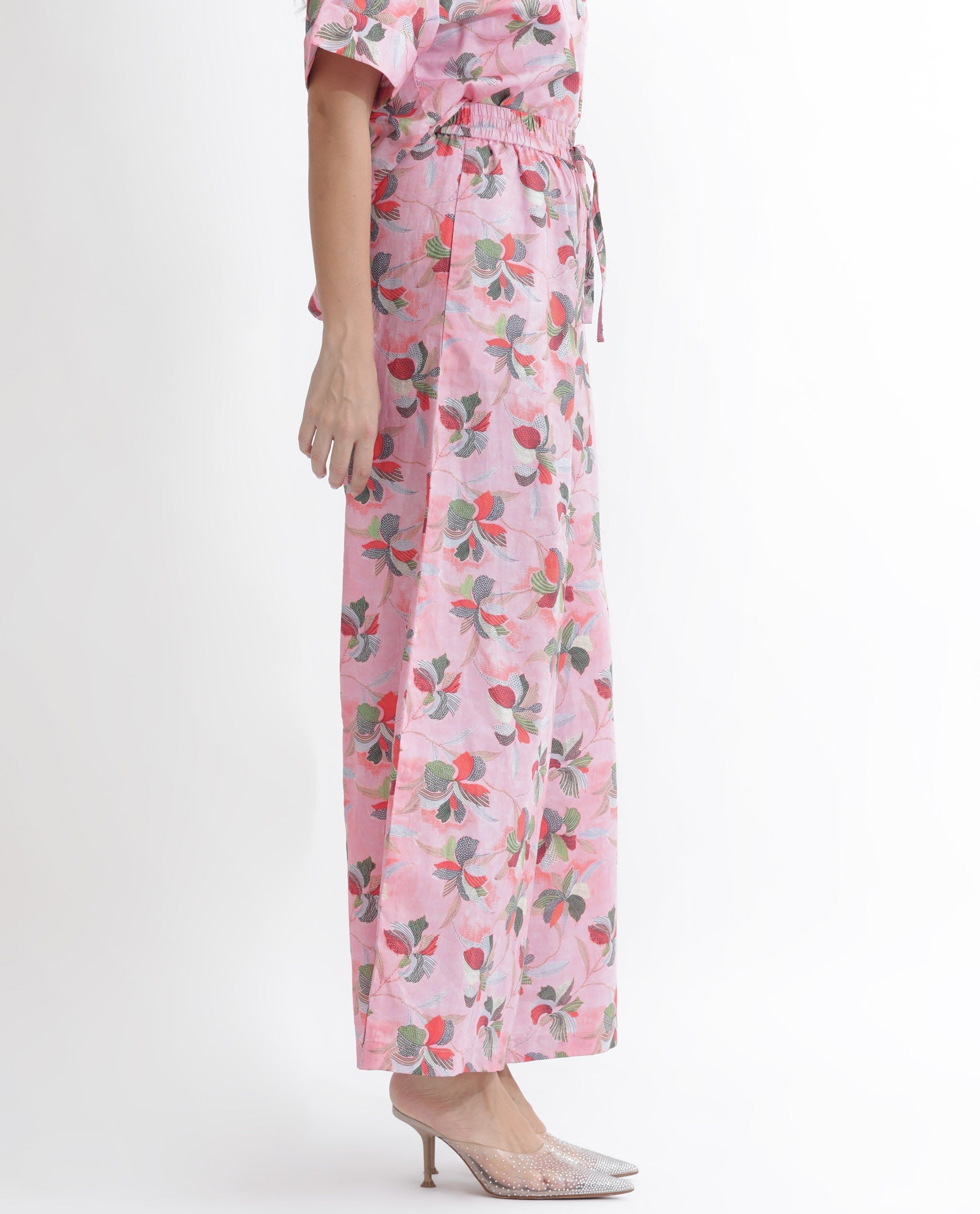 Rareism Women Kentoy-B Light Pink Cotton Fabric Drawstring Closure Flared Fit Floral Print Ankle Length Trousers