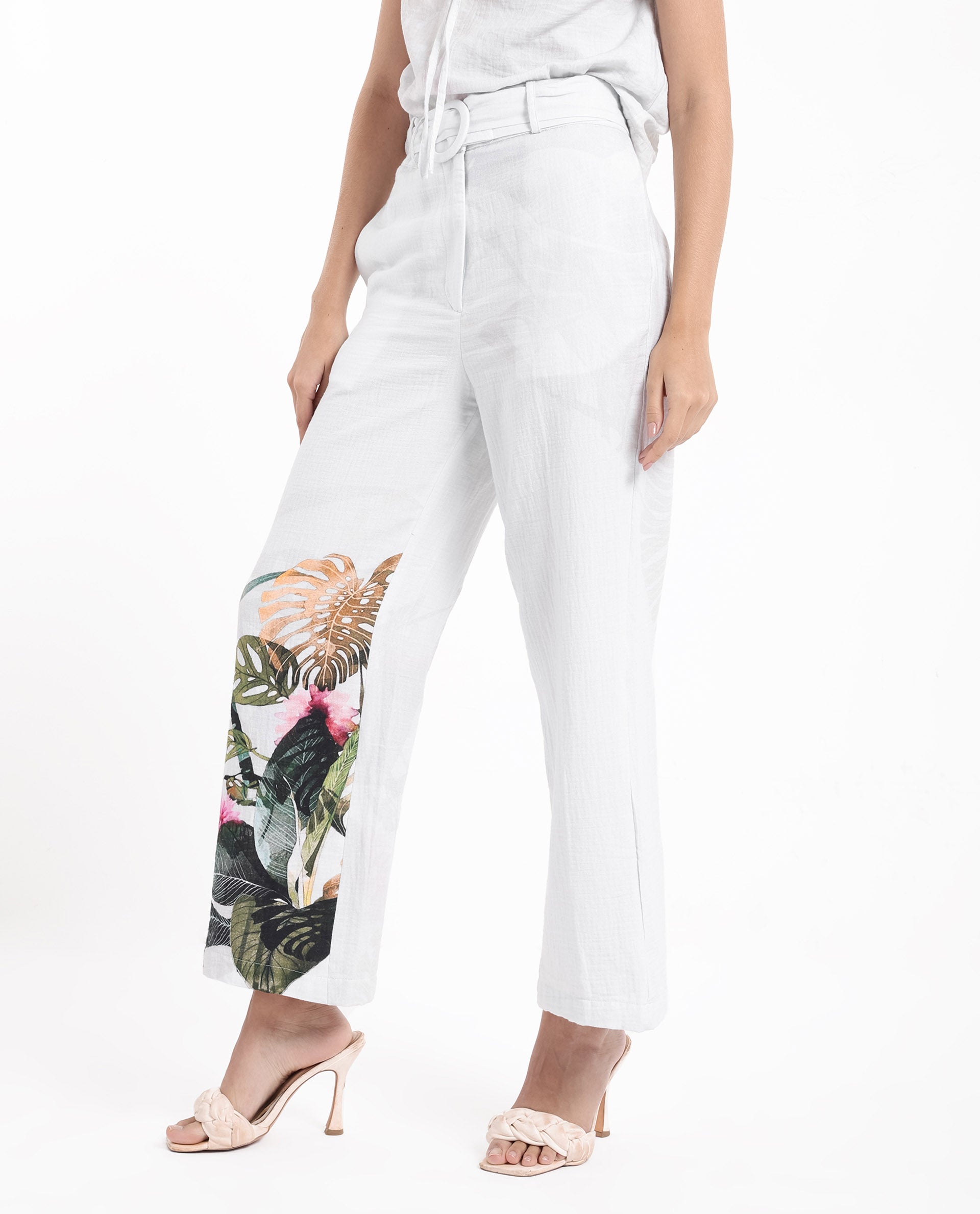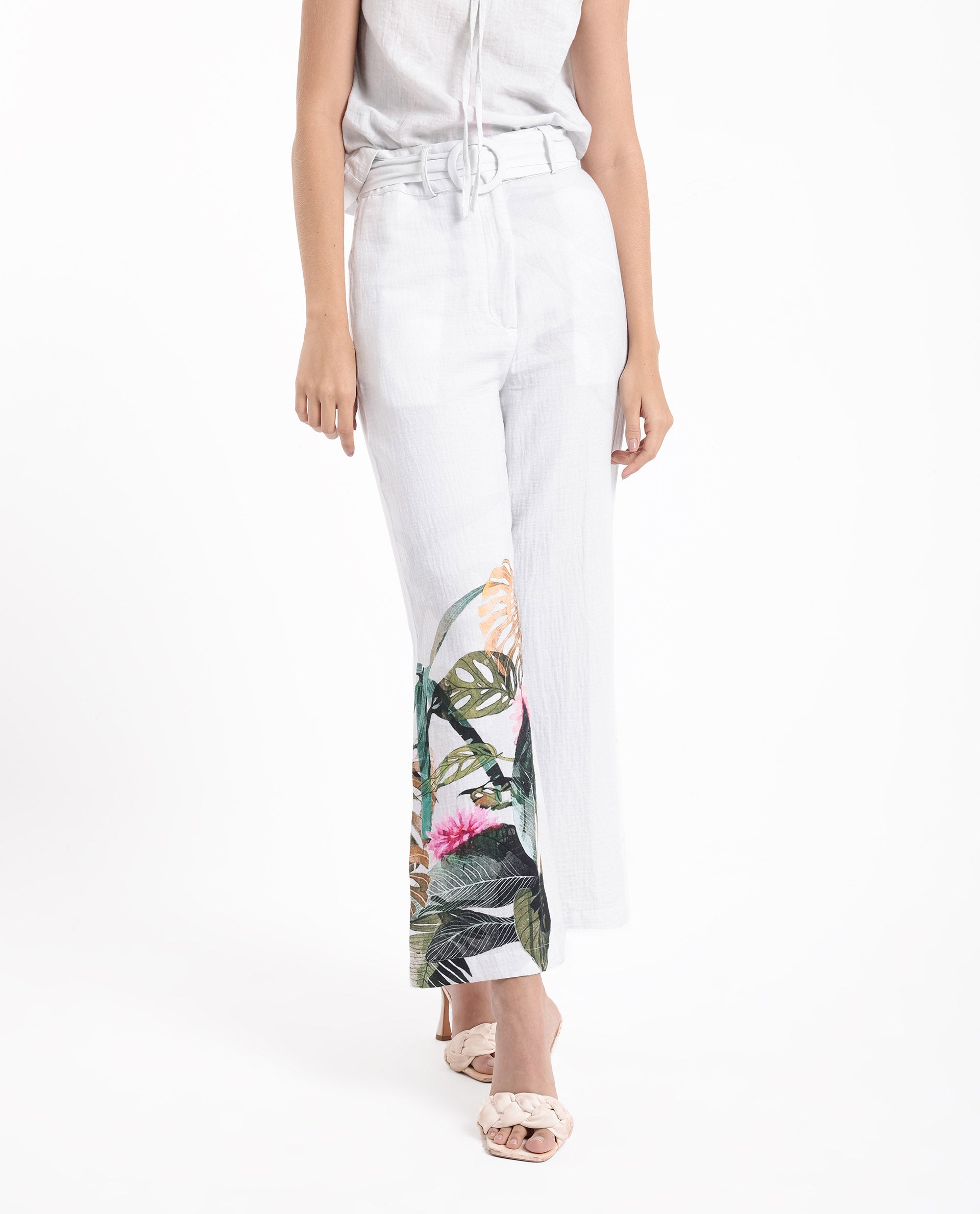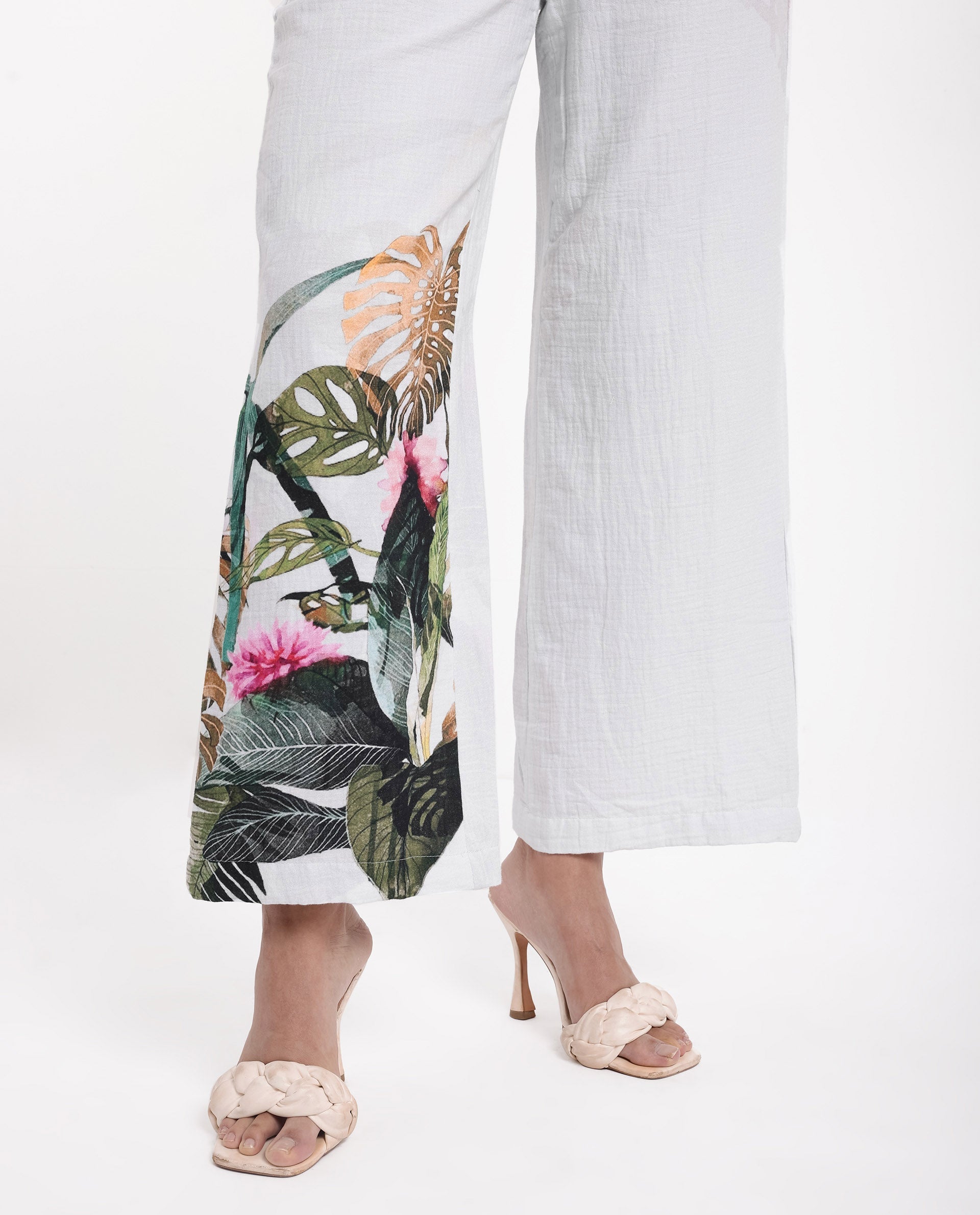 Rareism Women Yarani Off White Zipper Wide Fit Tropical Print Ankle Length Trouser