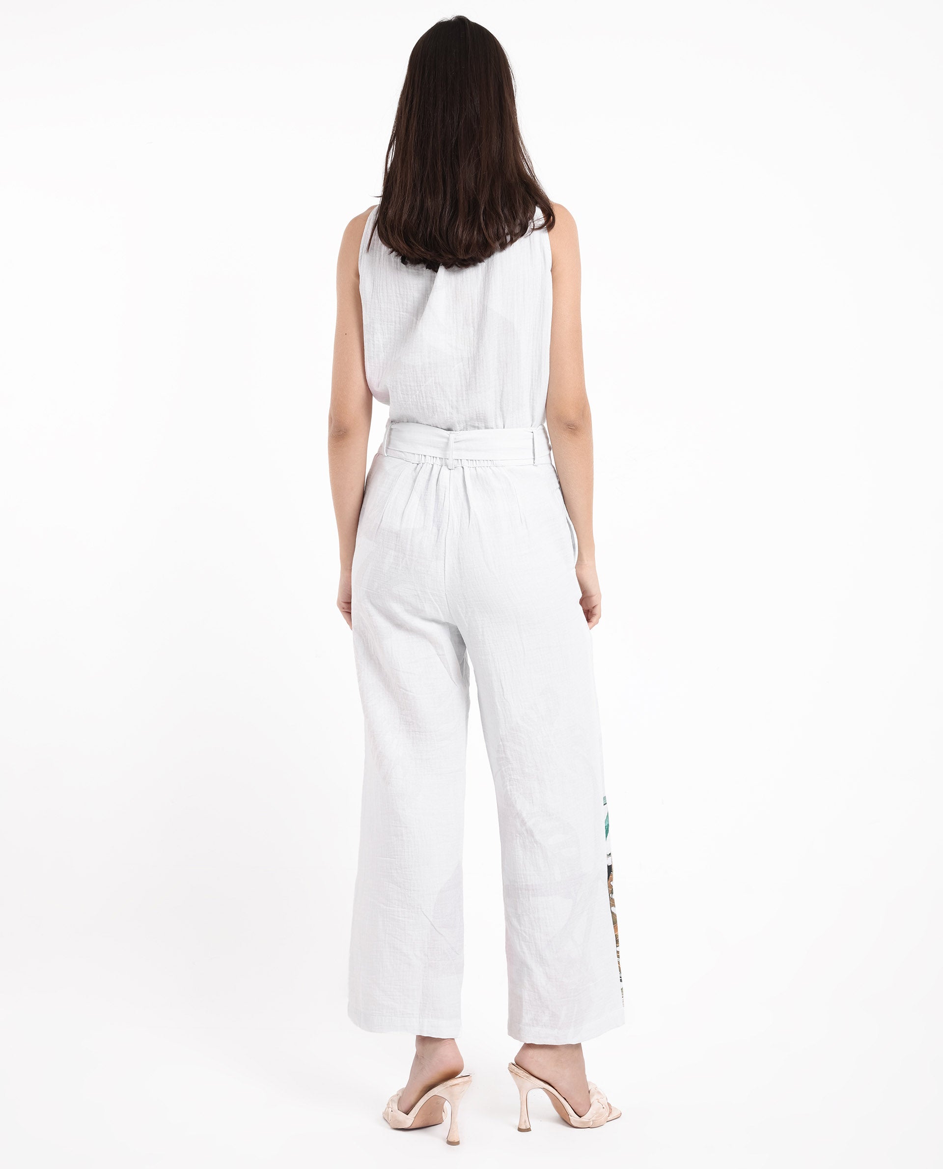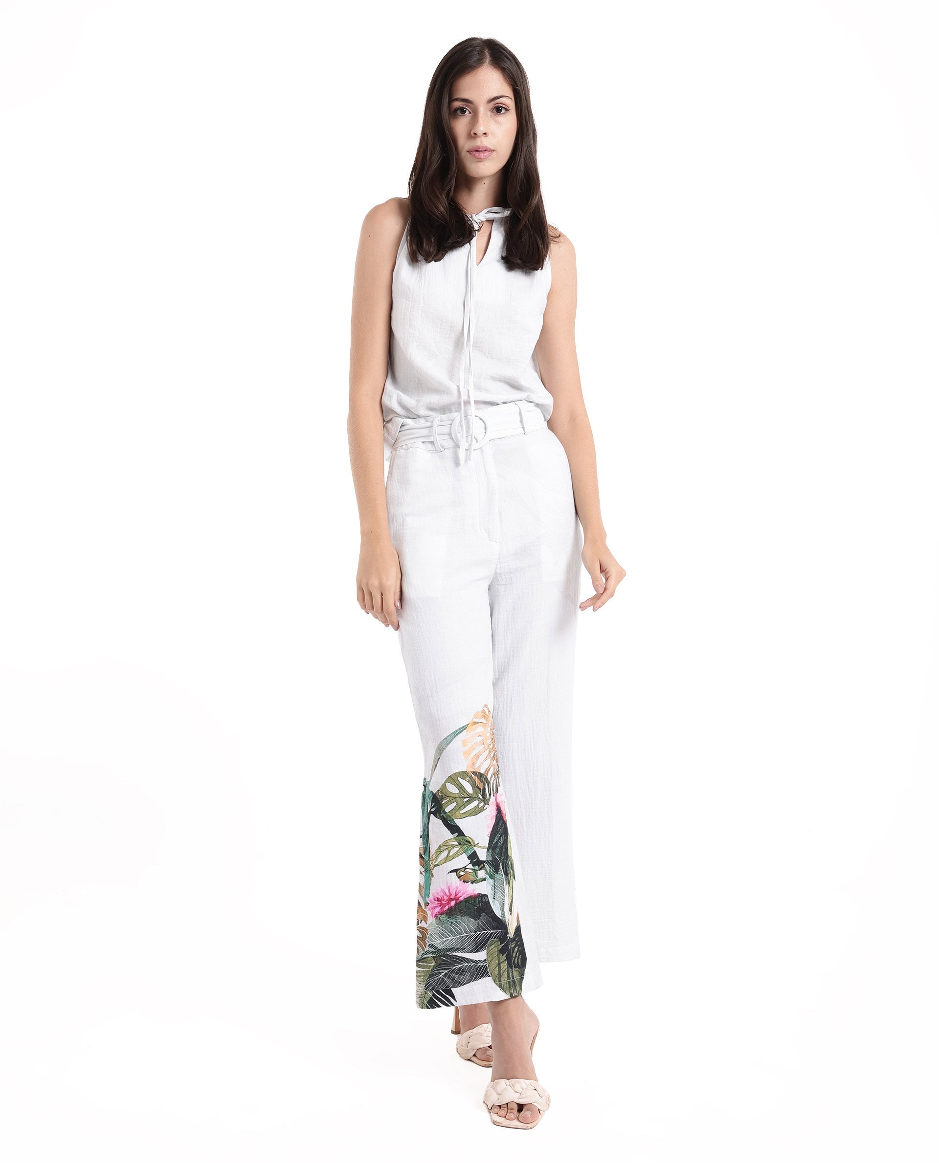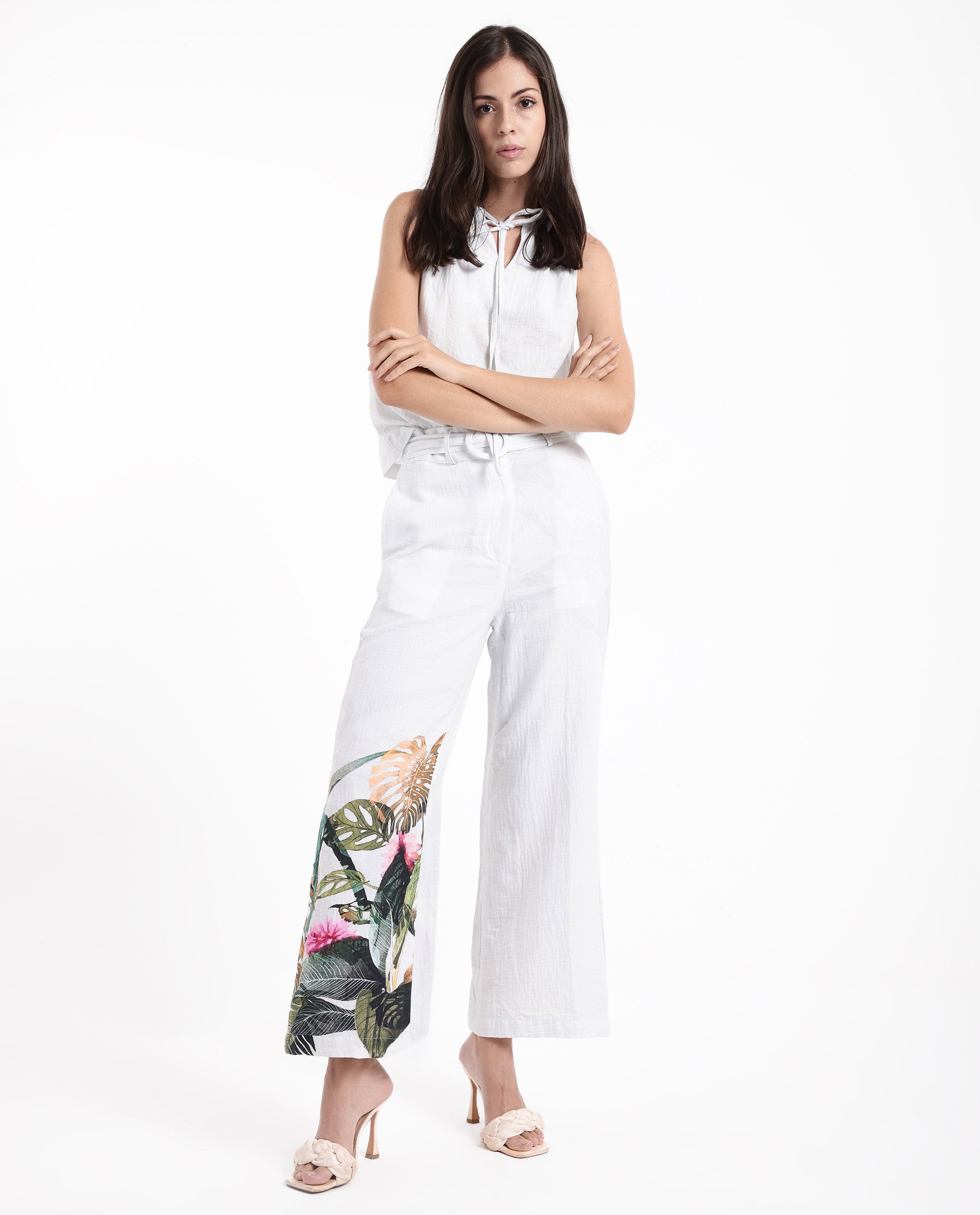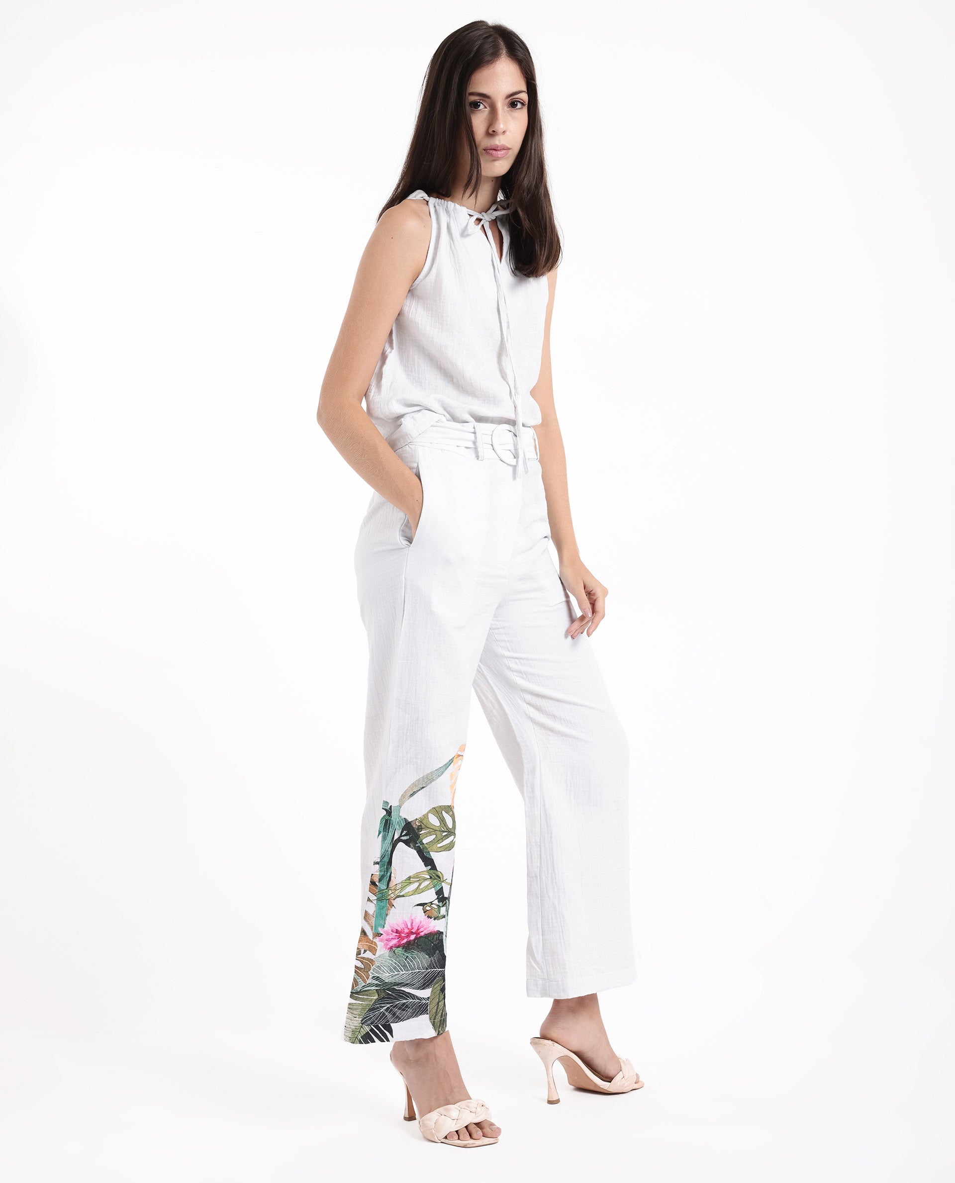 Rareism Women Yarani Off White Zipper Wide Fit Tropical Print Ankle Length Trouser