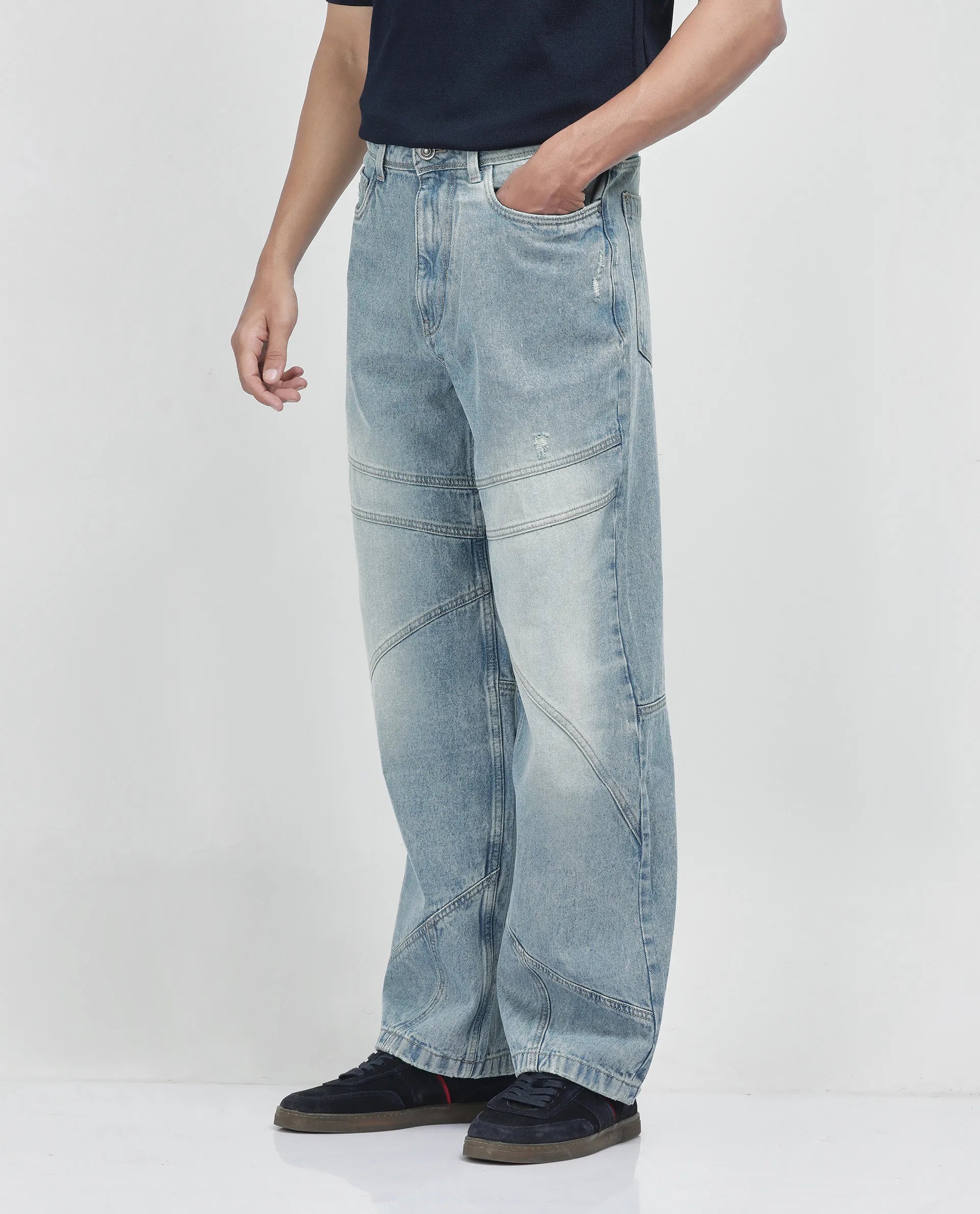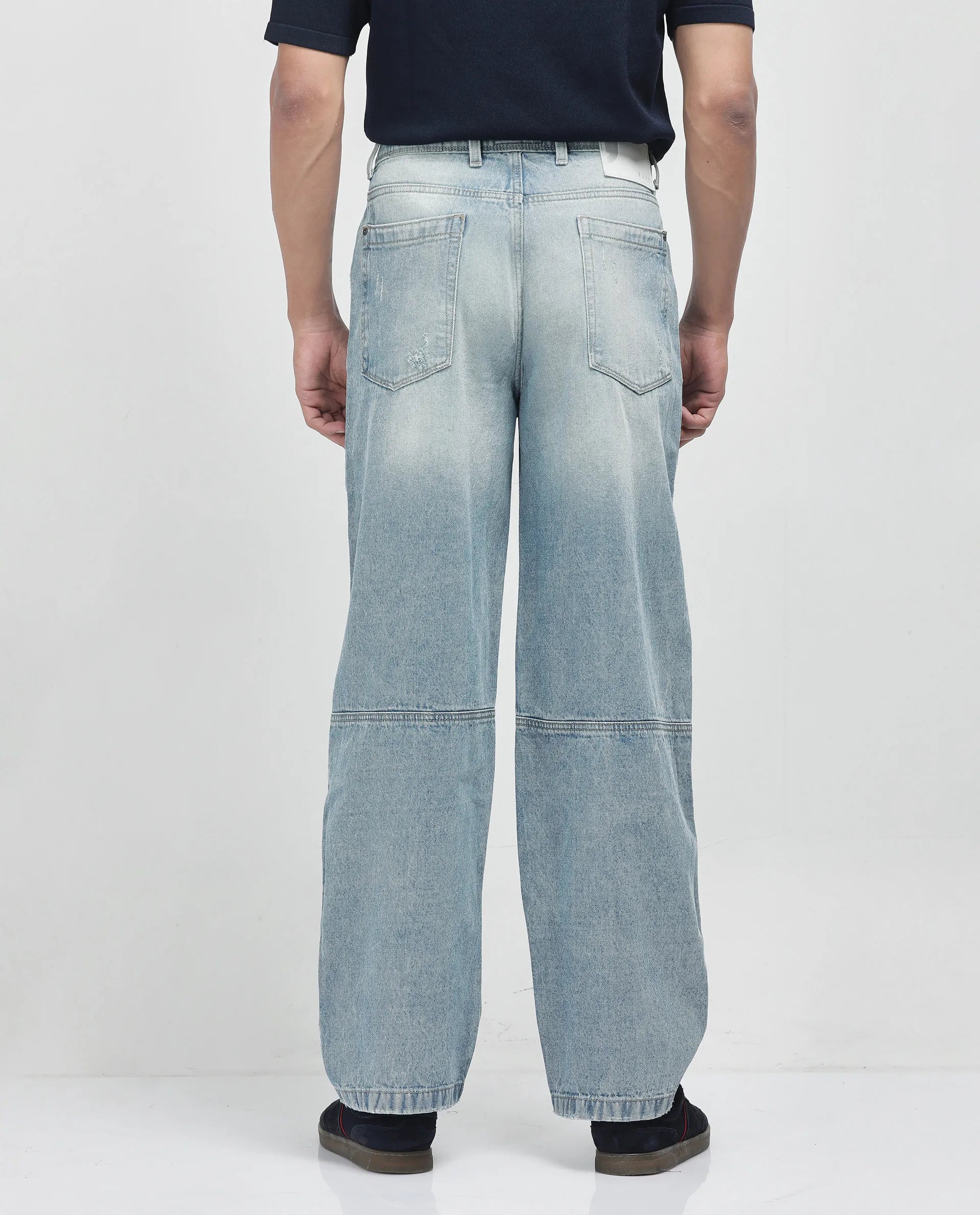 Rare Rabbit Men's Zeret Pastel Blue Cotton Fabric Button And Zip Closure Baggy Loose Fit Plain Jeans