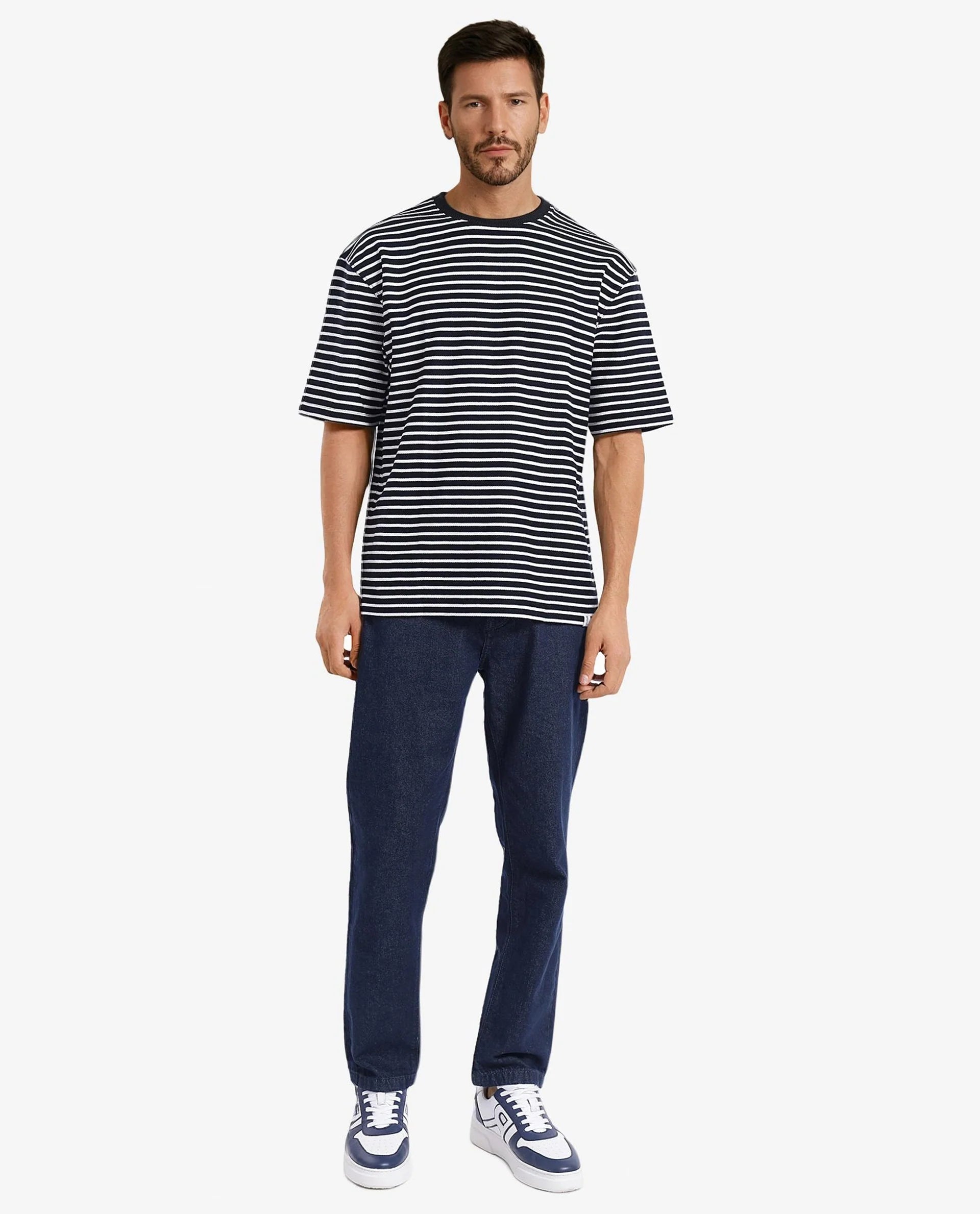 Rare Rabbit Articale Men's Paskot-1 Navy Cotton Fabric Short Sleeve Crew Neck Oversized Fit Narrow Stripes T-Shirt