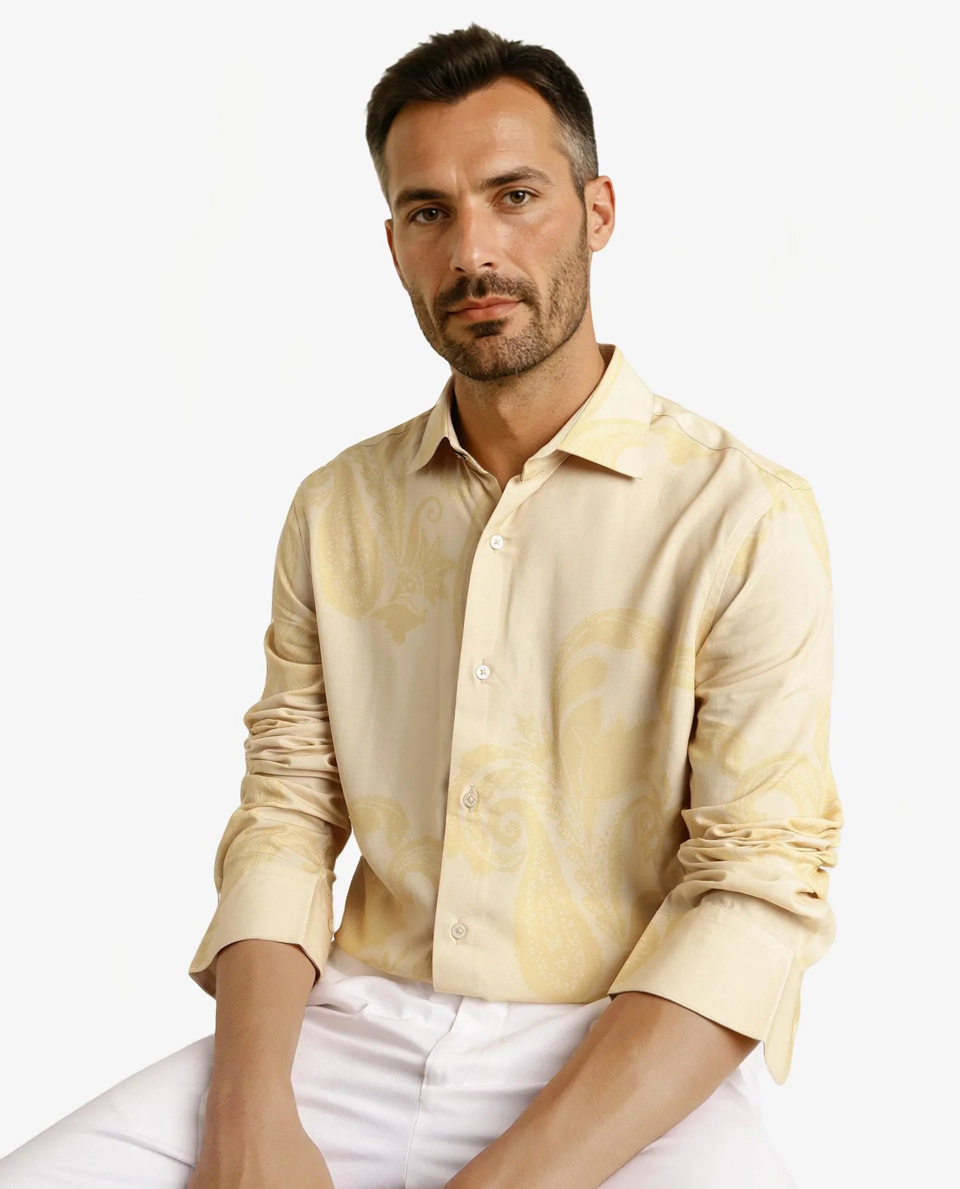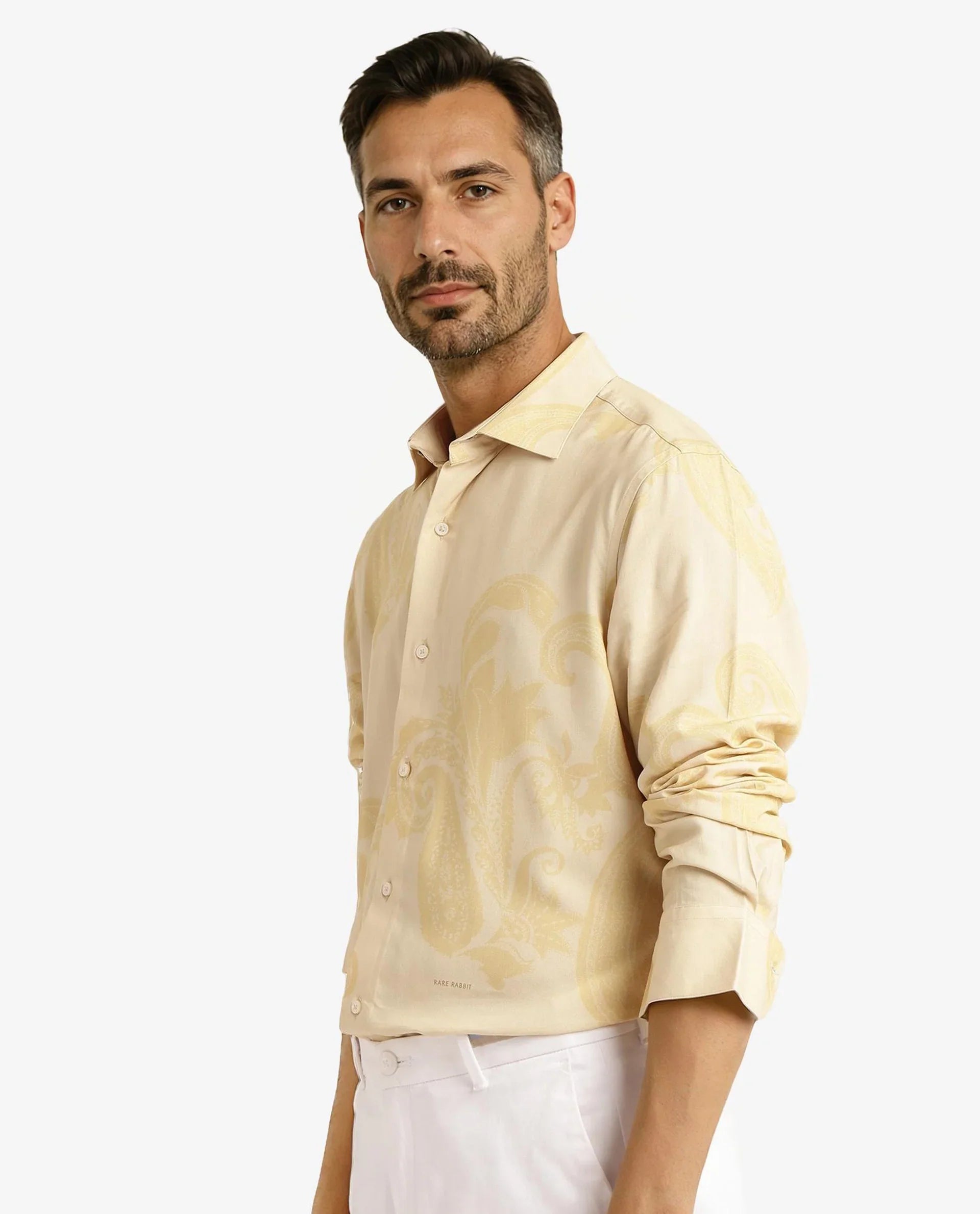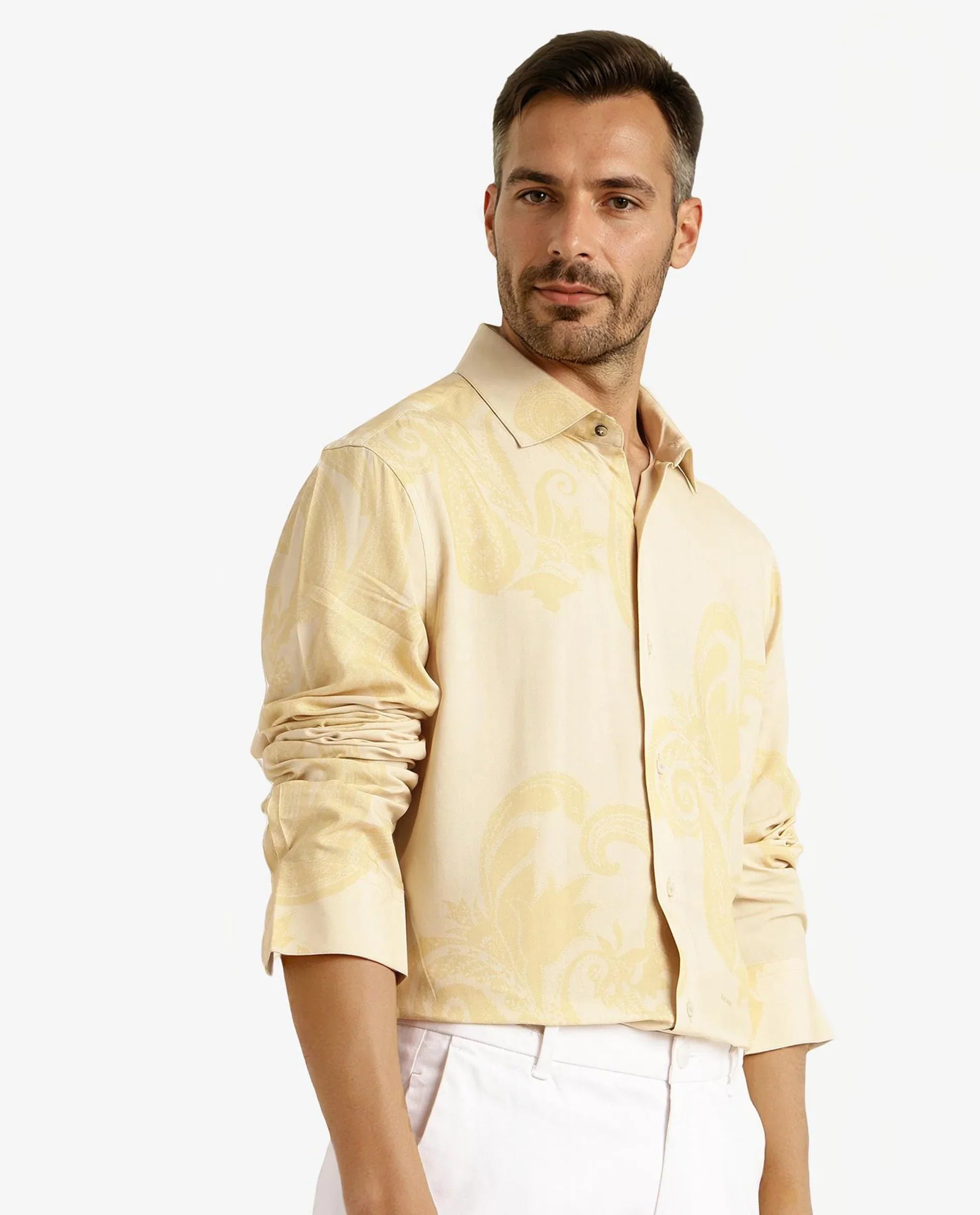 Rare Rabbit Men Koigi Dusky Yellow Viscose Fabric Full Sleeve Regular Paisley Printed Shirt