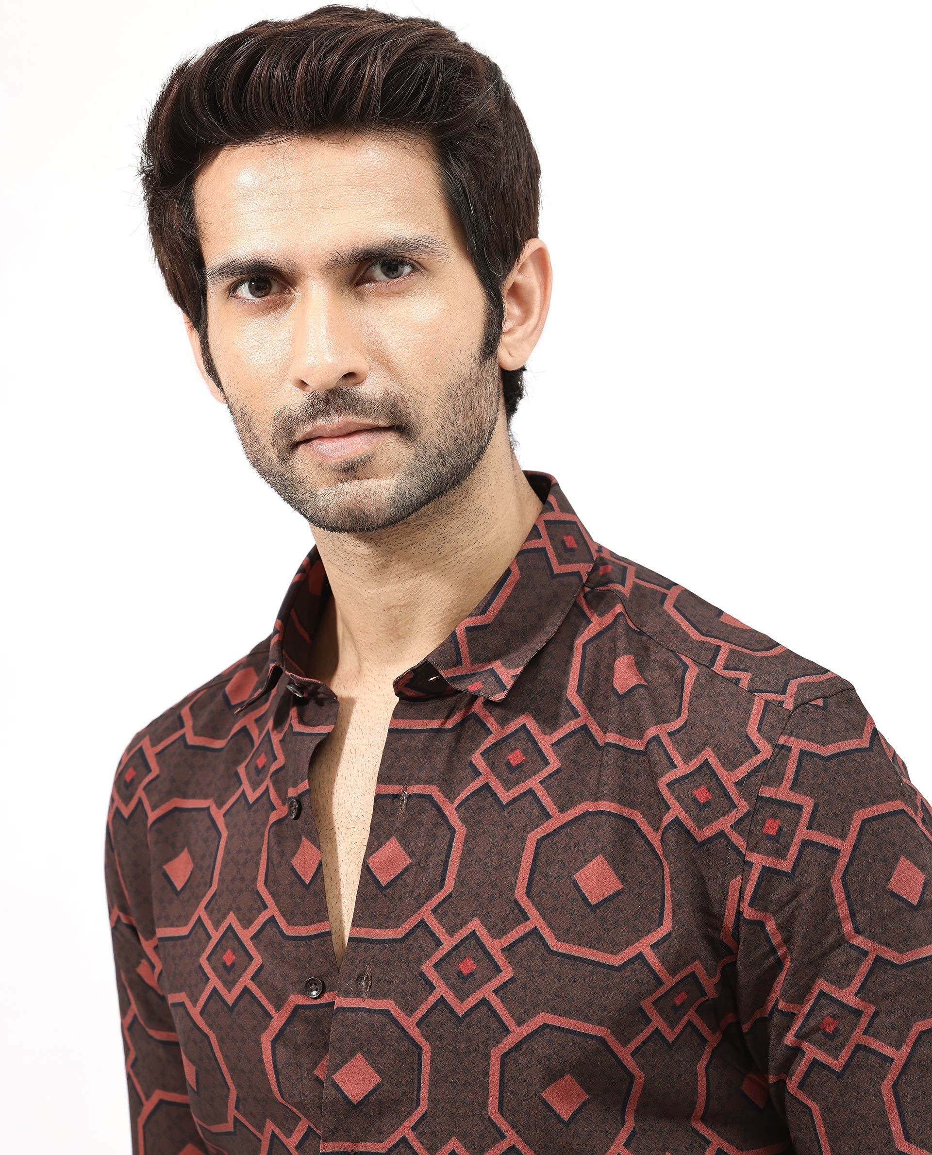 Rare Rabbit Mens Palmer Brown Full Sleeve Regular Collar Geometric Print Shirt