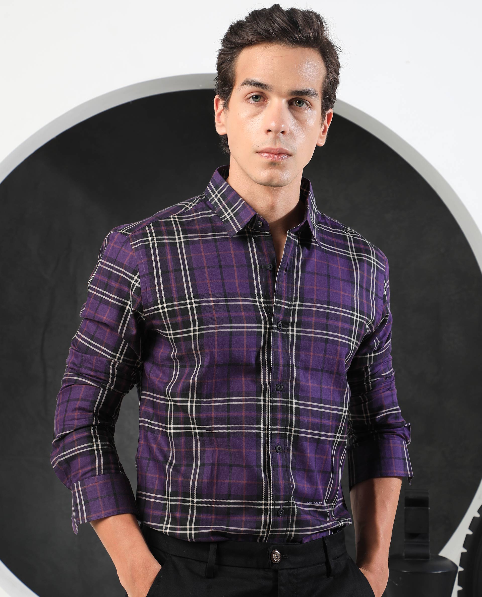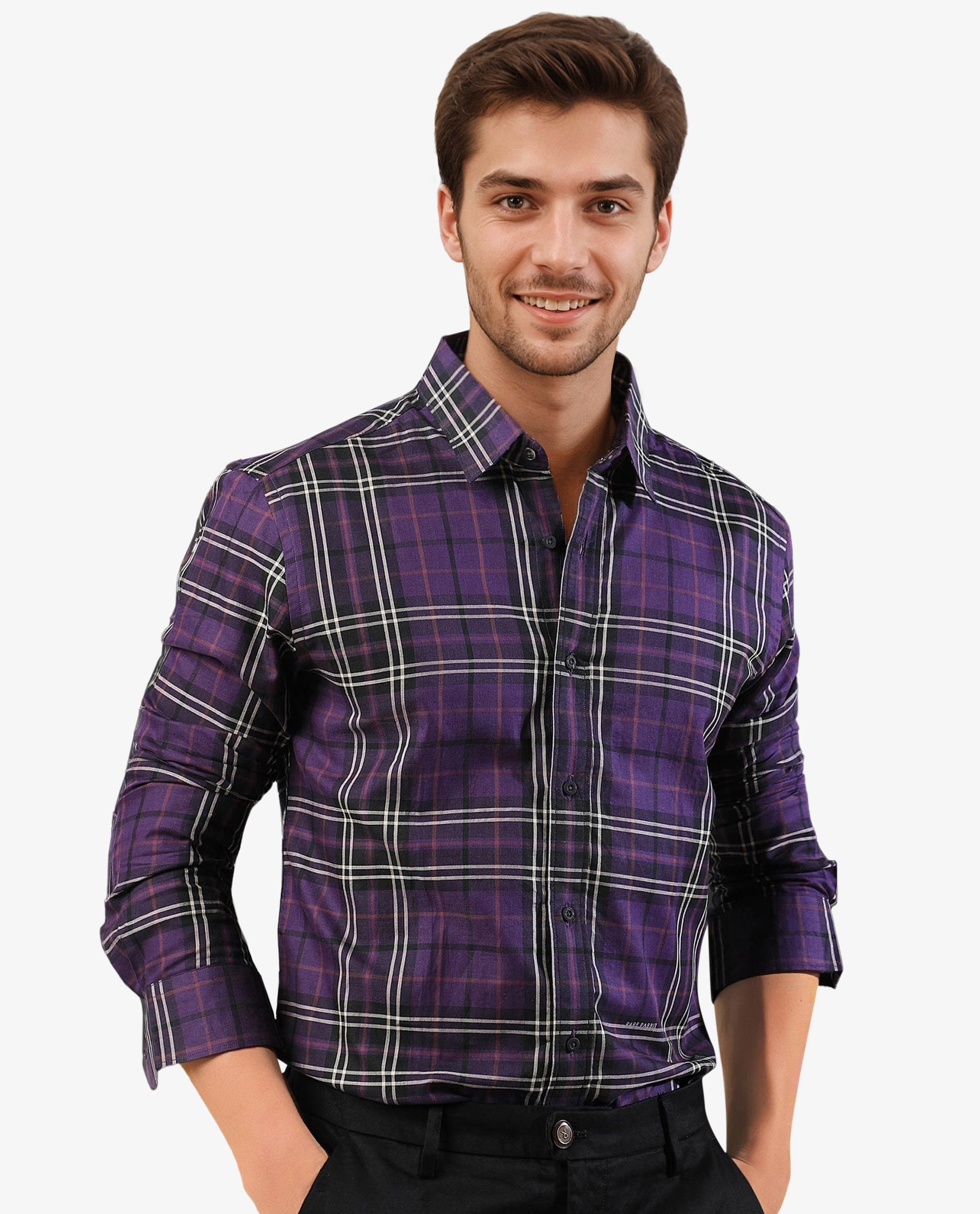 Rare Rabbit Men's Brutons Purple Cotton Fabric Full Sleeves Twill Checks Shirt