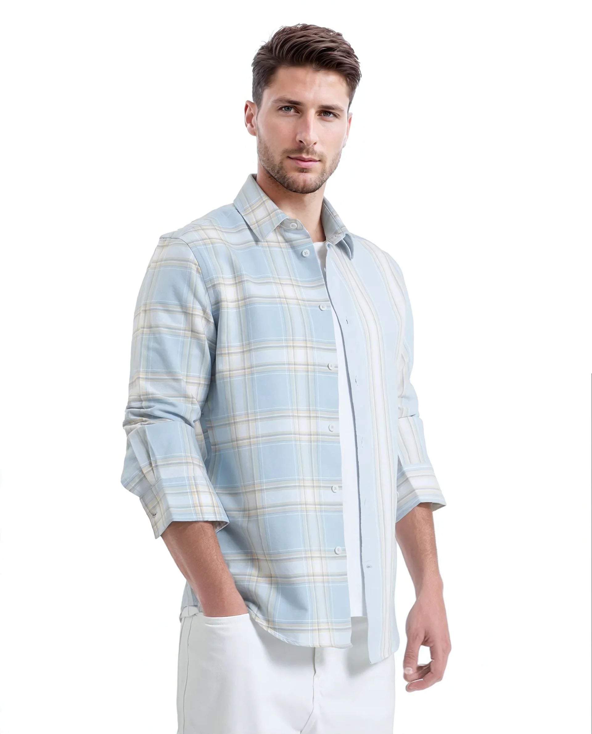 Introducing our Pastel Blue Checked Shirt, a perfect blend of style and comfort for your casual wardrobe. Crafted from premium cotton, this regular fit shirt ensures breathability and ease of movement. Featuring a classic spread collar and full sleeves, it offers a timeless look suitable for any occasion. The button closure adds a touch of sophistication, making it an ideal choice for both work and leisure. Elevate your fashion game with this versatile checked shirt, designed to keep you looking sharp and feeling comfortable all day long. Perfect for those who appreciate quality and style in their everyday attire.