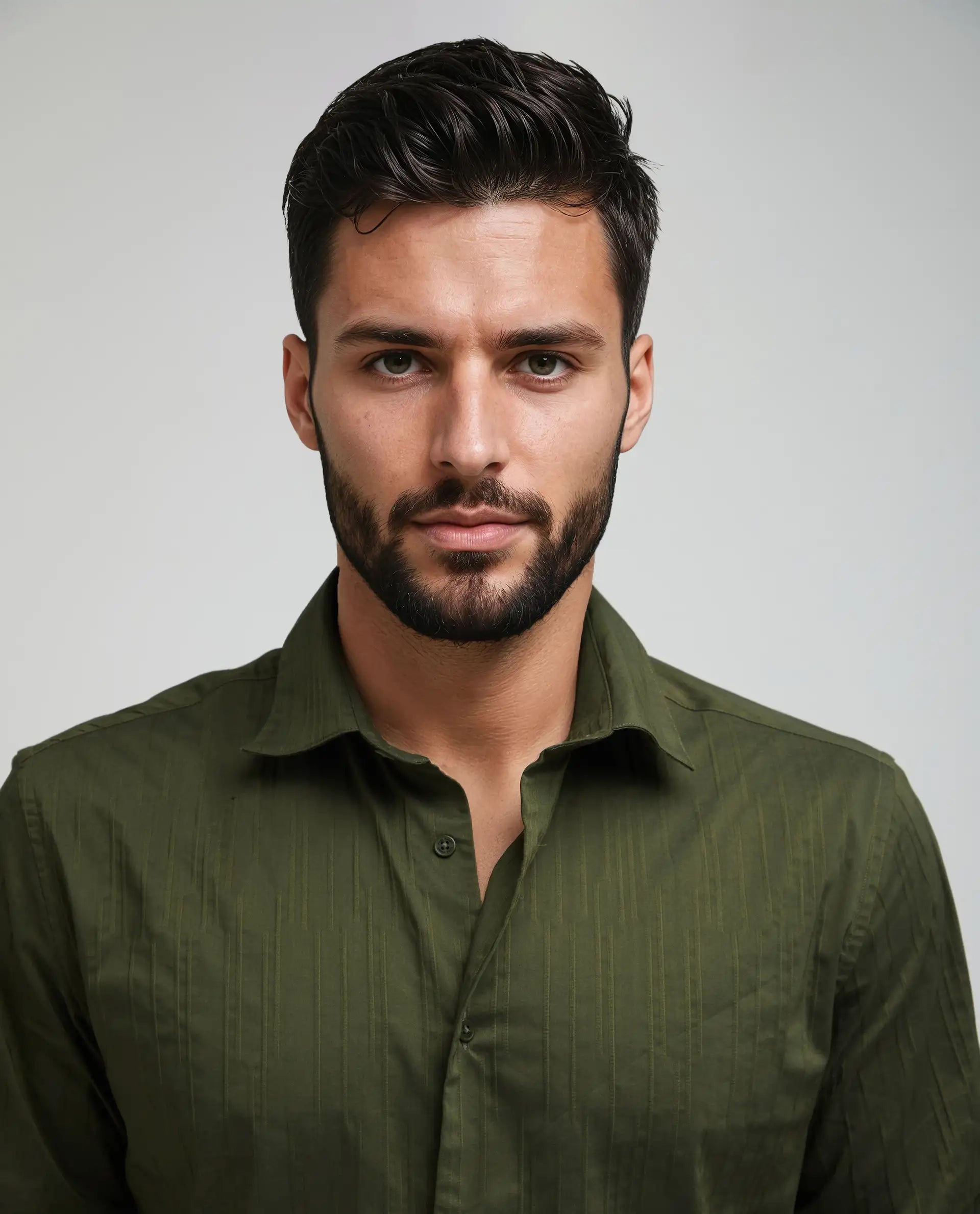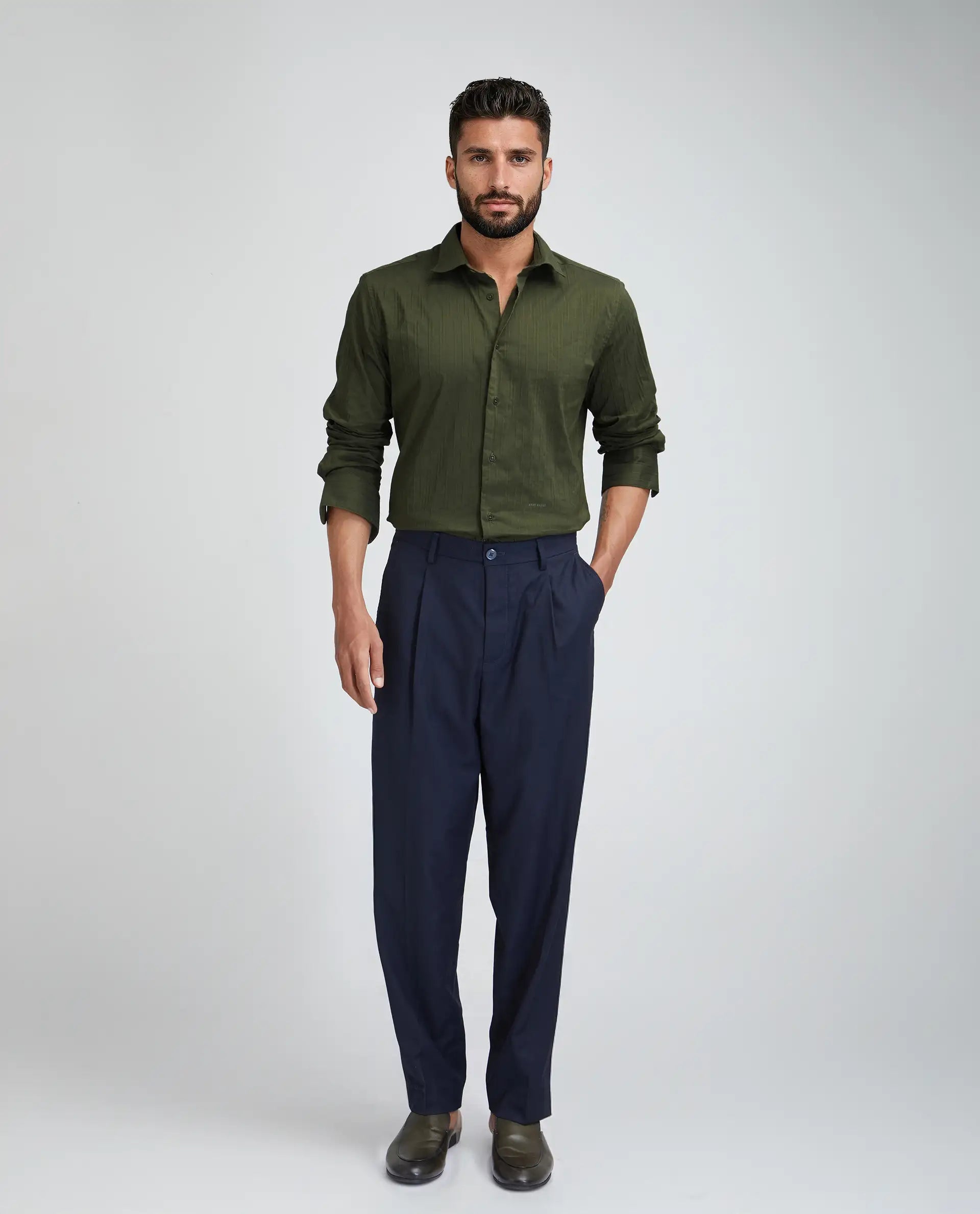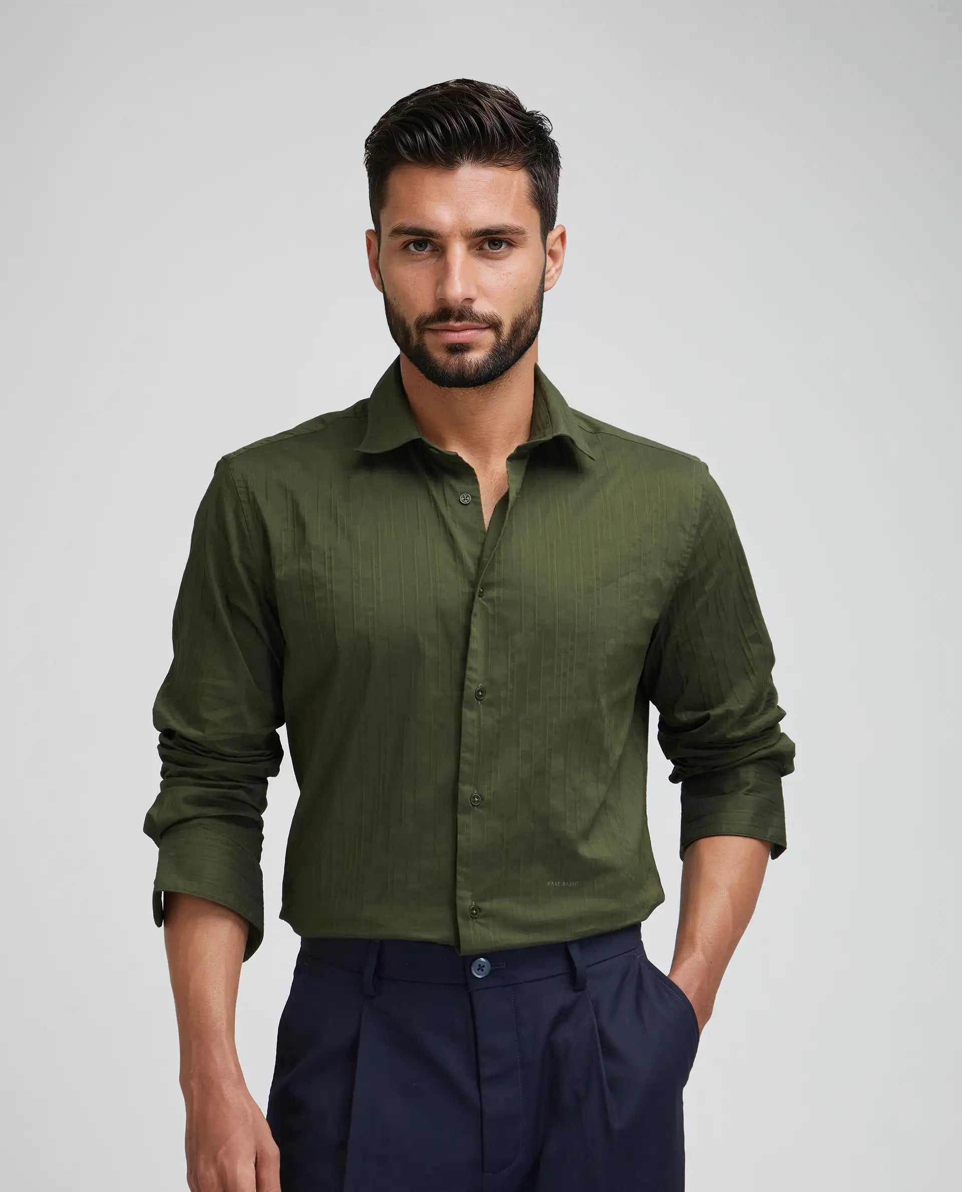 Elevate your wardrobe with the Rare Rabbit Men Jerna-B shirt, crafted from breathable olive cotton fabric for all-day comfort. This full-sleeve design features a classic collared neck and button closure, complemented by subtle stripes that add a refined touch.
