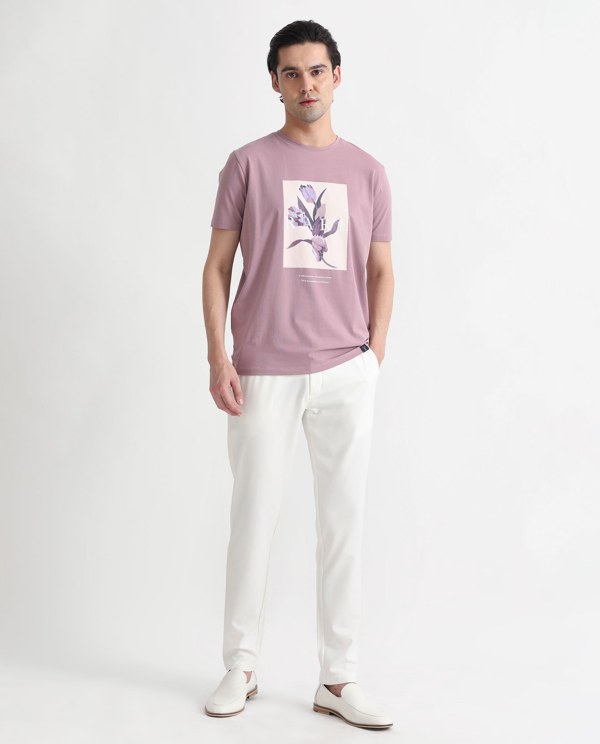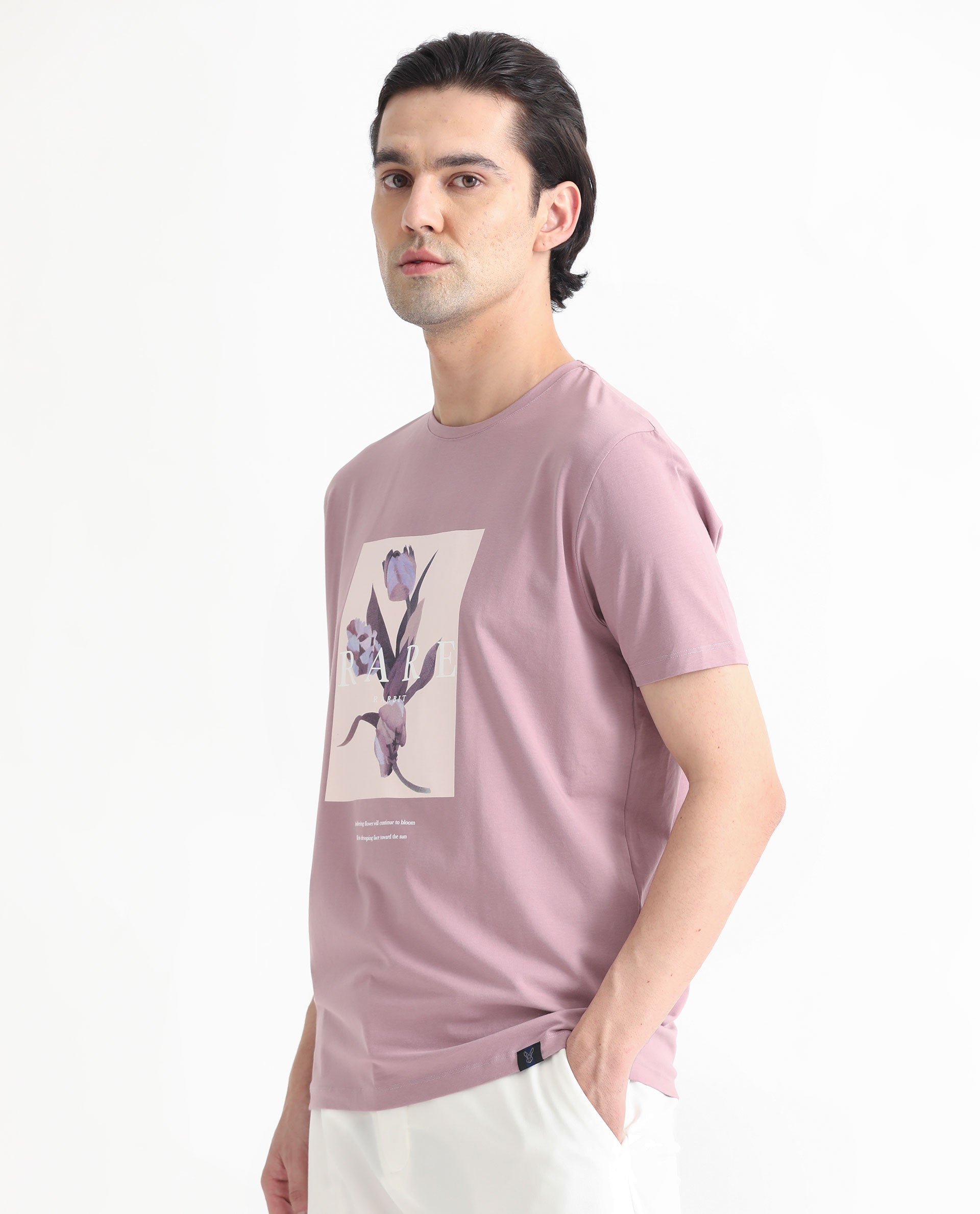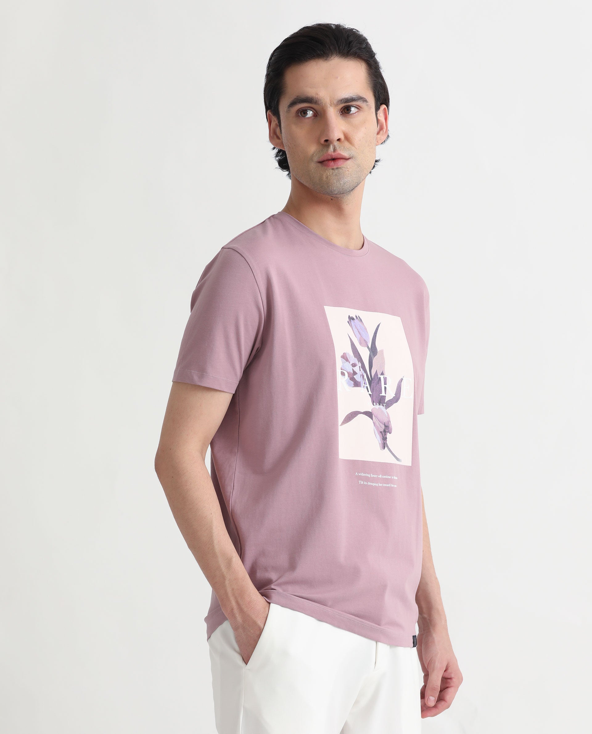 Rare Rabbit Men's Funes Dusky Pink Cotton Lycra Fabric Crew Neck Half Sleeves Regular Fit Floral Graphic Printed T-Shirt