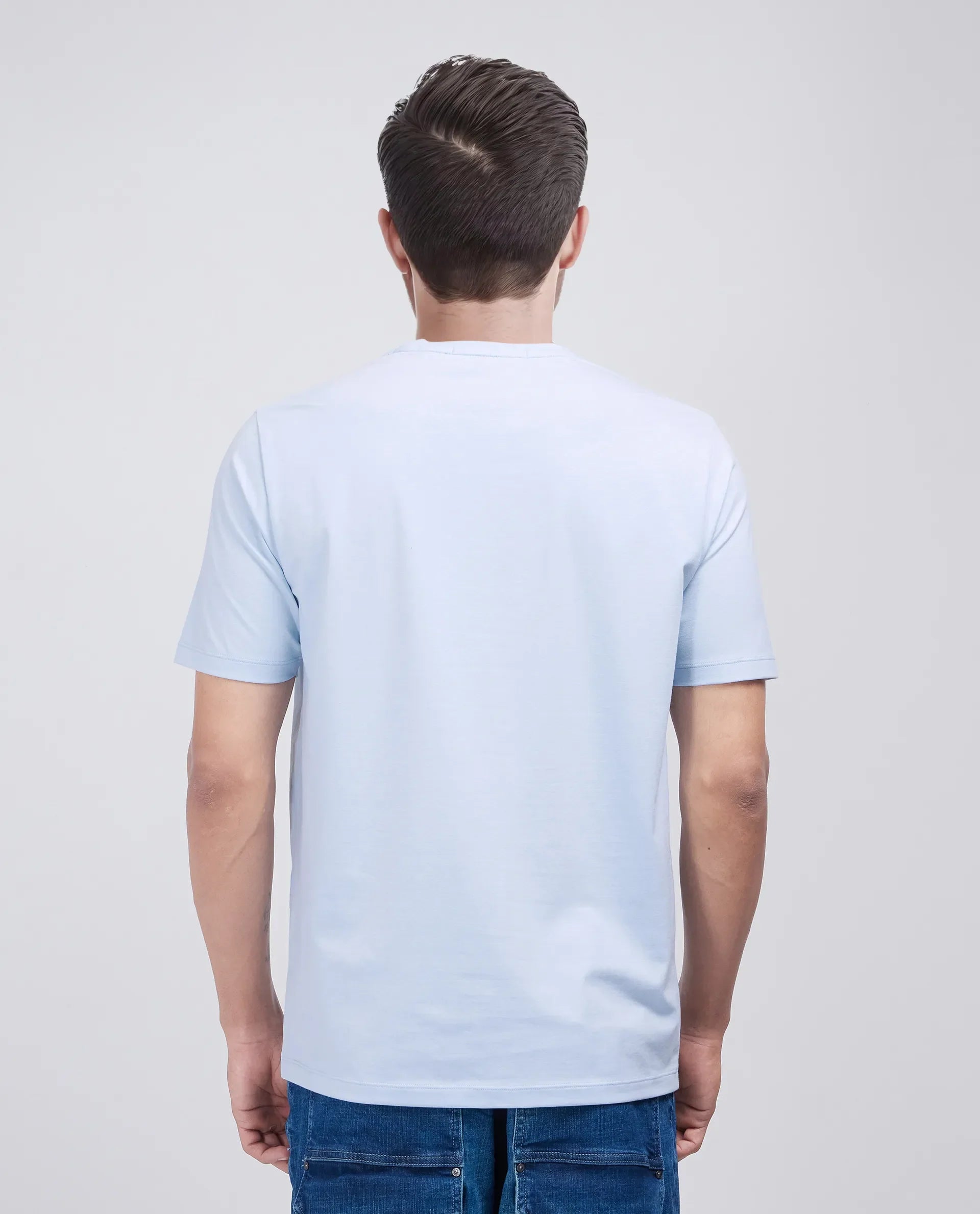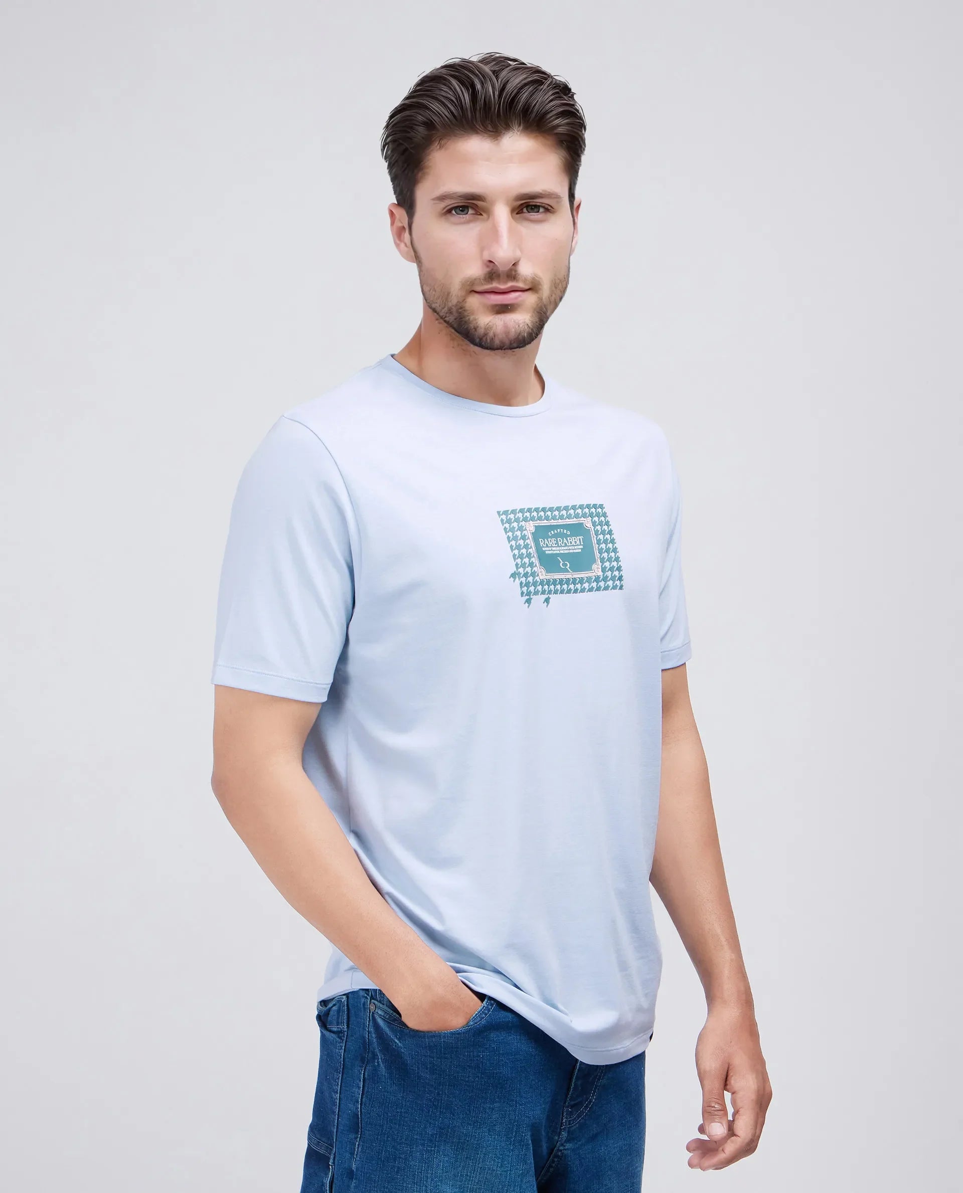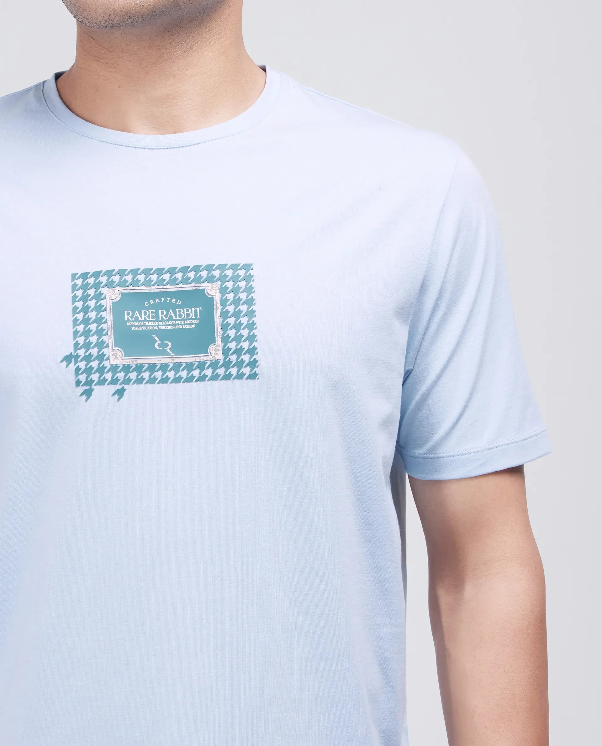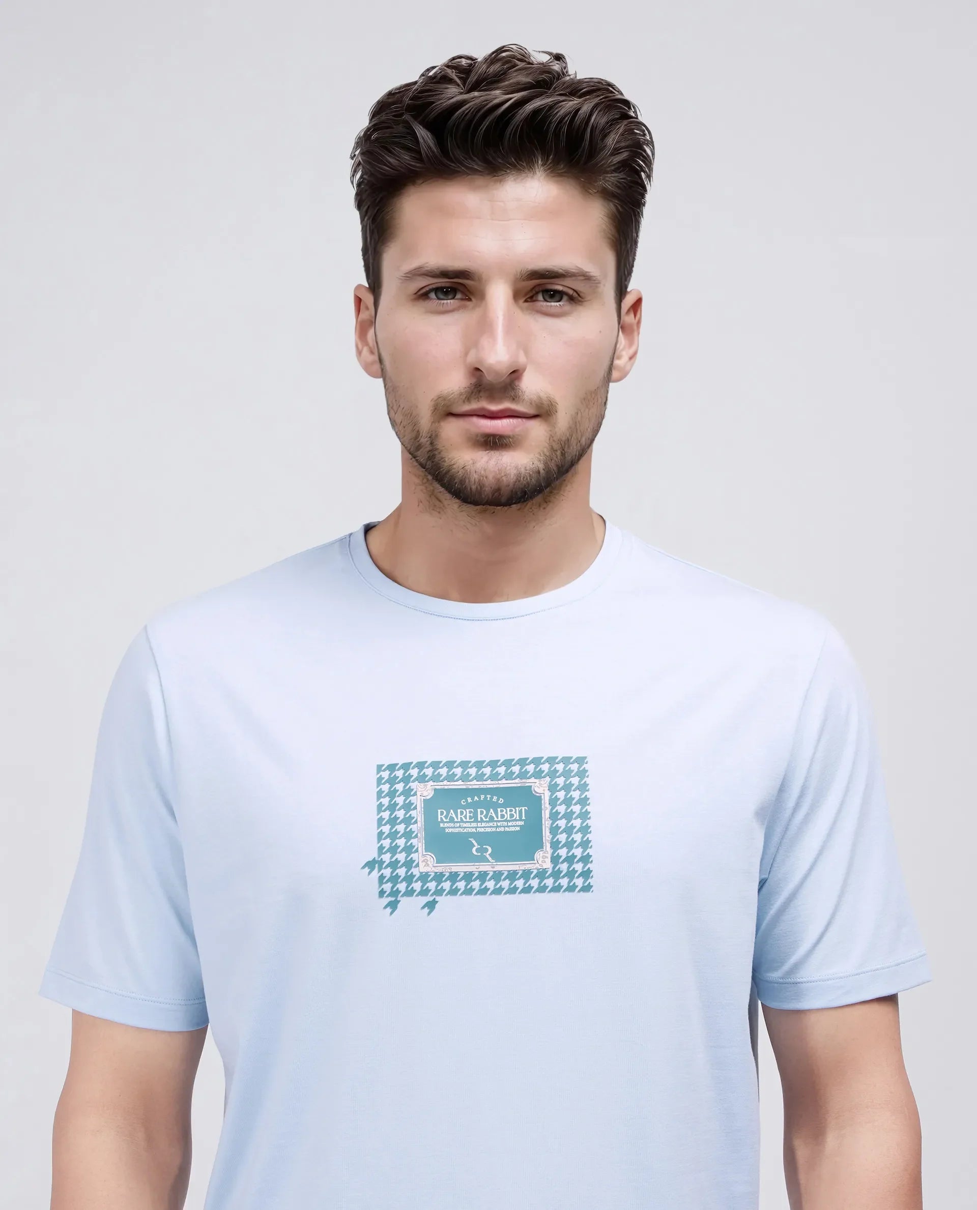 Rare Rabbit Men Jed Dusky Blue Cotton Lycra Fabric Short Sleeve Crew Neck Graphic Print T-Shirt