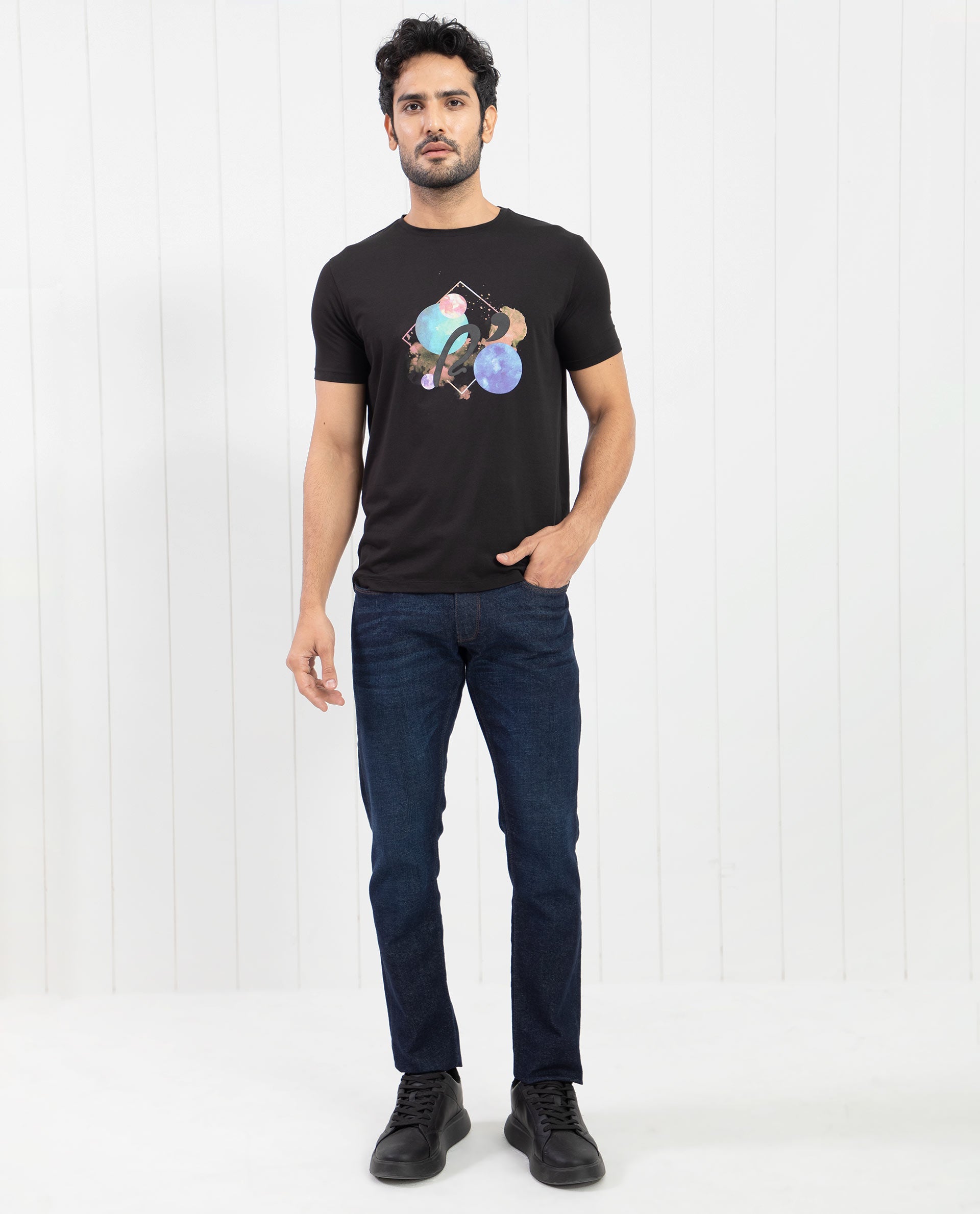 Rare Rabbit Men's Moreno Black Crew Neck Half Sleeves Regular Fit Graphic Print T-Shirt
