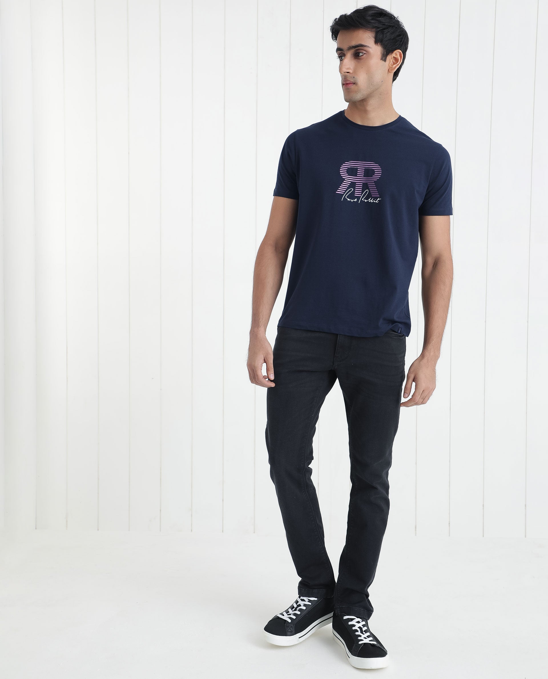 Rare Rabbit Men's Neary Navy Crew Neck Graphic Print Branding Half Sleeve Regular Fit T-Shirt