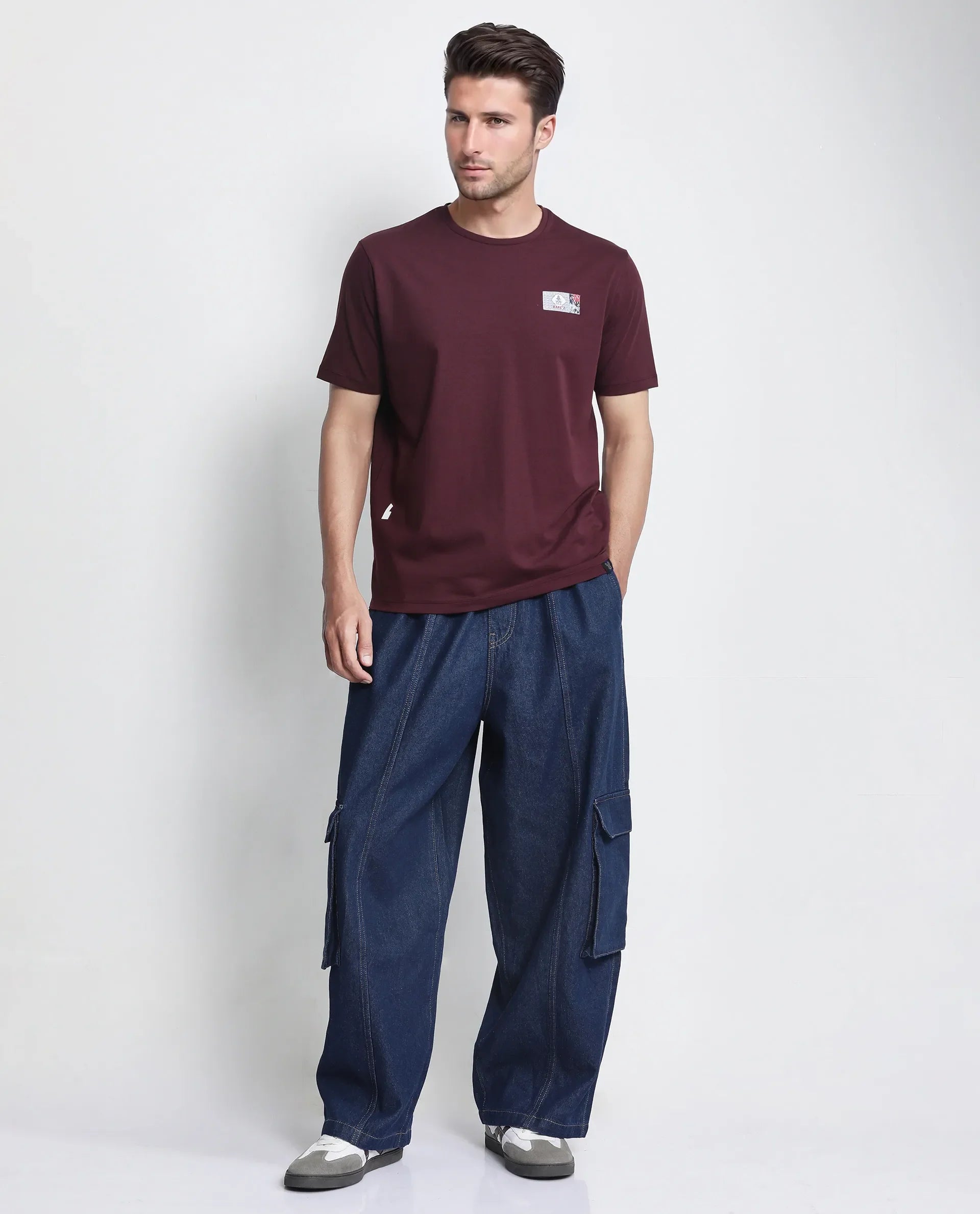 Rare Rabbit Men Saw Pastel Maroon Cotton Lycra Fabric Short Sleeve Crew Neck Label Print T-Shirt