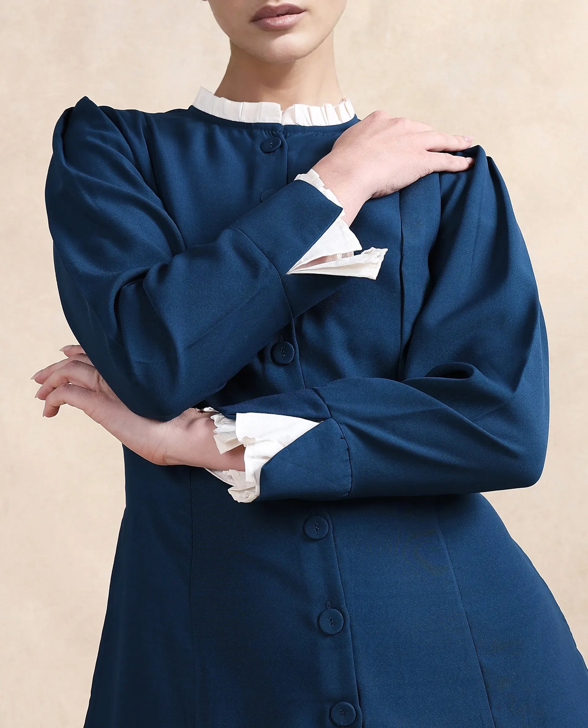 Rareism Women Bayburt Teal Poly Blend Fabric Full Sleeve Ruffled Neck Button Closure Straight Fit Knee Length Plain Dress