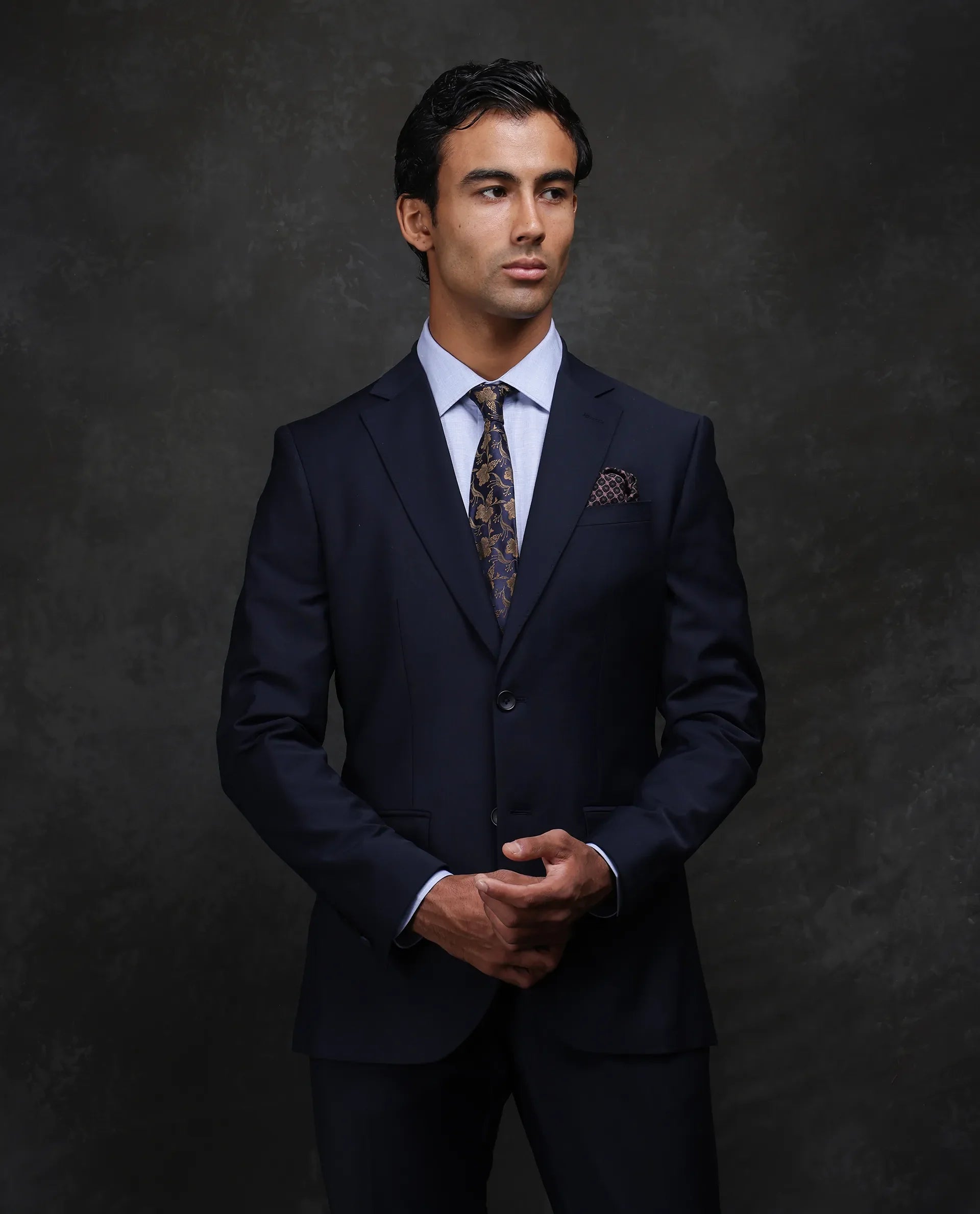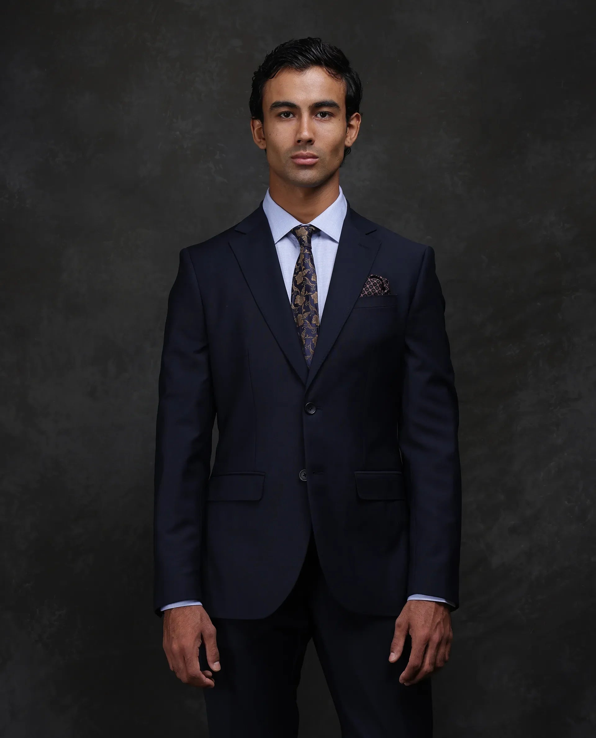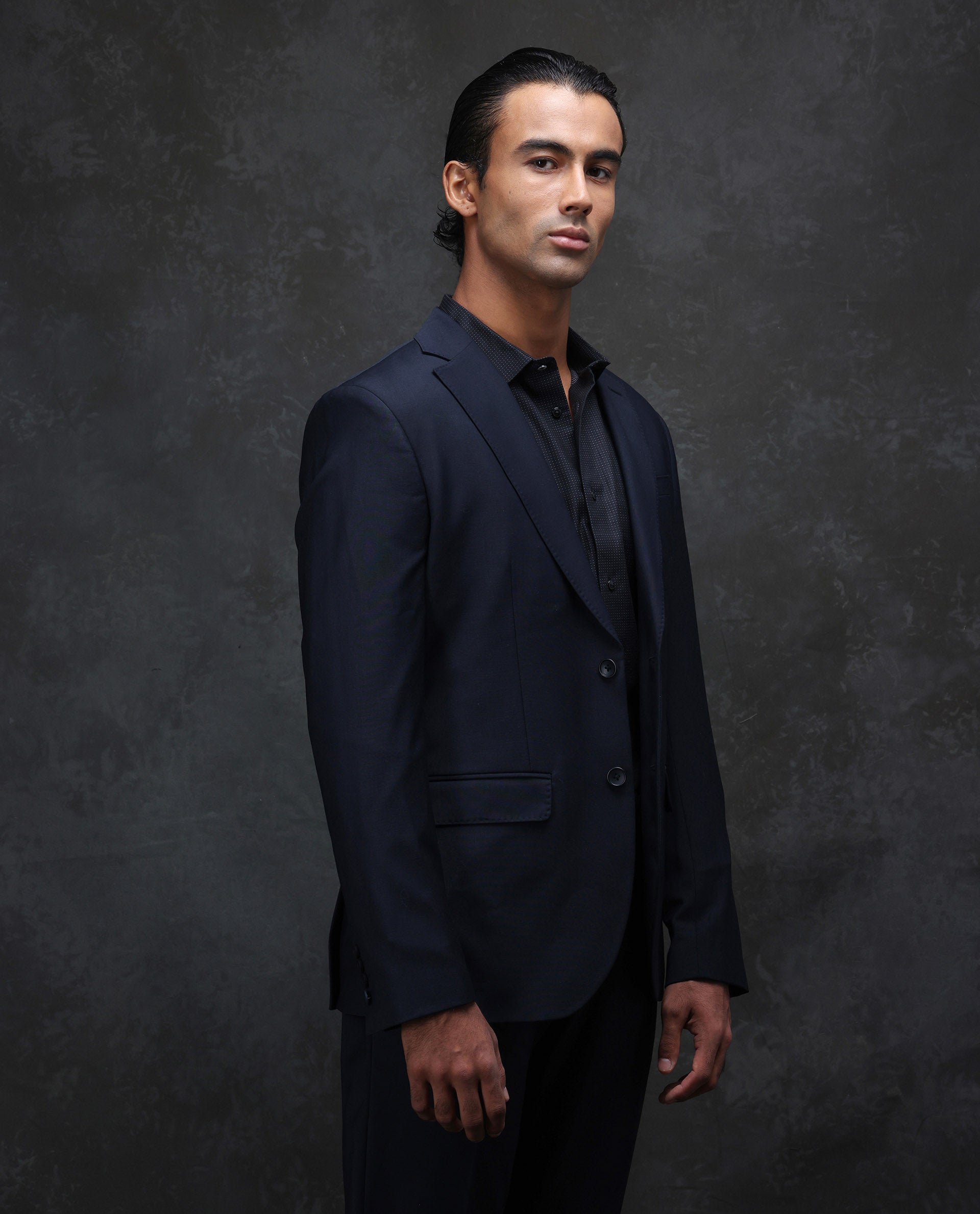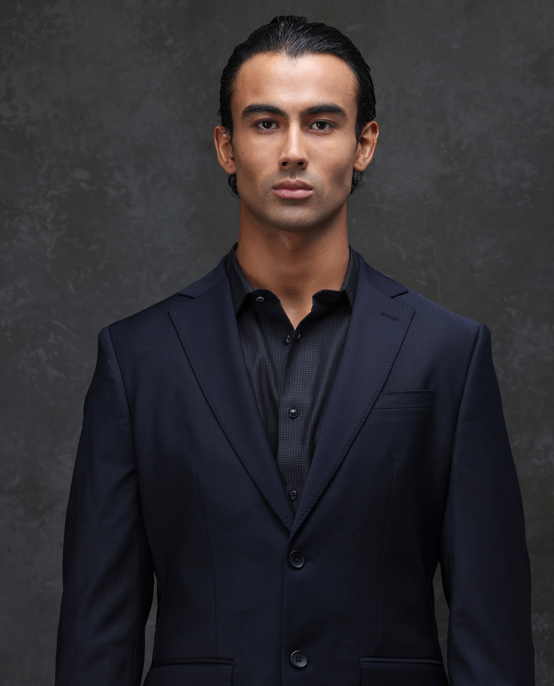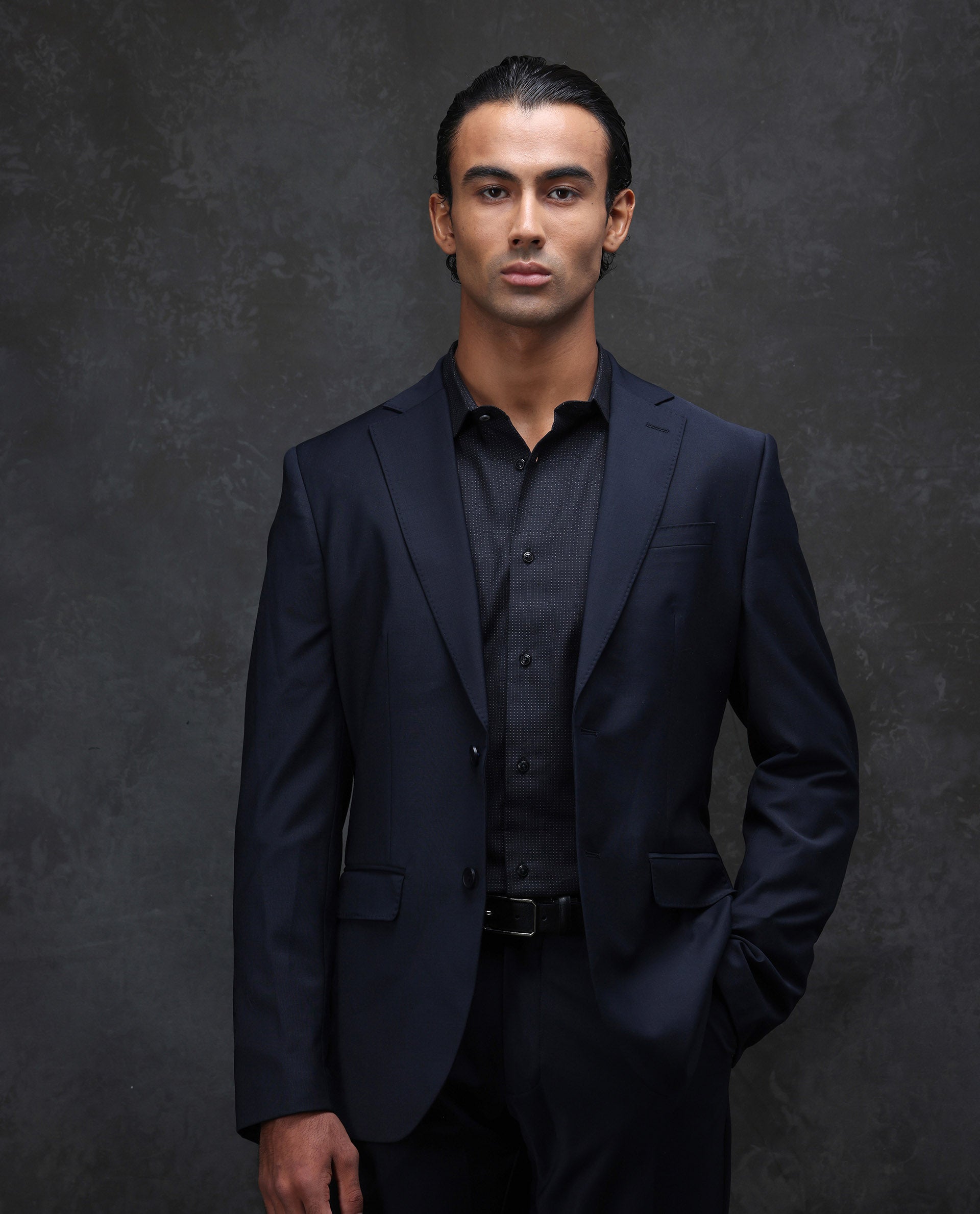Crafted from a luxurious wool blend, the Rare Rabbit Men Arbo-B Navy Suit boasts a sleek lapel neck and versatile button and zip closure. Elevate your formal wardrobe with this contemporary and sophisticated piece, perfect for any occasion. Expertly tailored for a comfortable and stylish fit.
