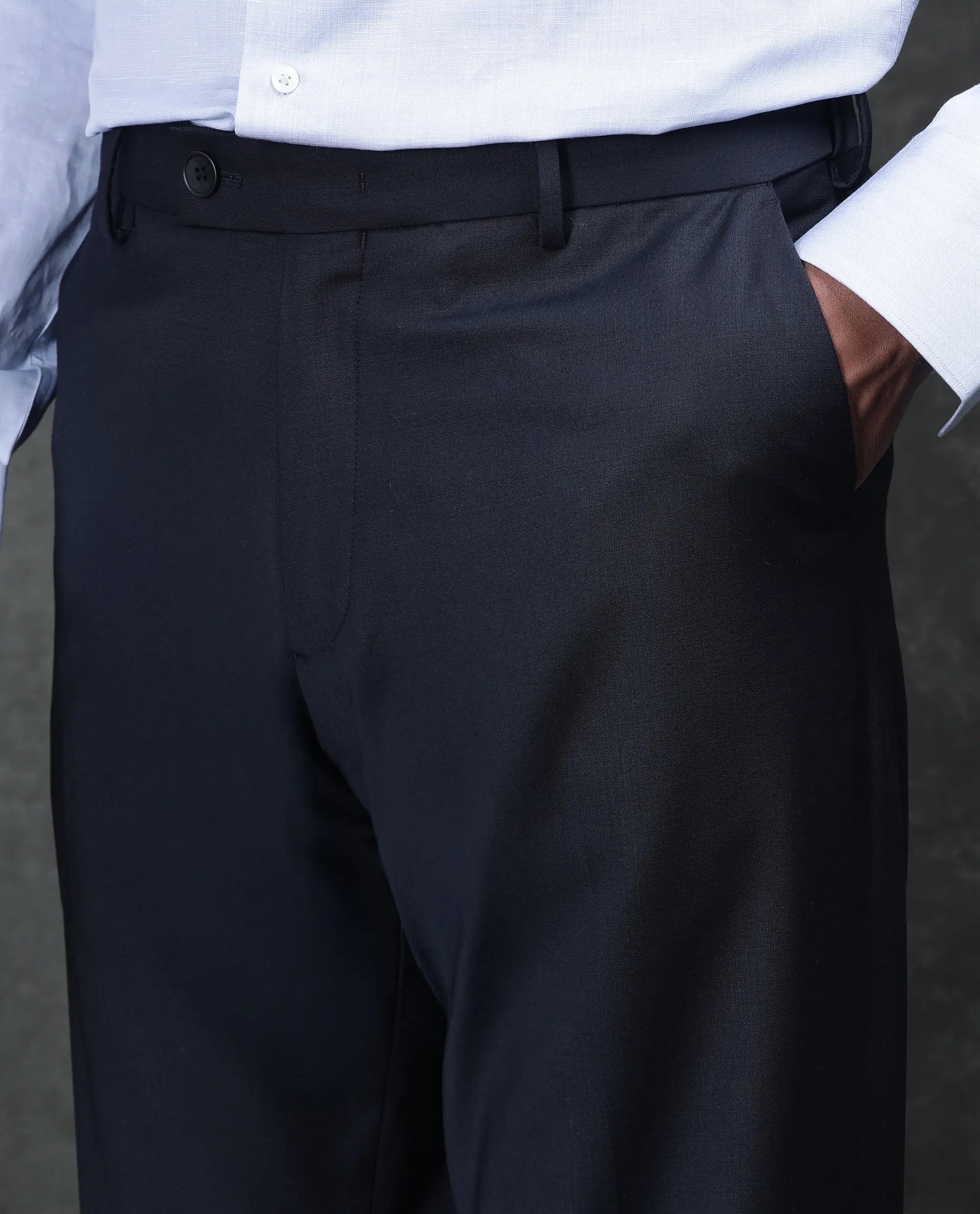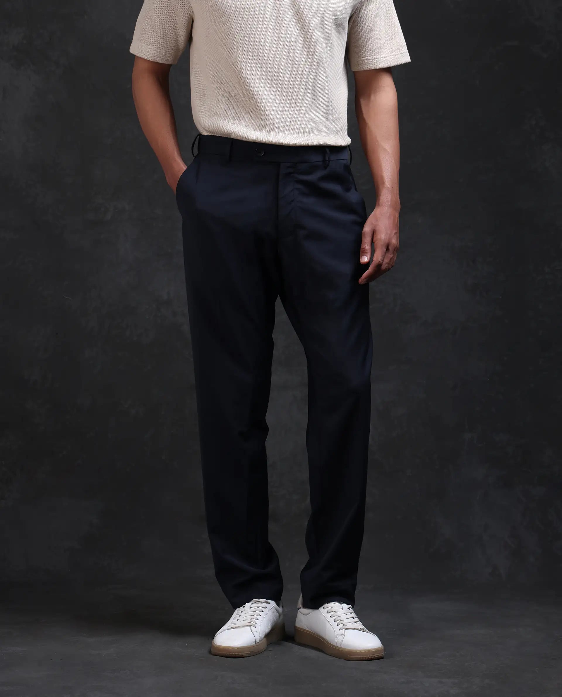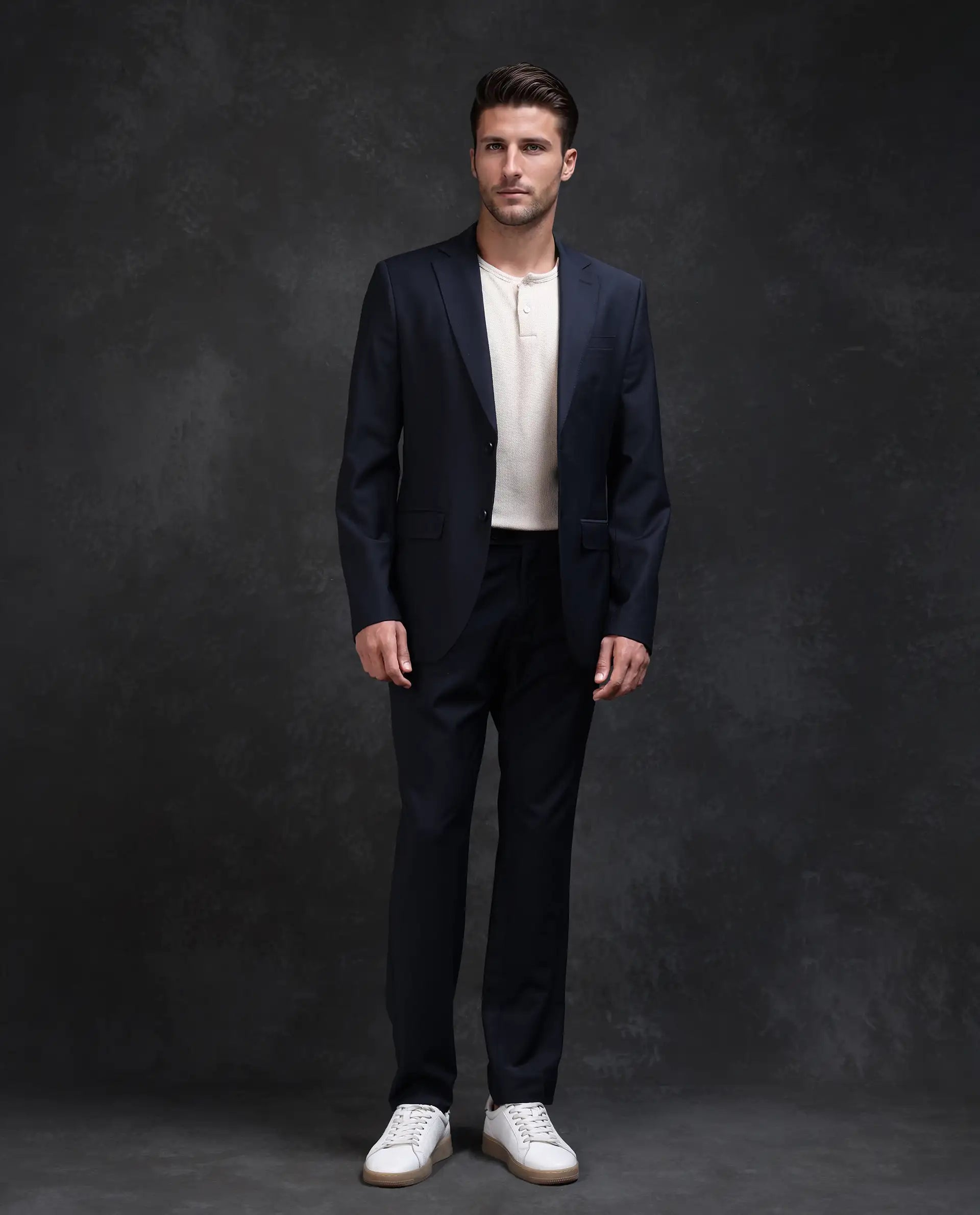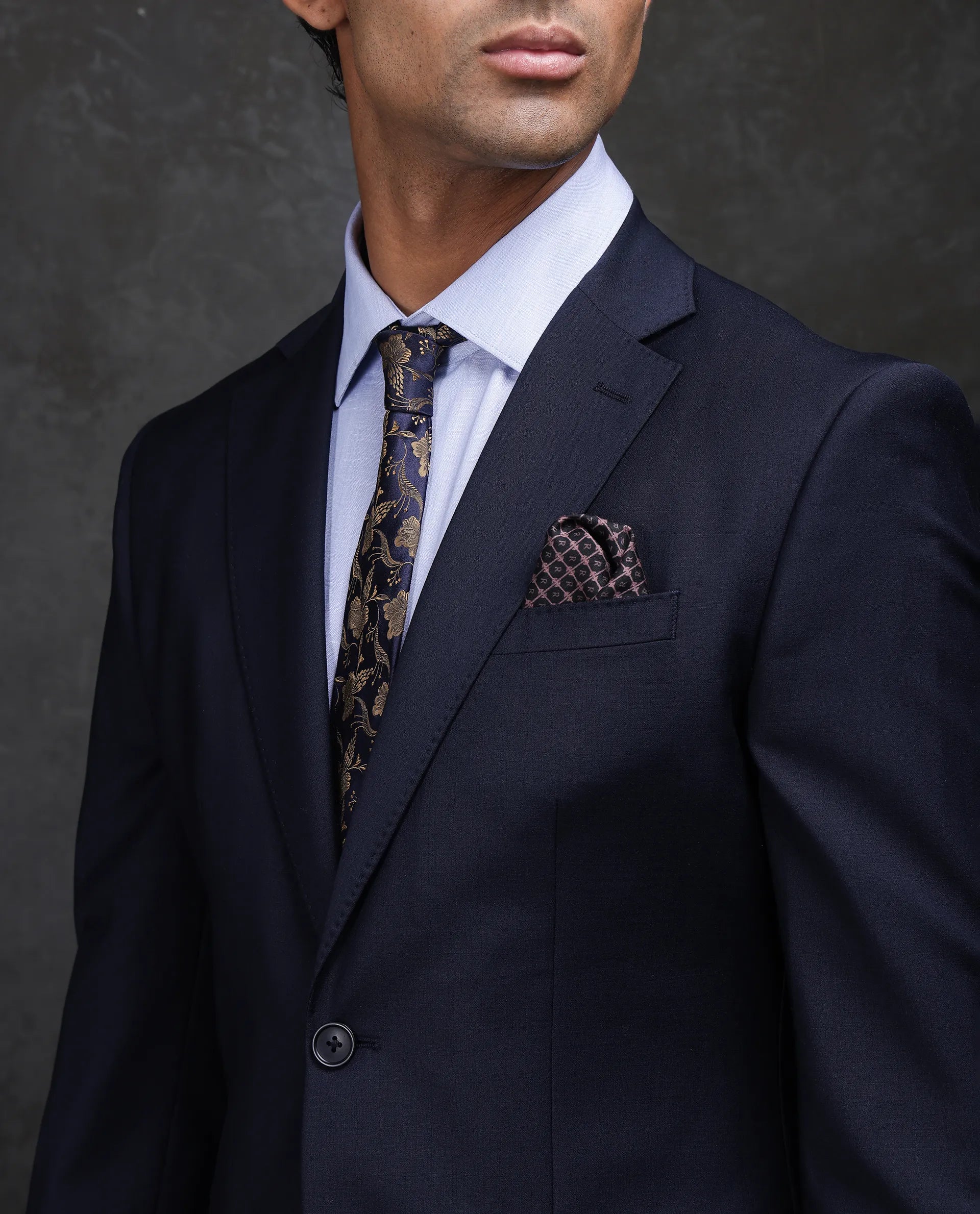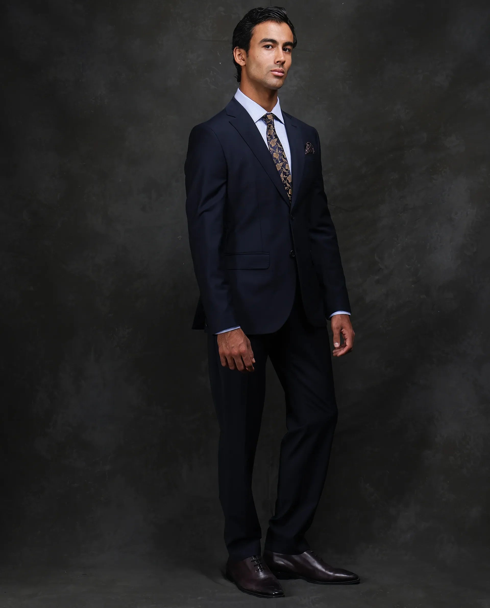 Crafted from a luxurious wool blend, the Rare Rabbit Men Arbo-B Navy Suit boasts a sleek lapel neck and versatile button and zip closure. Elevate your formal wardrobe with this contemporary and sophisticated piece, perfect for any occasion. Expertly tailored for a comfortable and stylish fit.