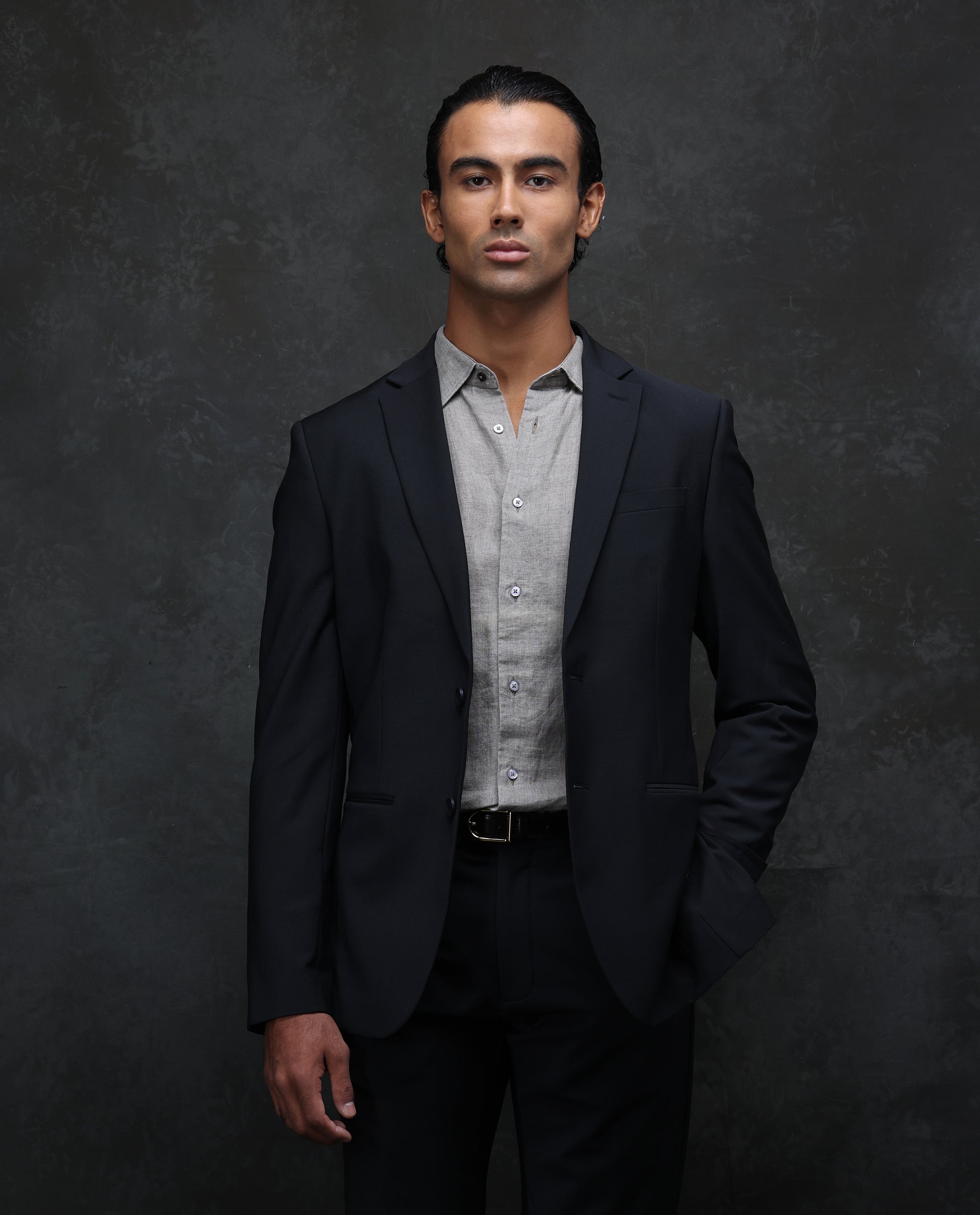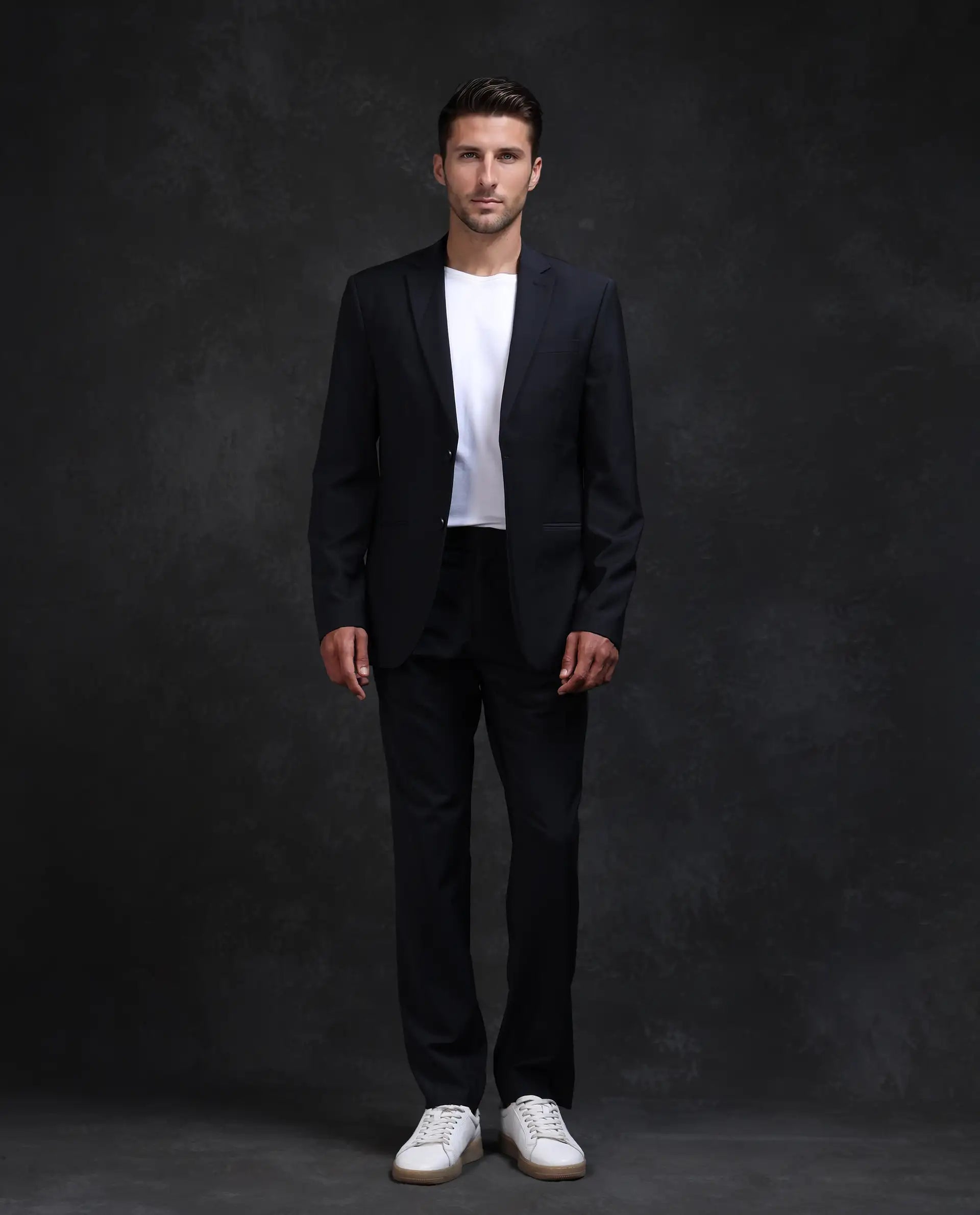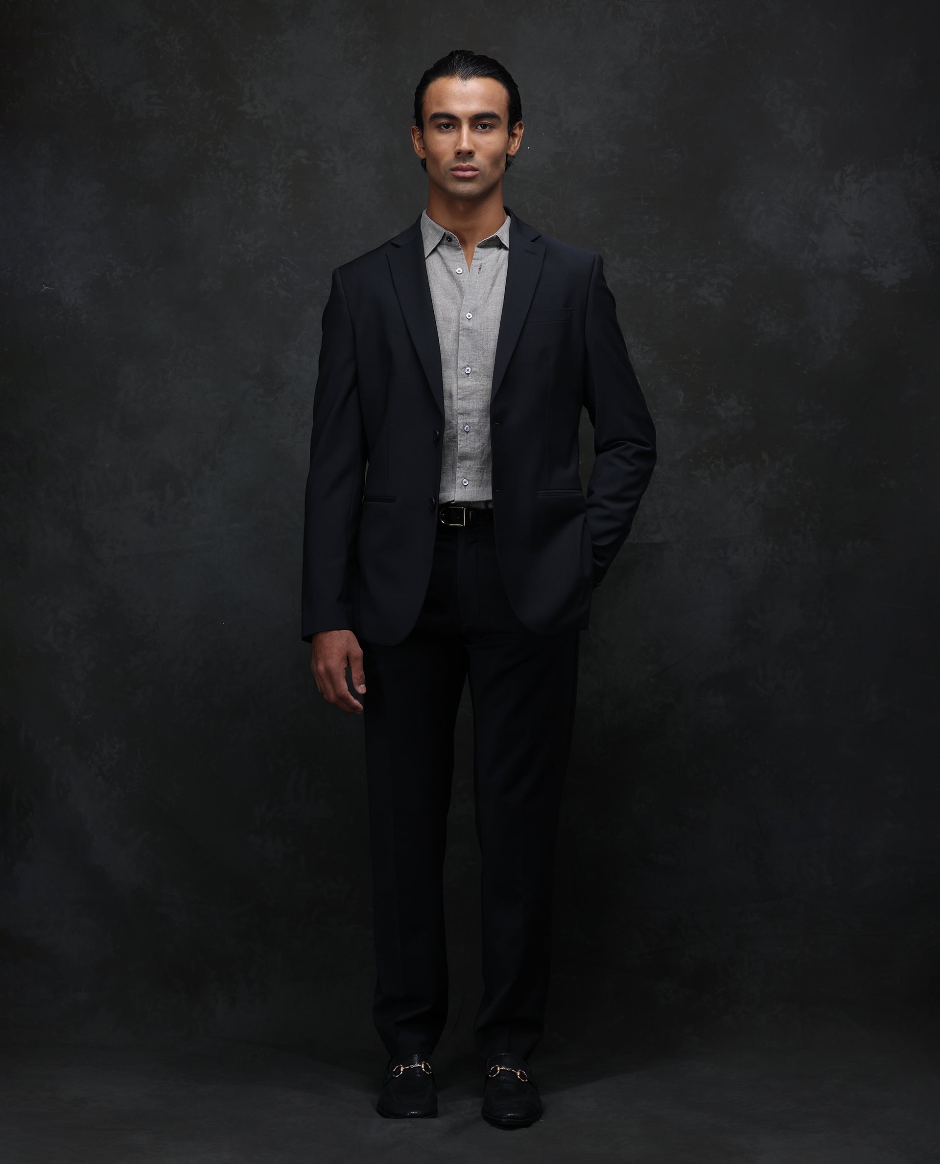 Expertly crafted with a wool blend, the Rare Rabbit Men Arlo-B Black Suits offer timeless style and unmatched comfort. With a lapel neck, button and zip closure, this suit is perfect for any occasion. Elevate your wardrobe and exude confidence with this quality essential.