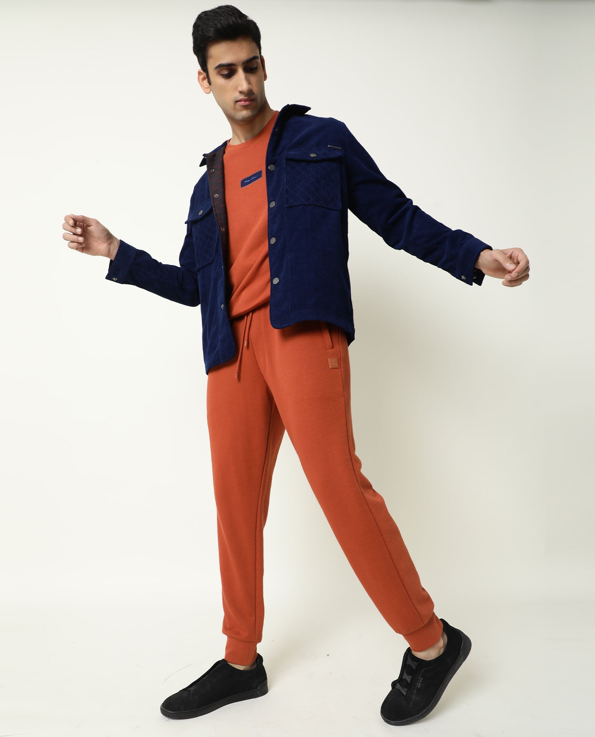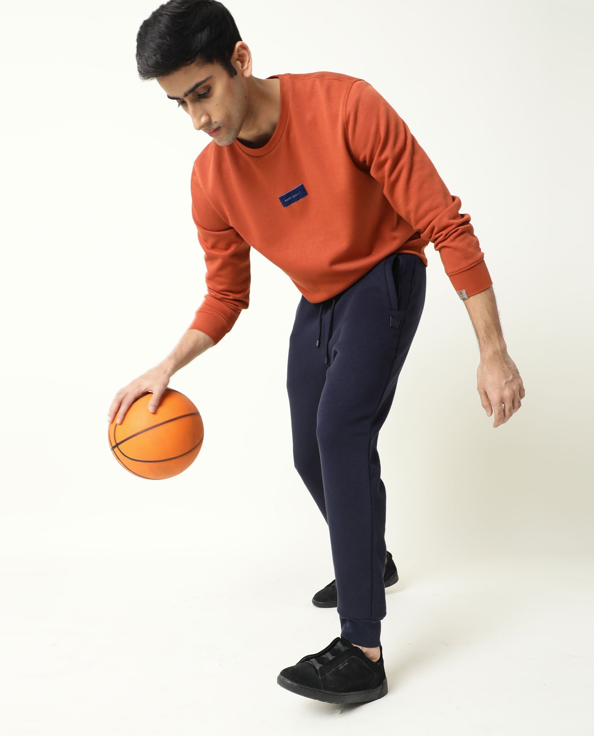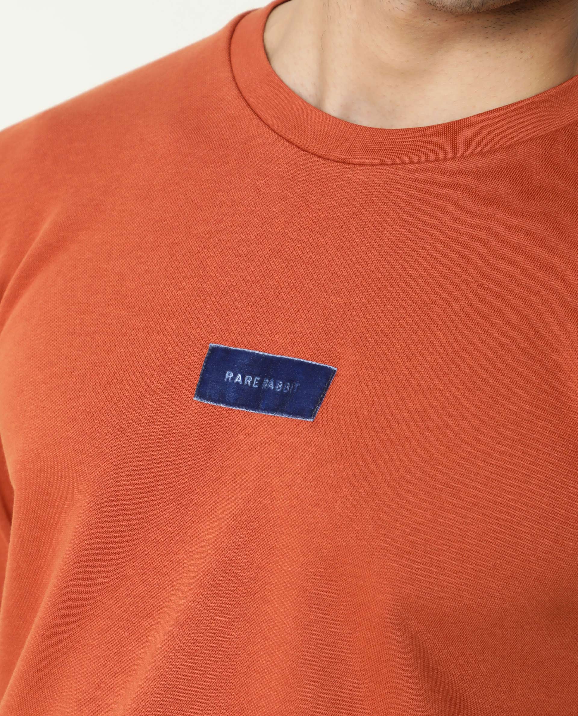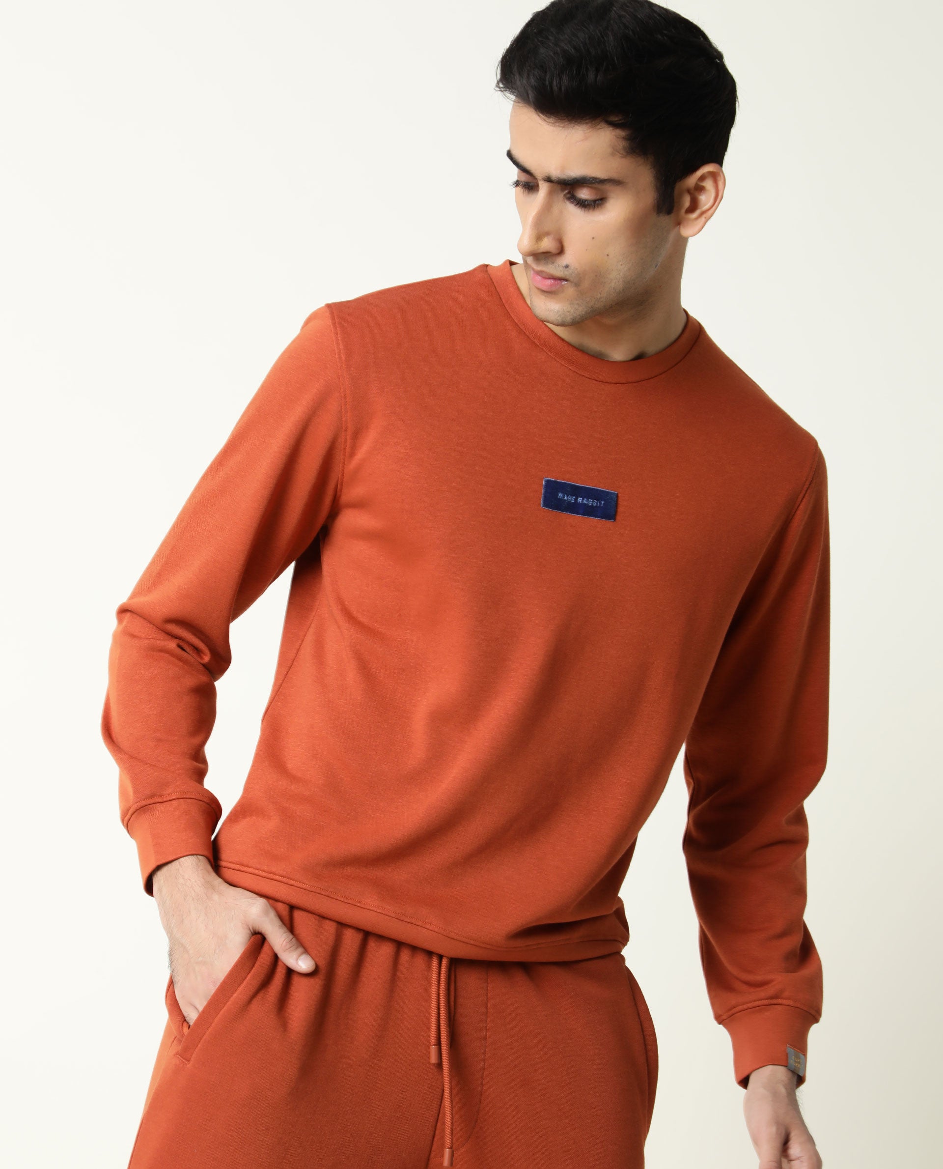 Rare Rabbit Men's Velveto Rust Cotton Polyester Fabric Full Sleeves Velvet Branding Knit Sweatshirt