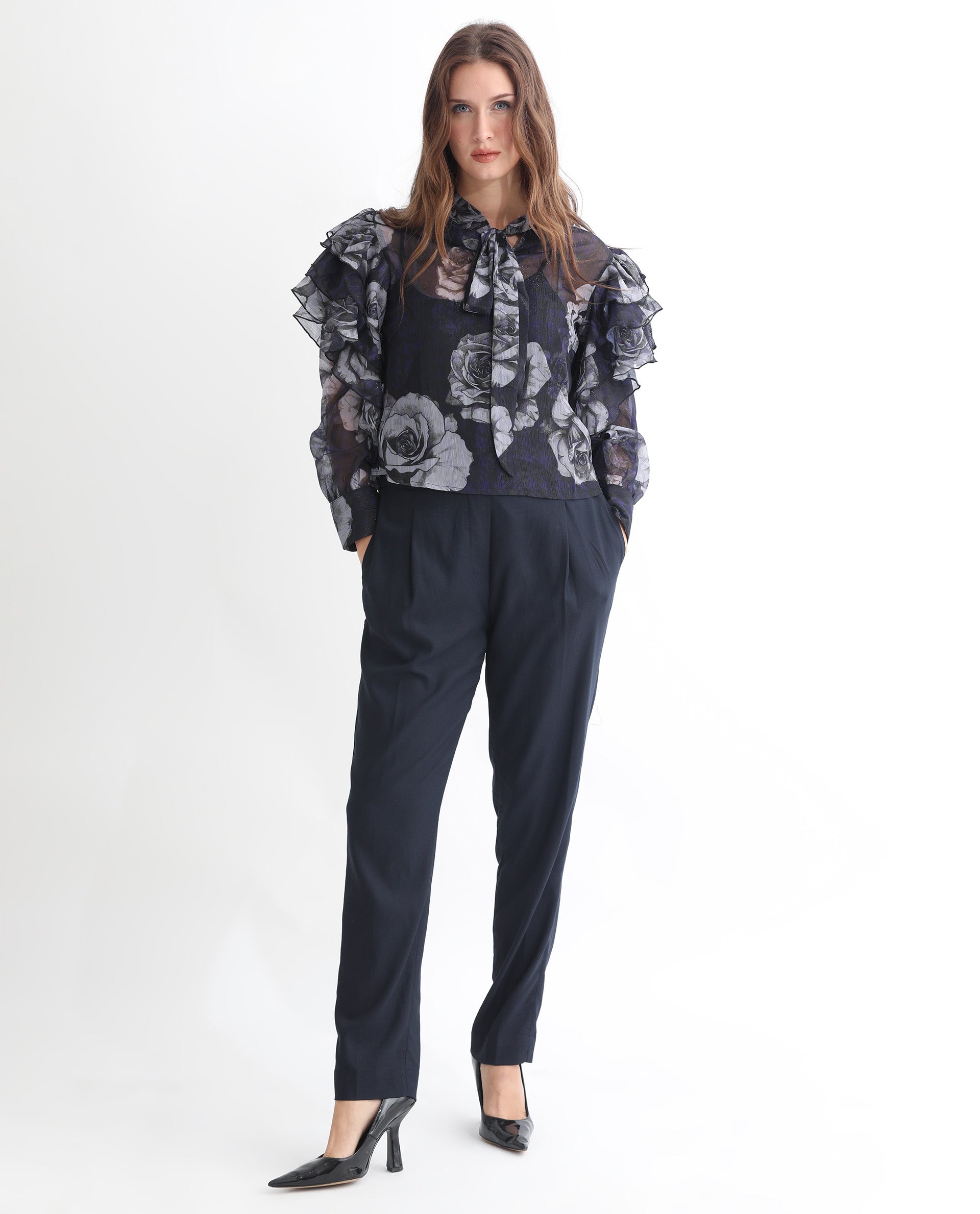 3. Full sleeves with layered ruffles at the shoulder create a romantic and feminine look.