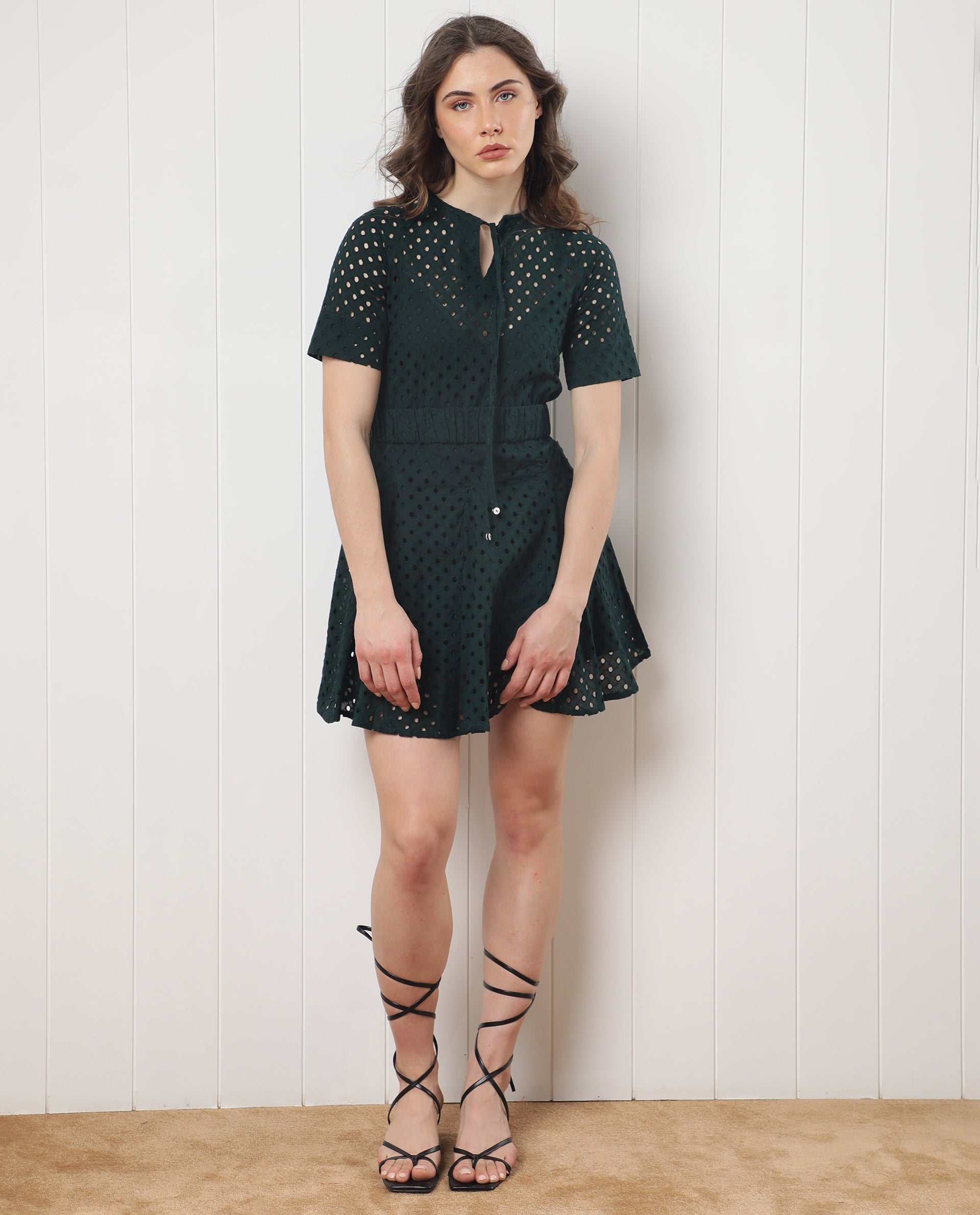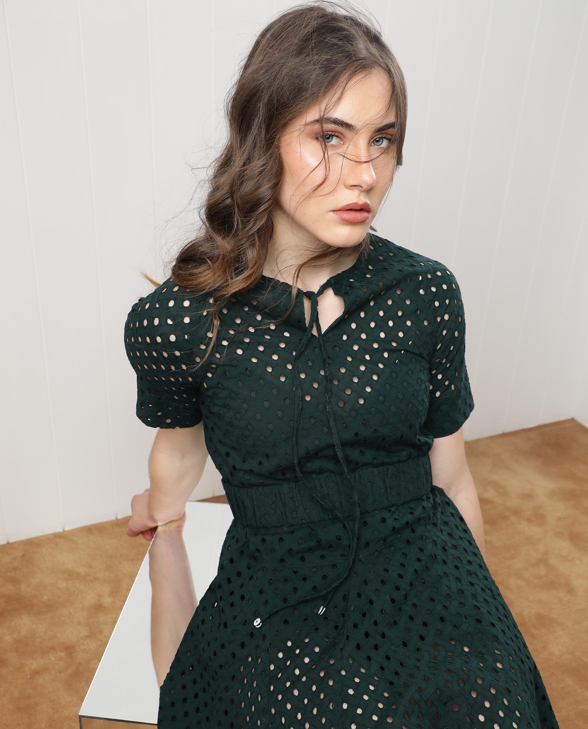 Rareism Women Bex Fluorescent Green Schiffili Round Tie Up Neck With Short Sleeves And Elastic Belt At Waist Mini Dress
