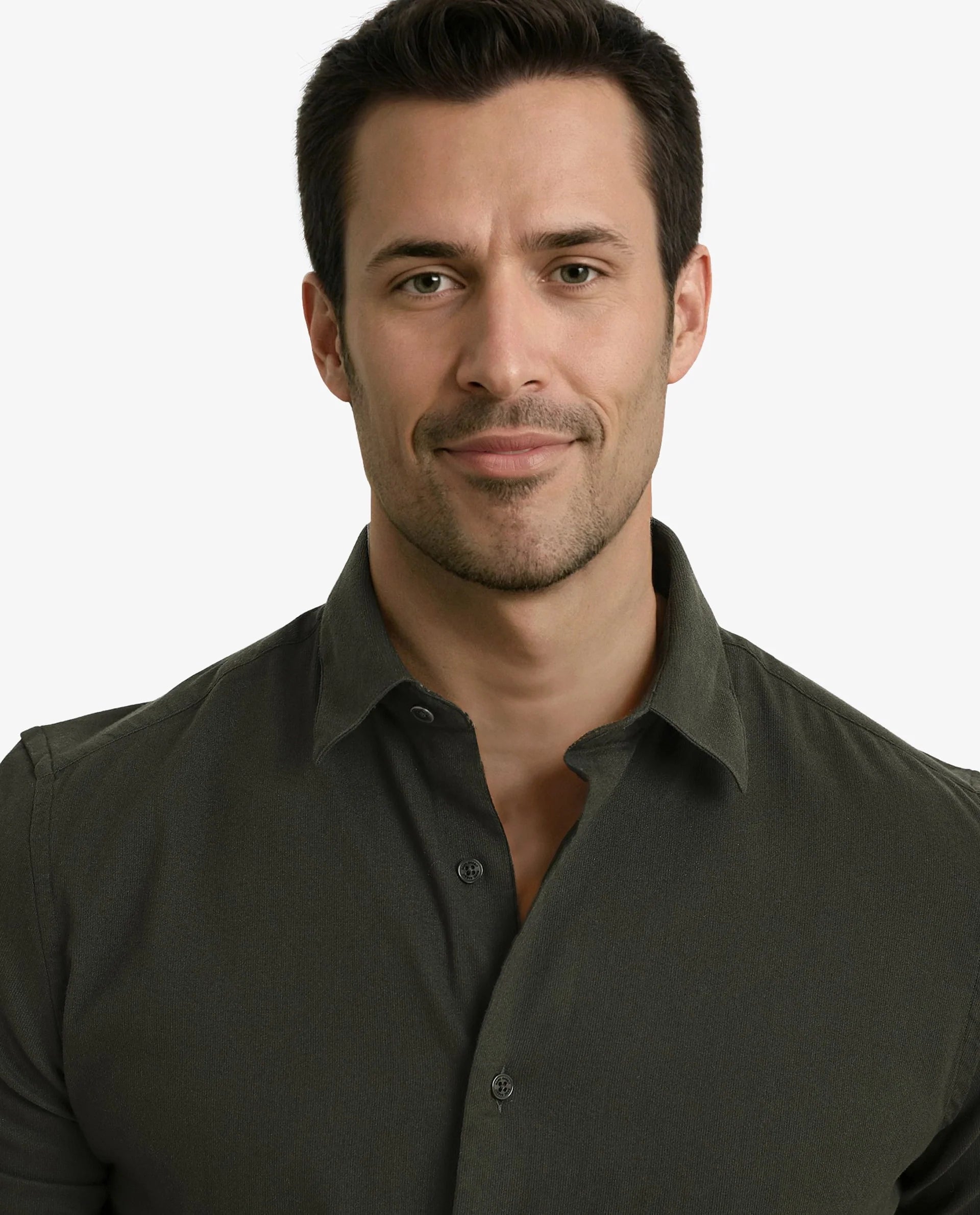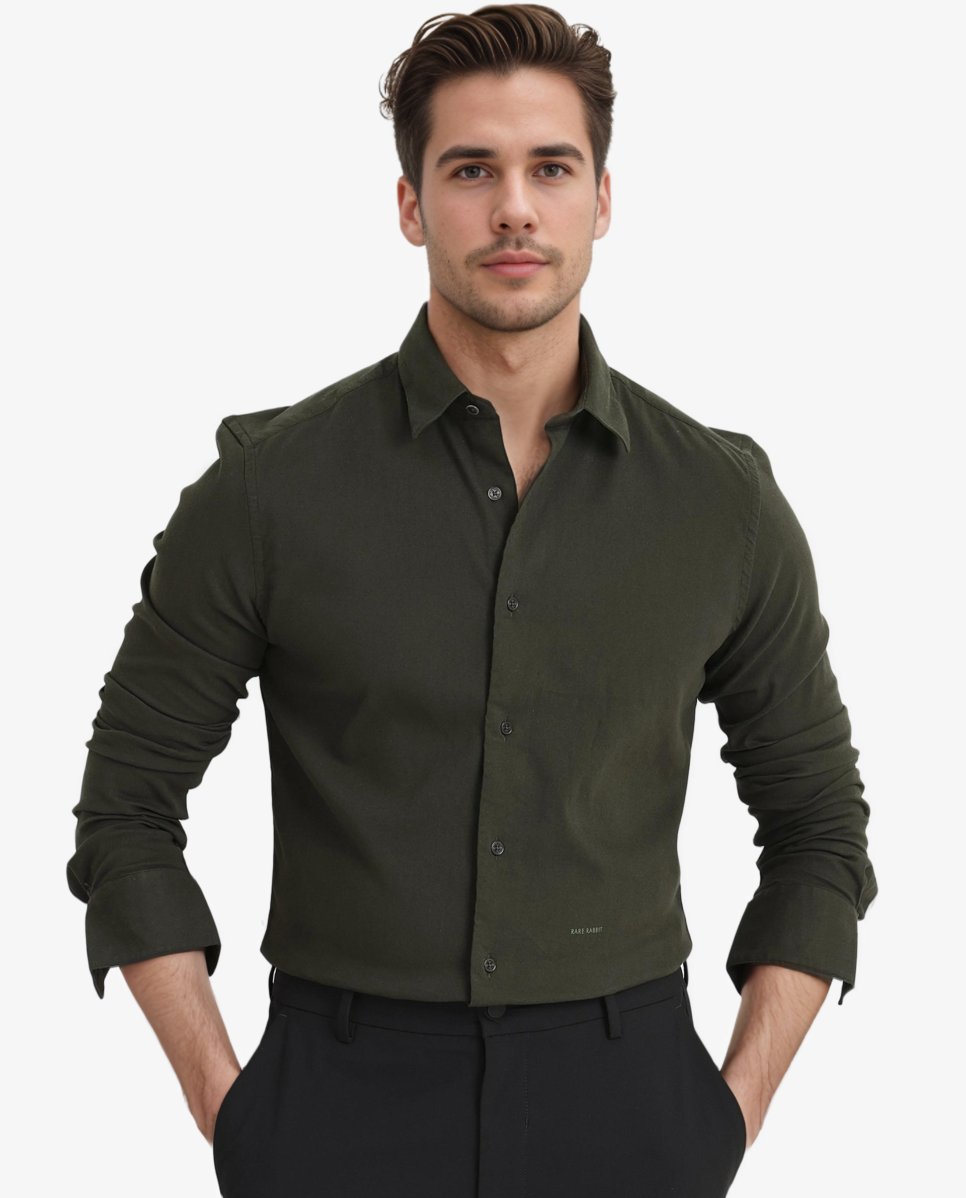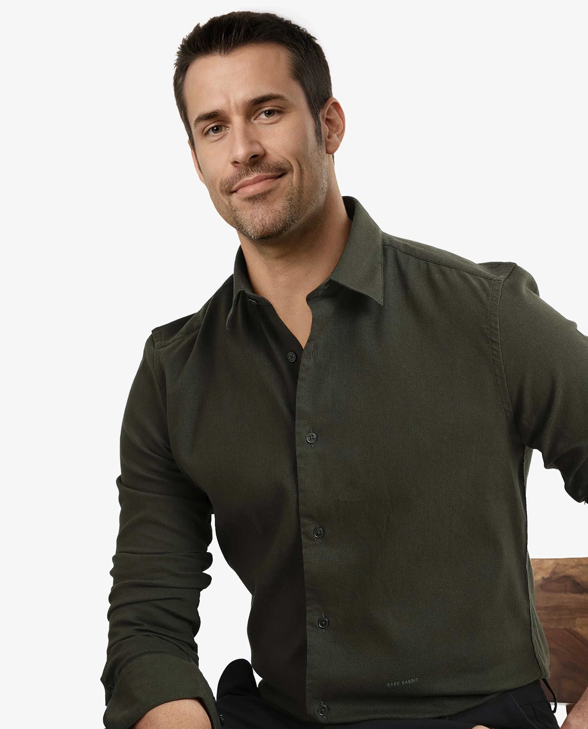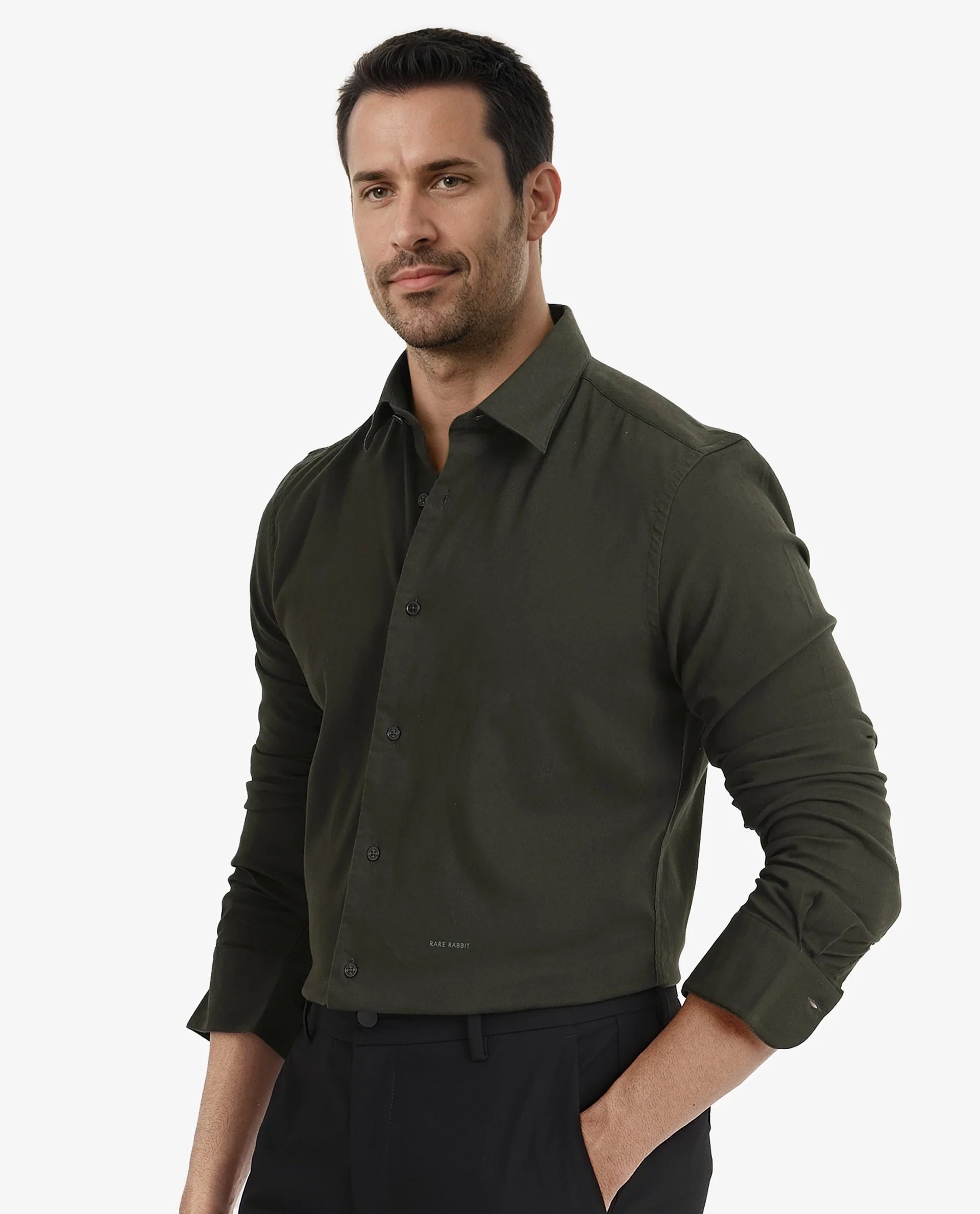 Rare Rabbit Men's Bicton Dark Green Cotton Lycra Fabric Full Sleeves Solid Twill Shirt