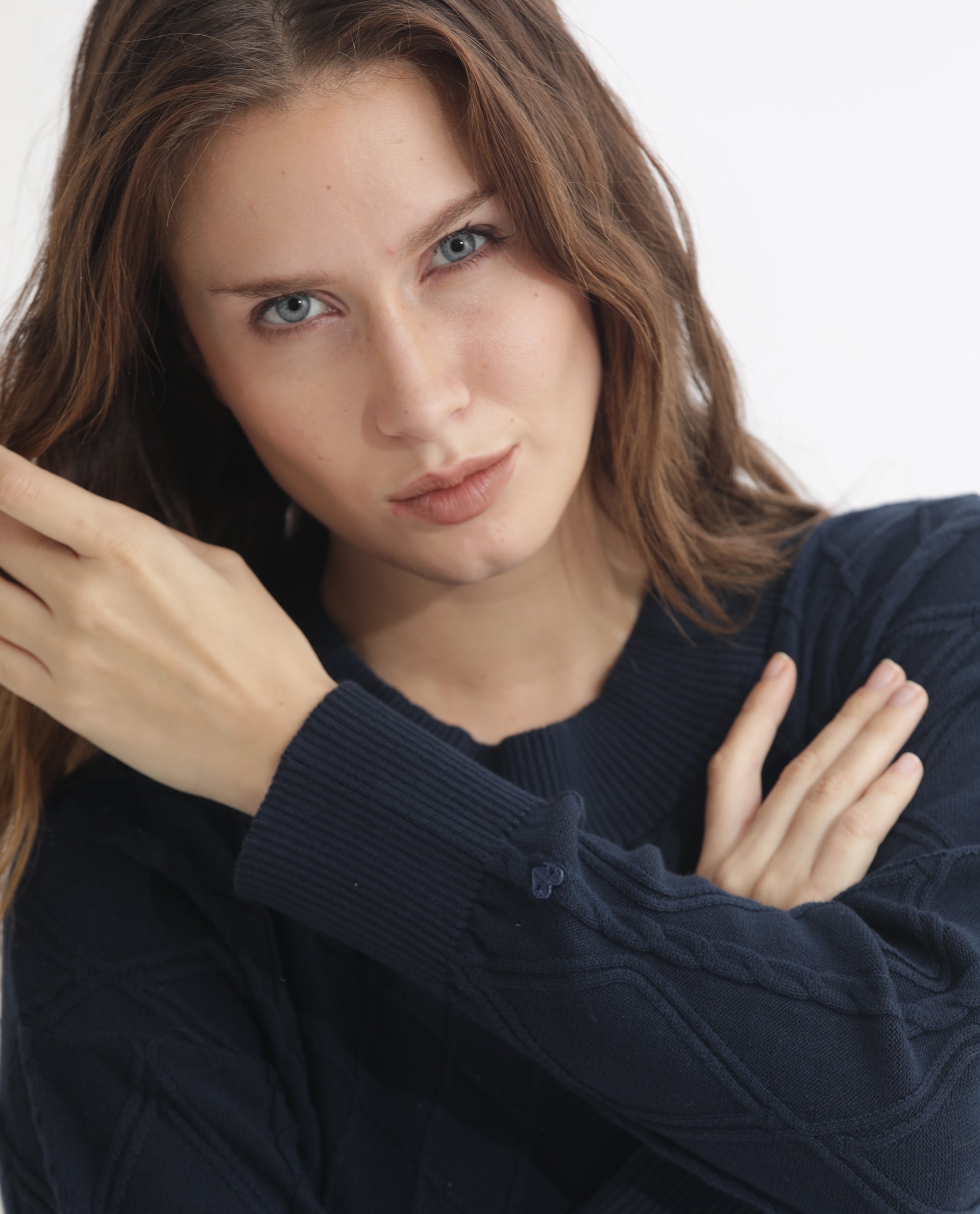 Rareism Women Budd Navy Cotton Fabric Full Sleeves Knee Length Regular Fit Solid Round Neck Sweater