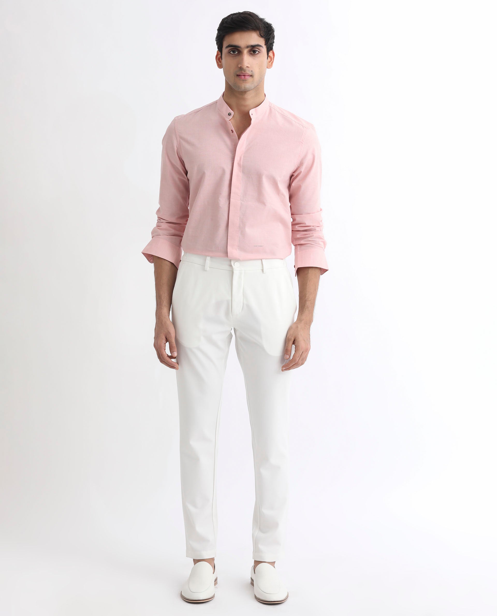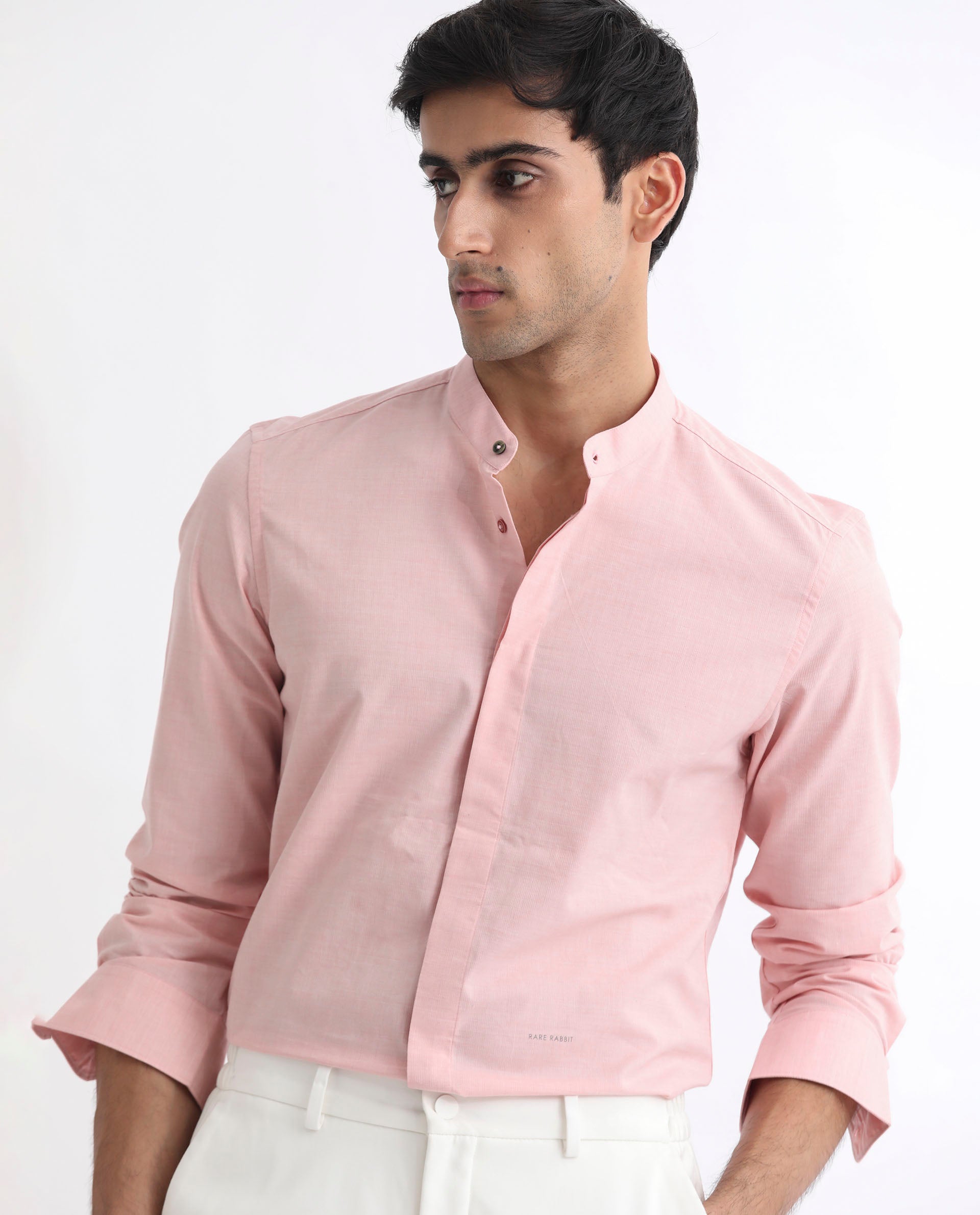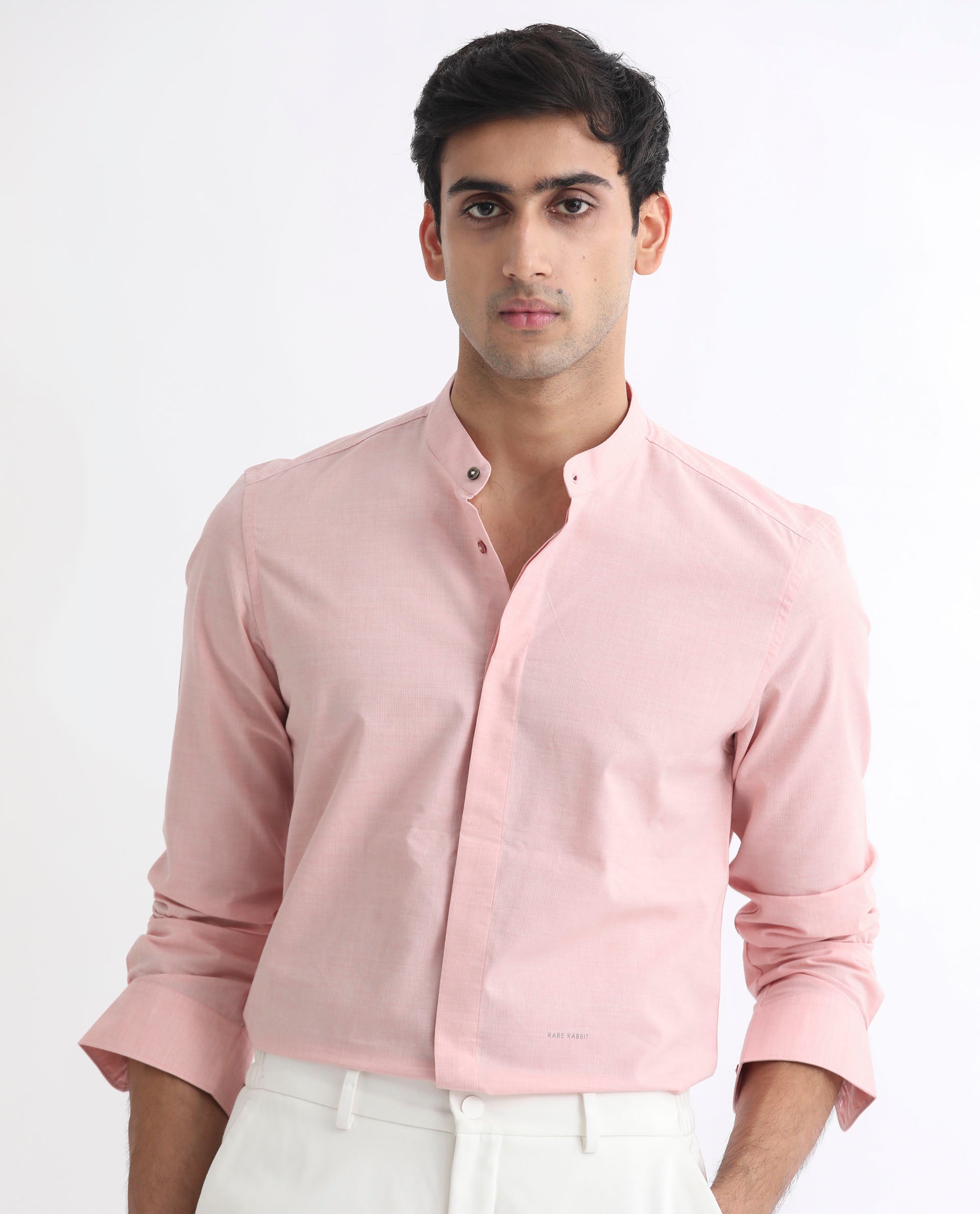 Rare Rabbit Men's Cadmi Light Pink Mandarin Collar Dobby Full Sleeves Solid Shirt