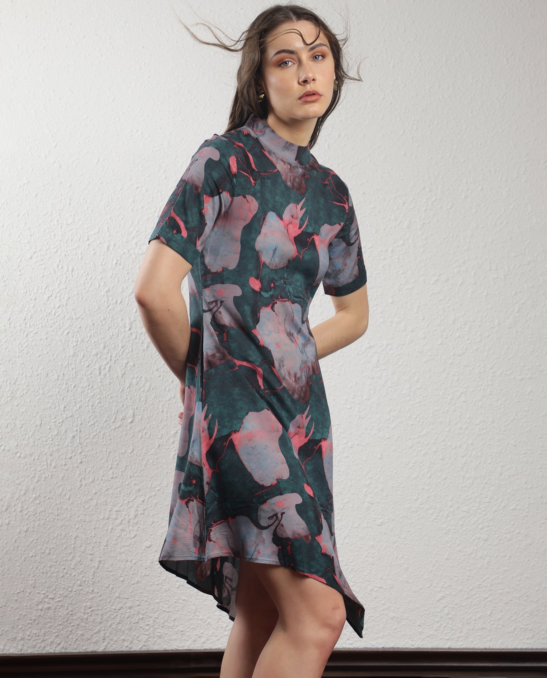 ABSTRACT FLORAL PRINT ASYMMETRIC DRESS