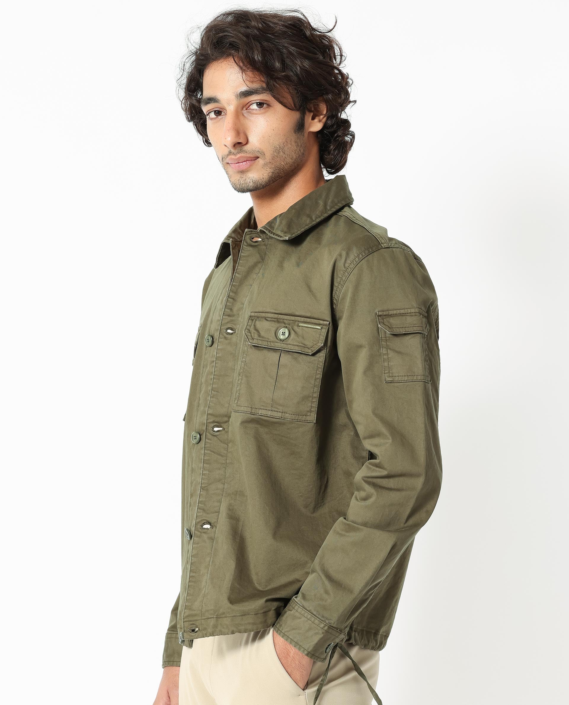 Rare Rabbit Men's Cedro Olive Cotton Lycra Fabric Full Sleeves Dyed Cargo Jacket