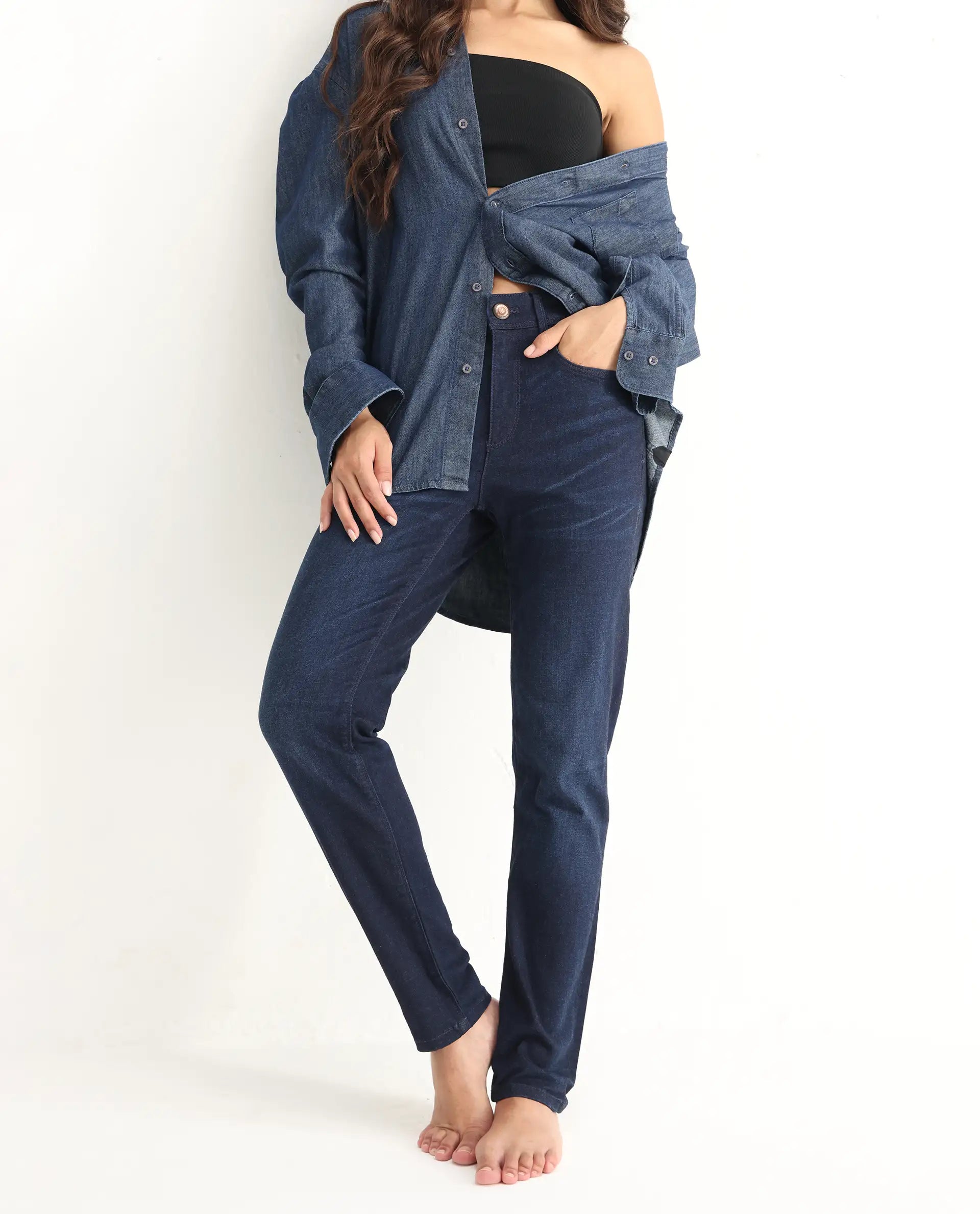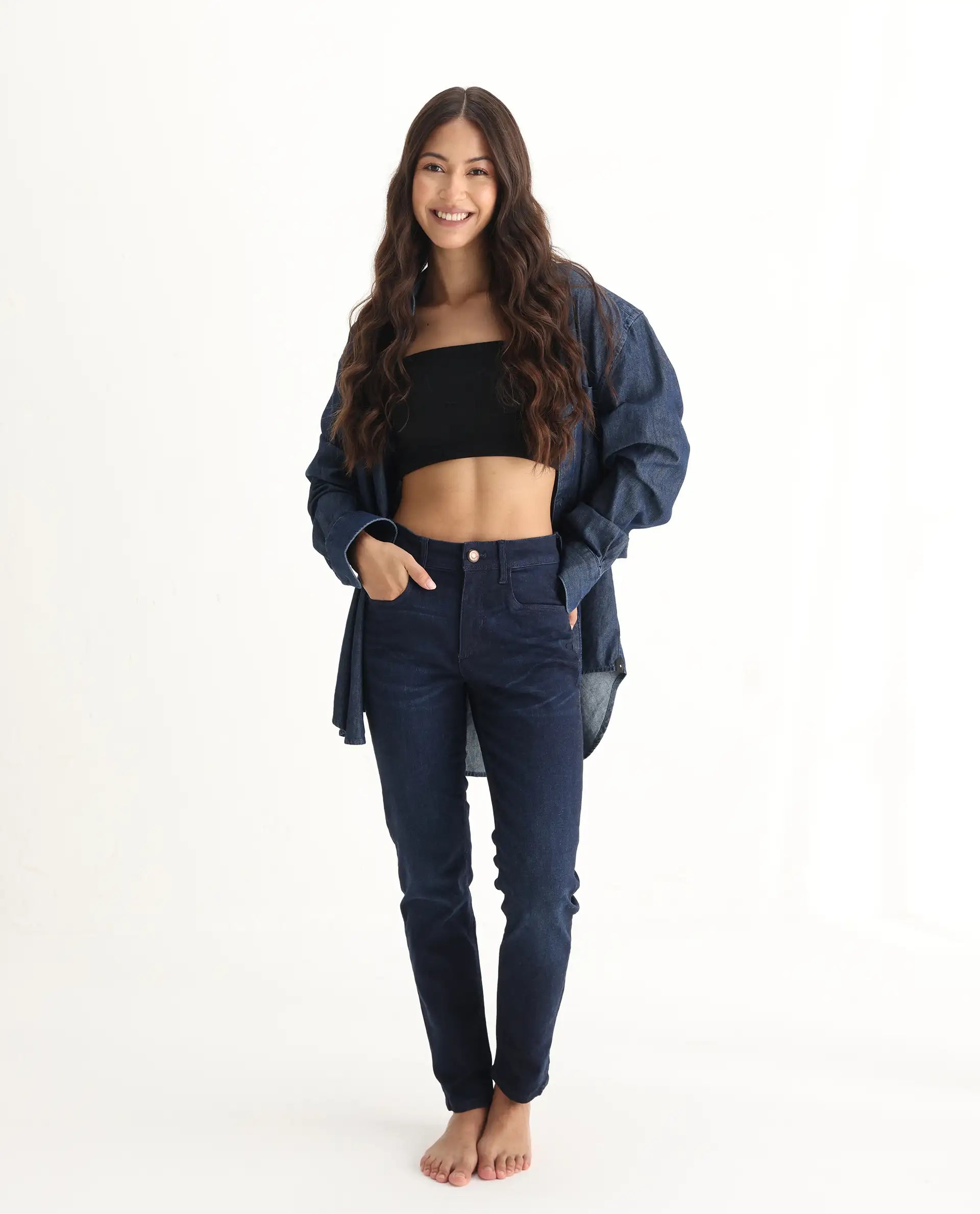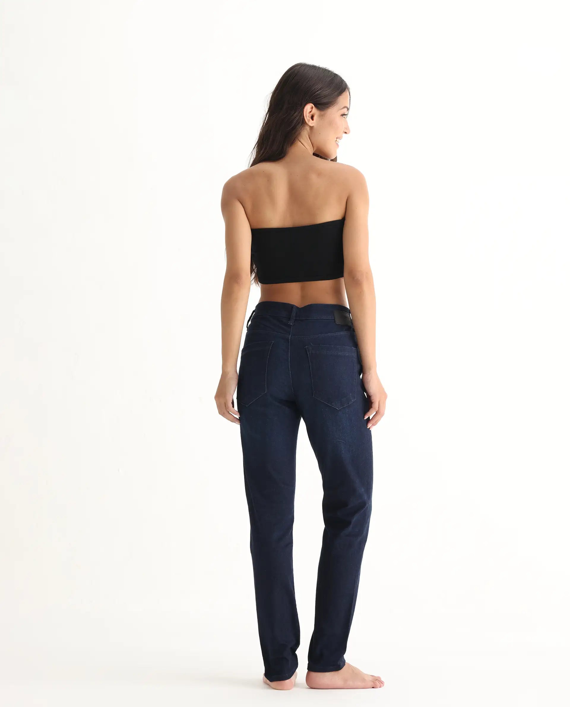 Navy Blue dark wash 5-pocket mid-rise straight fit jeans with personalized detailing's.