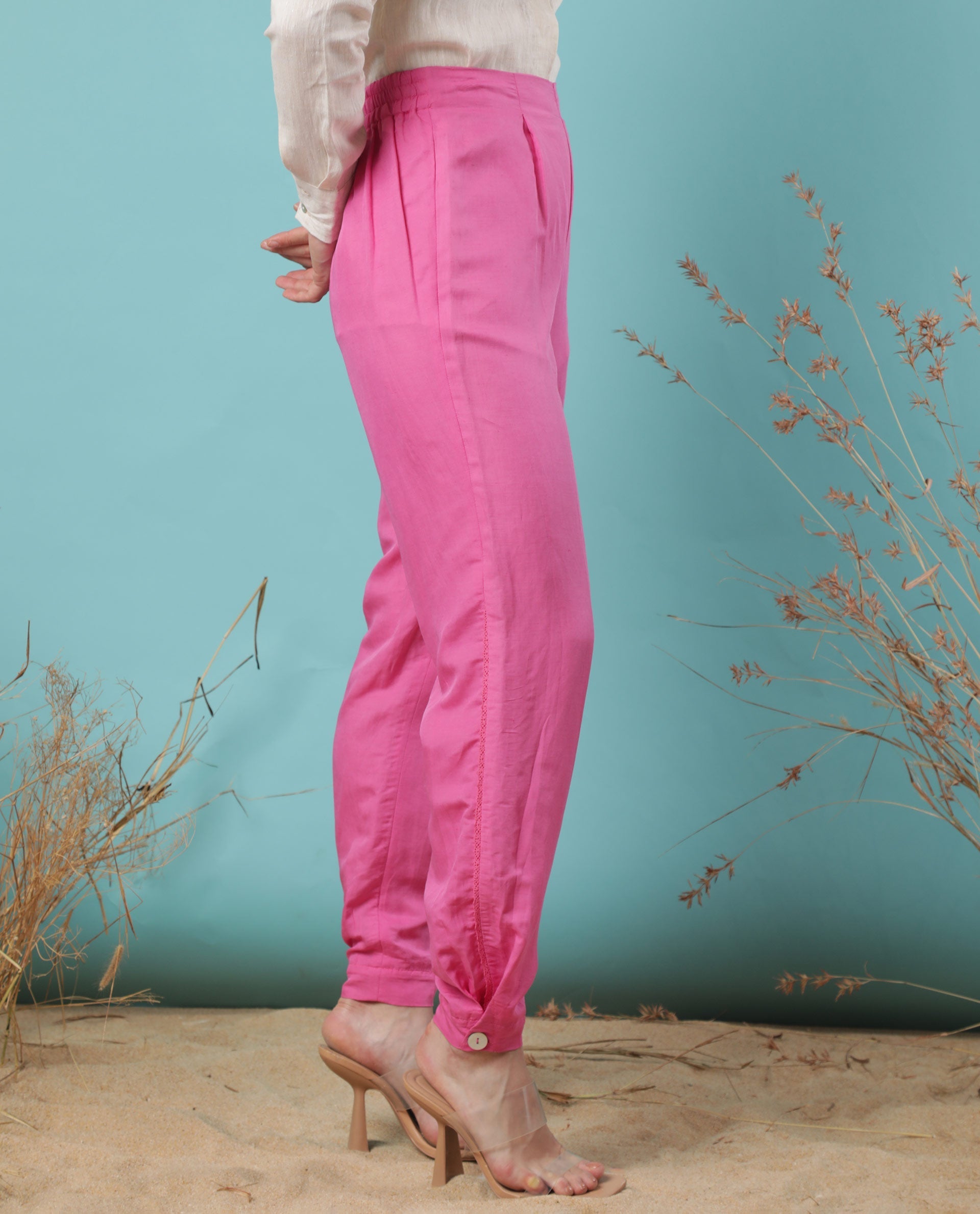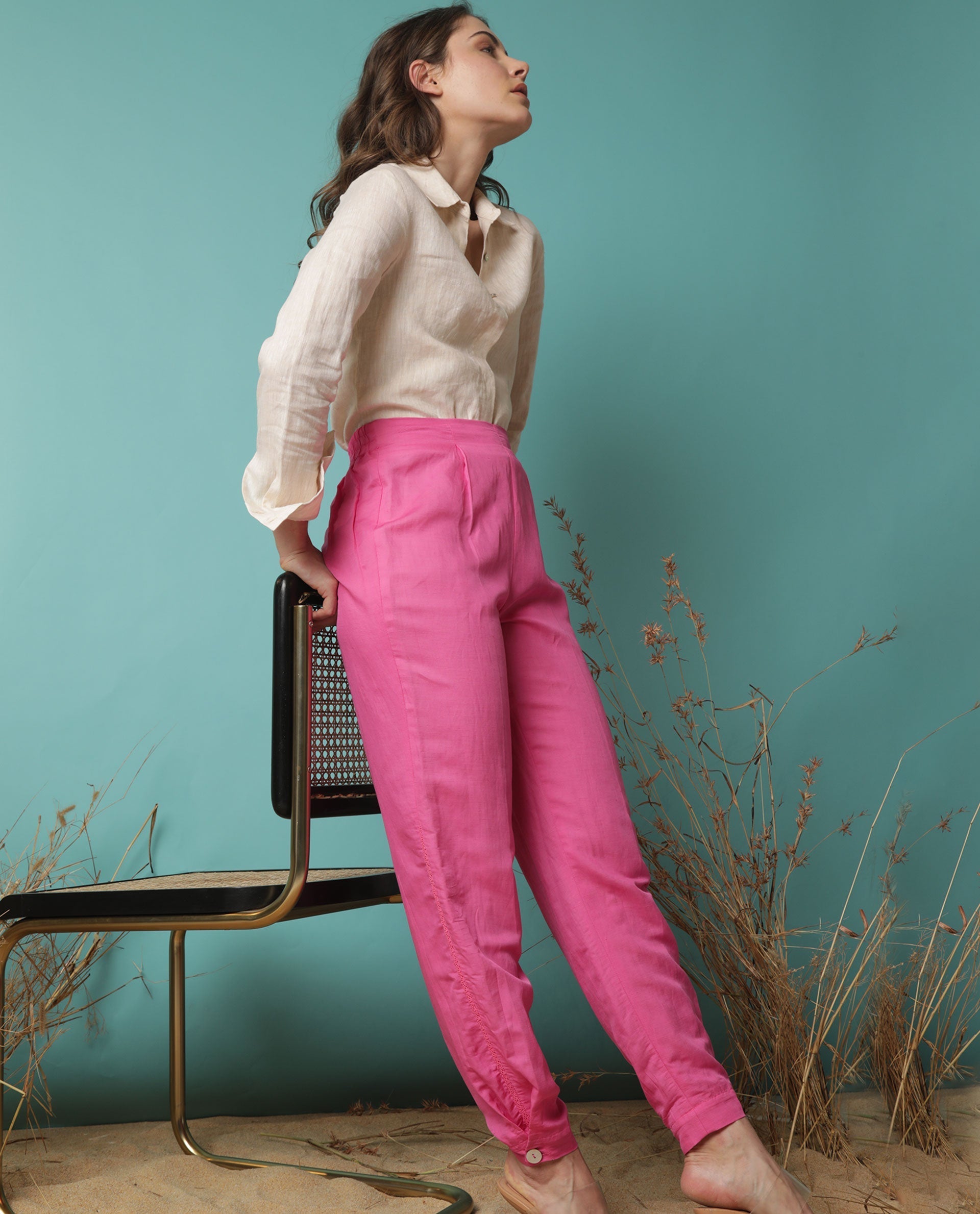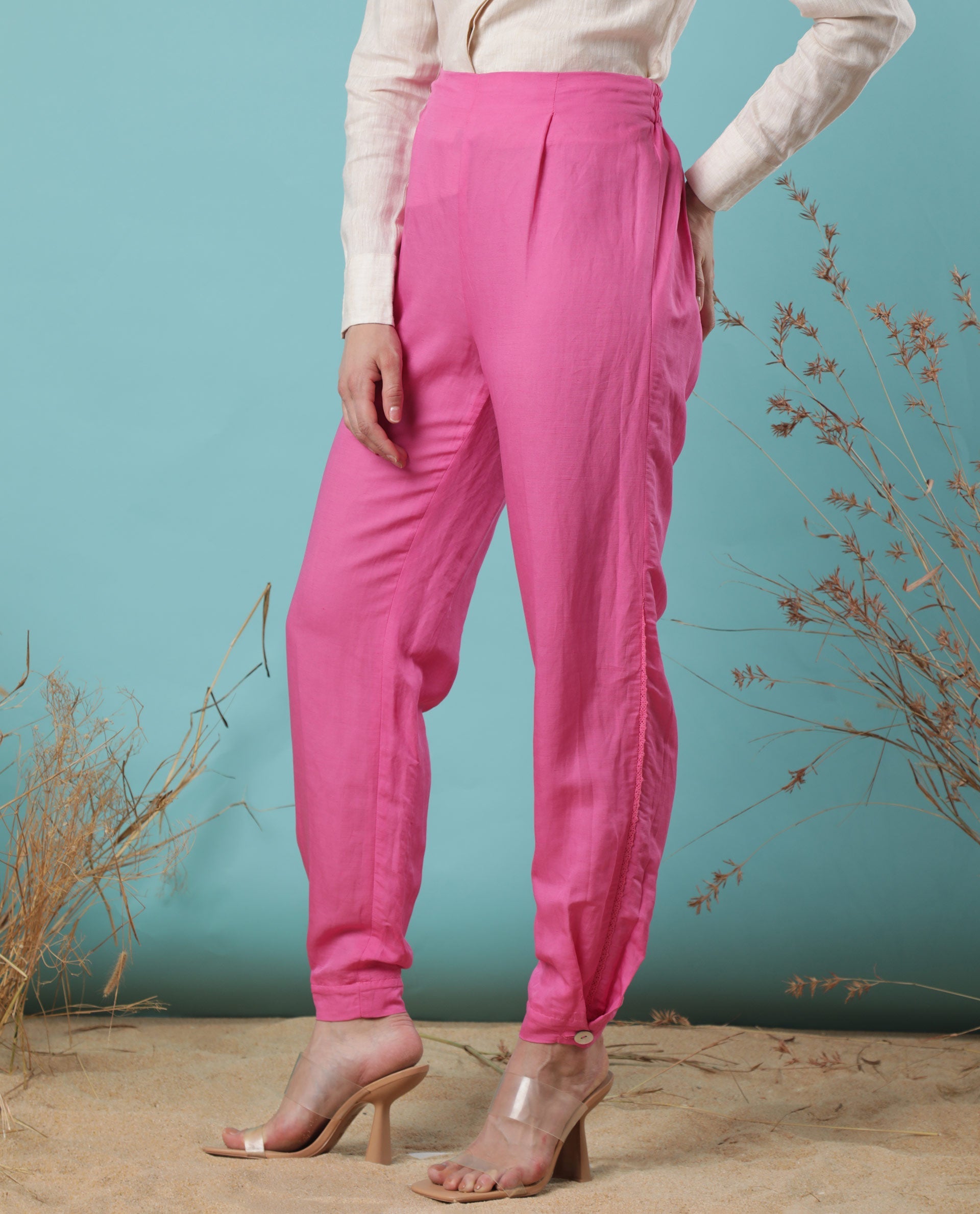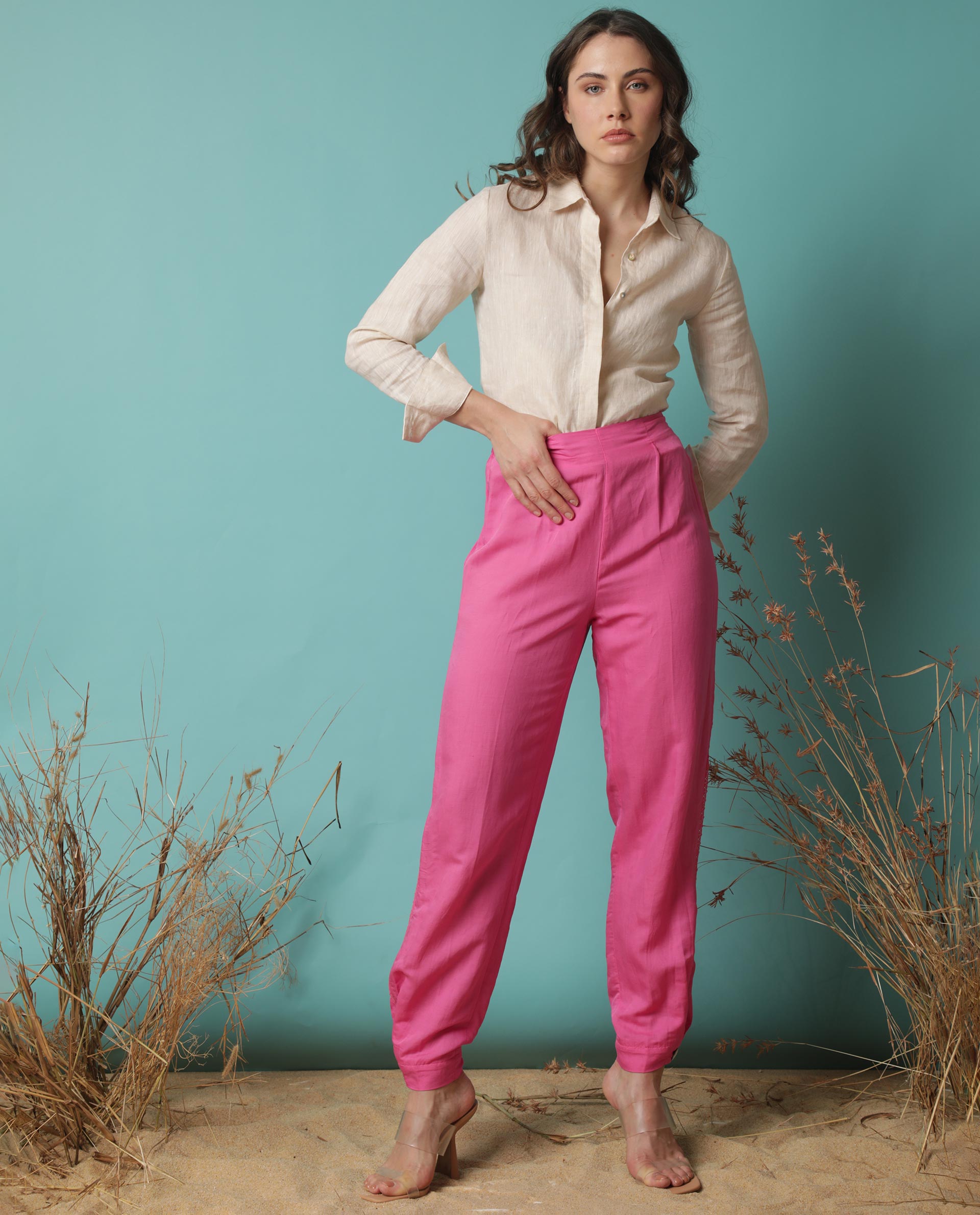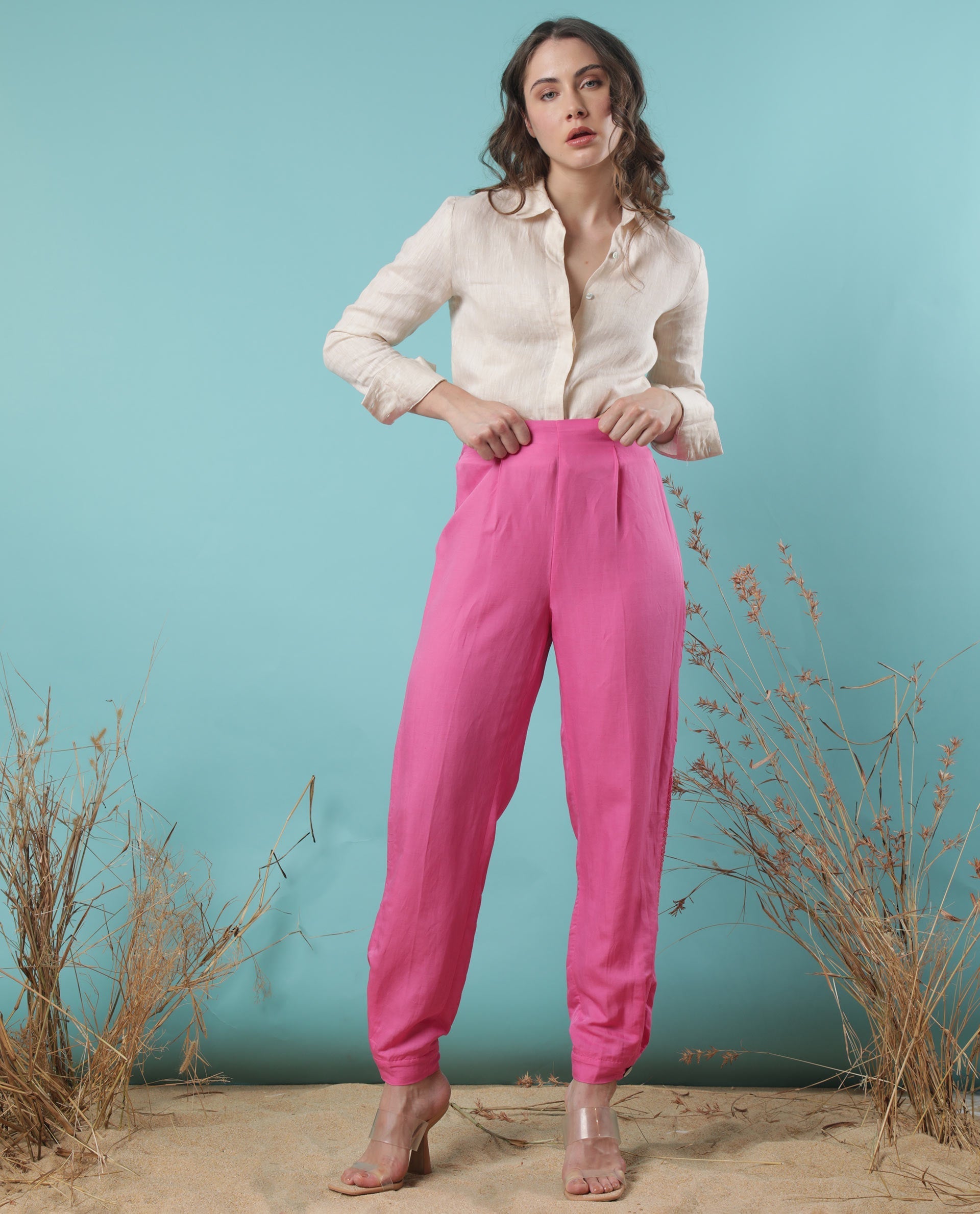 Rareism Women Erin Flouroscent Pink Modal Linen Fabric Tailored Fit Mid Rise Solid Ankle Length Trousers
