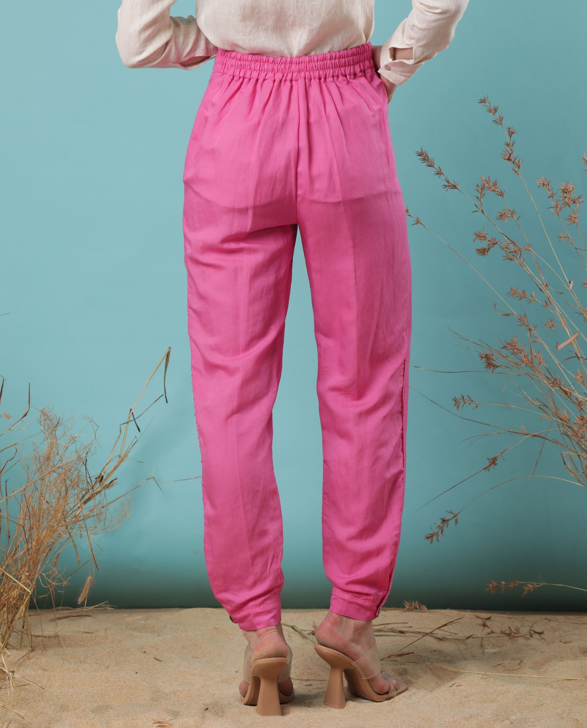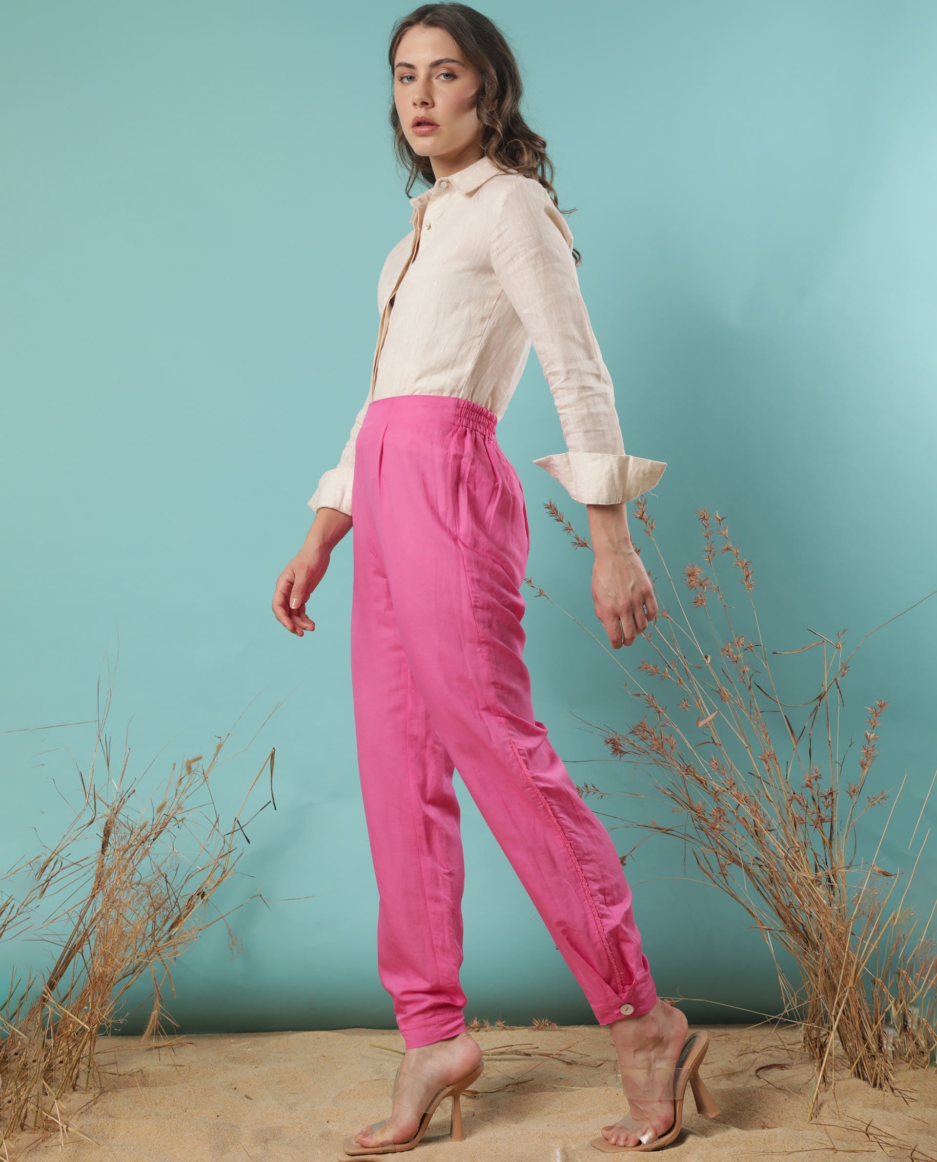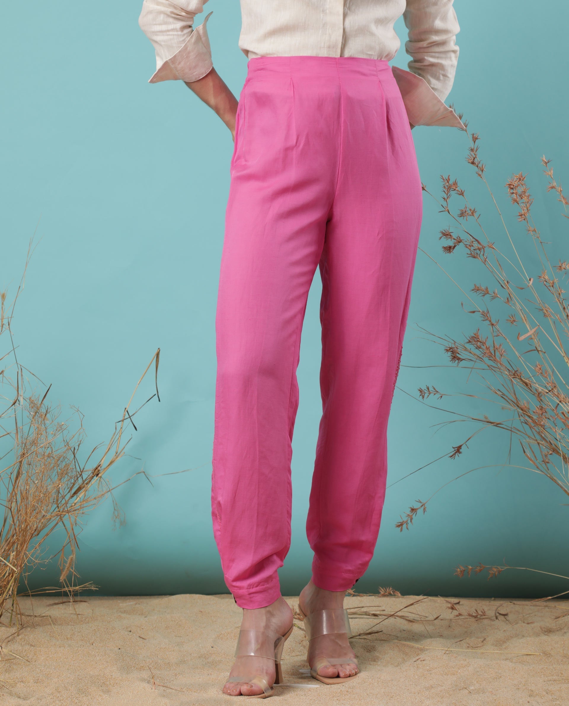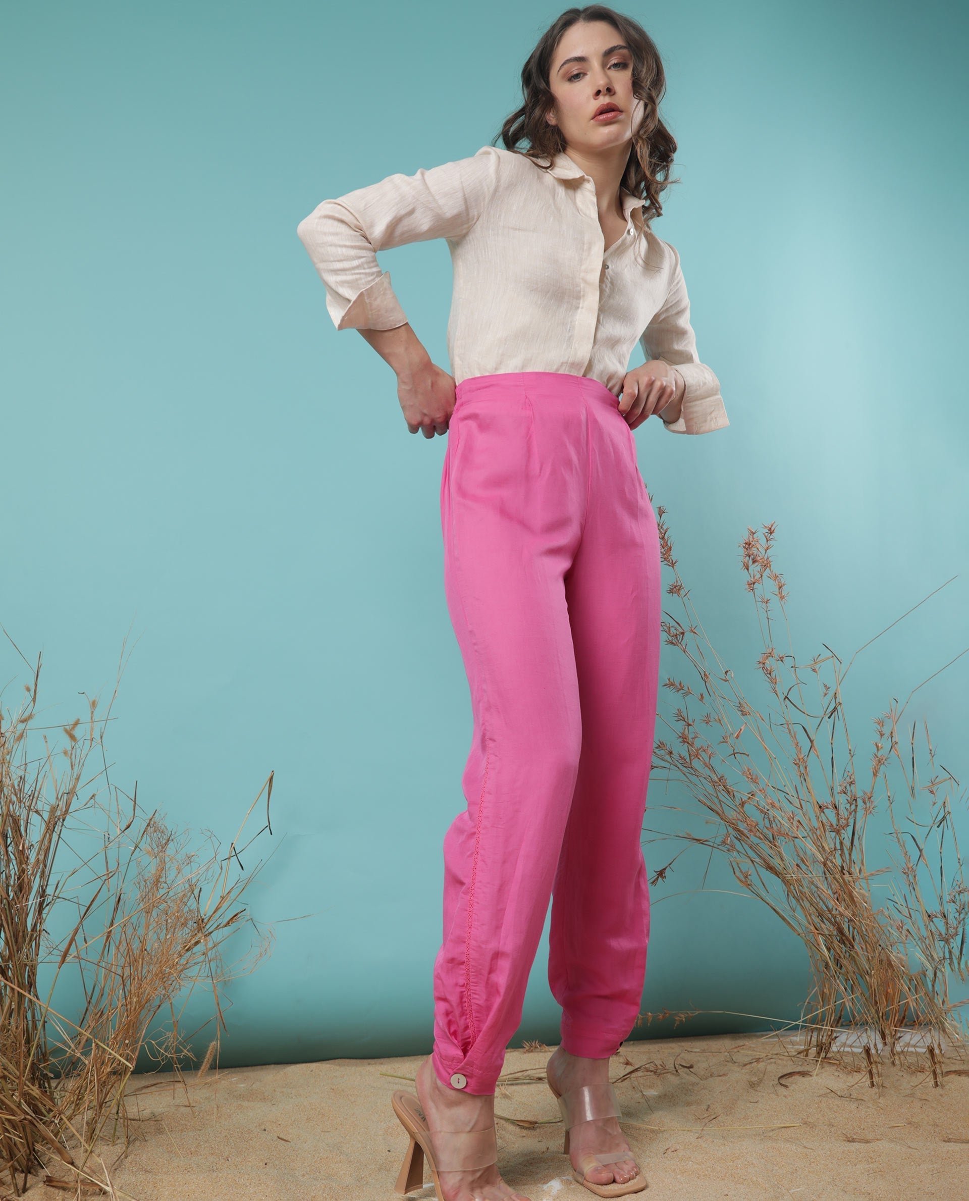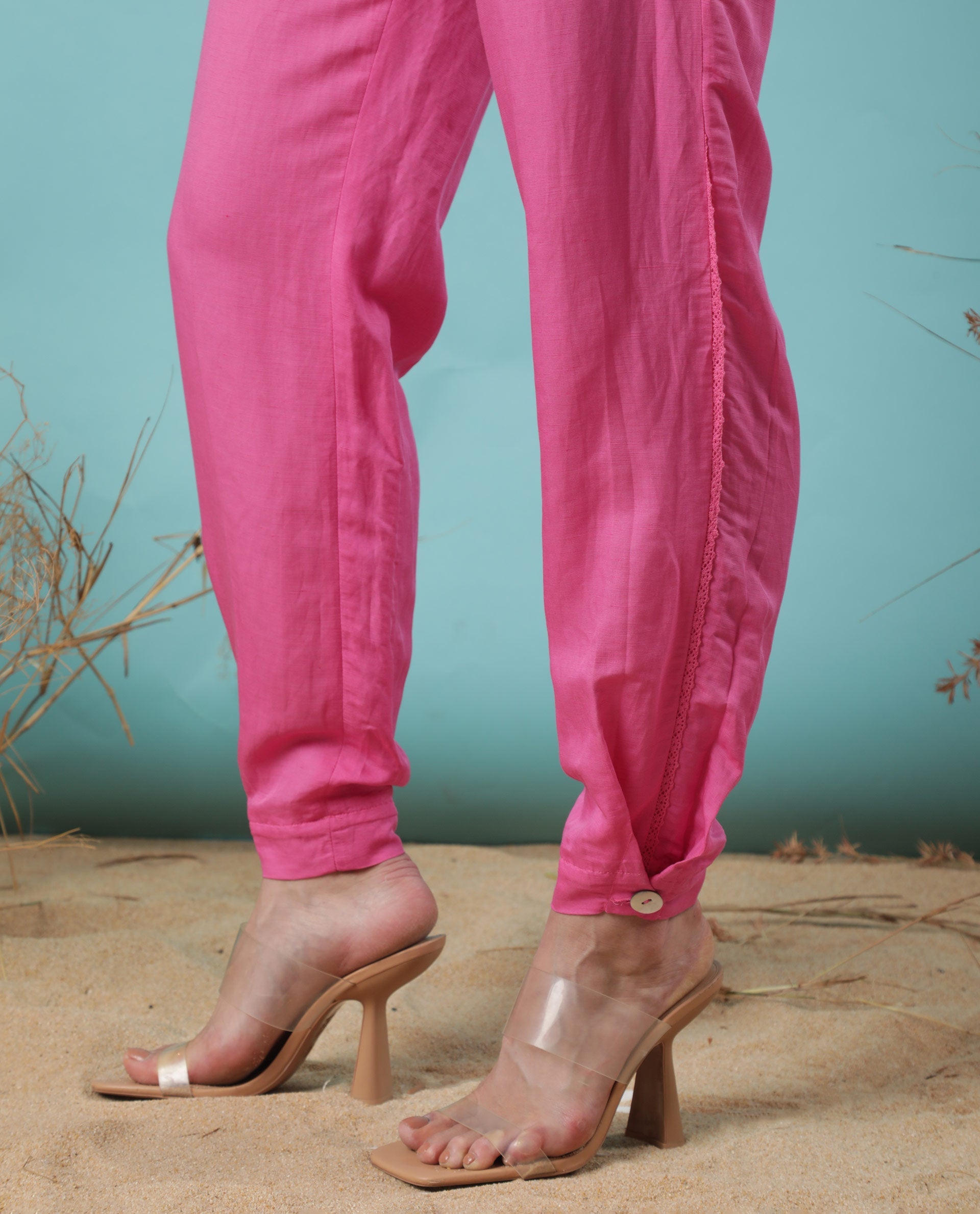 Rareism Women Erin Flouroscent Pink Modal Linen Fabric Tailored Fit Mid Rise Solid Ankle Length Trousers