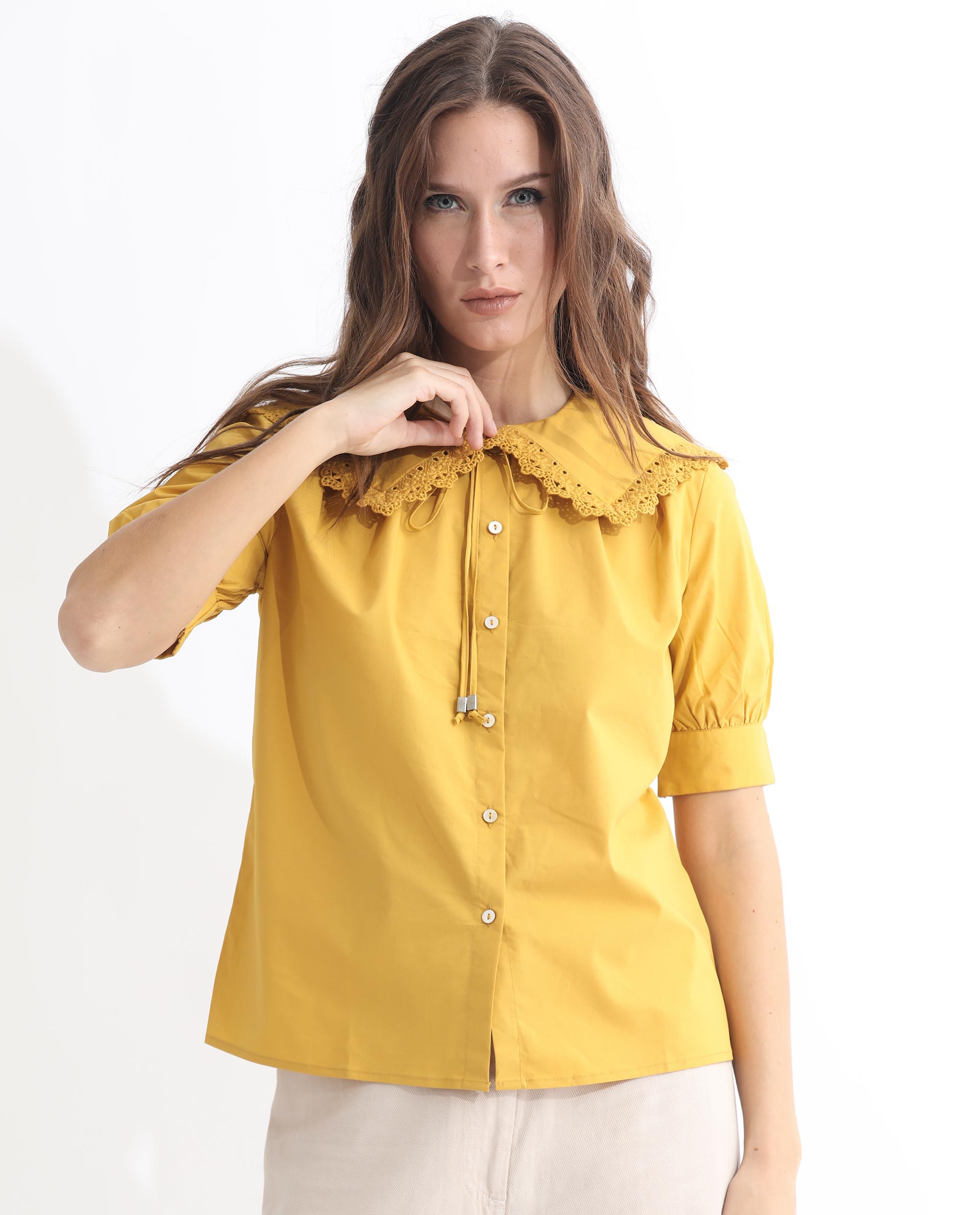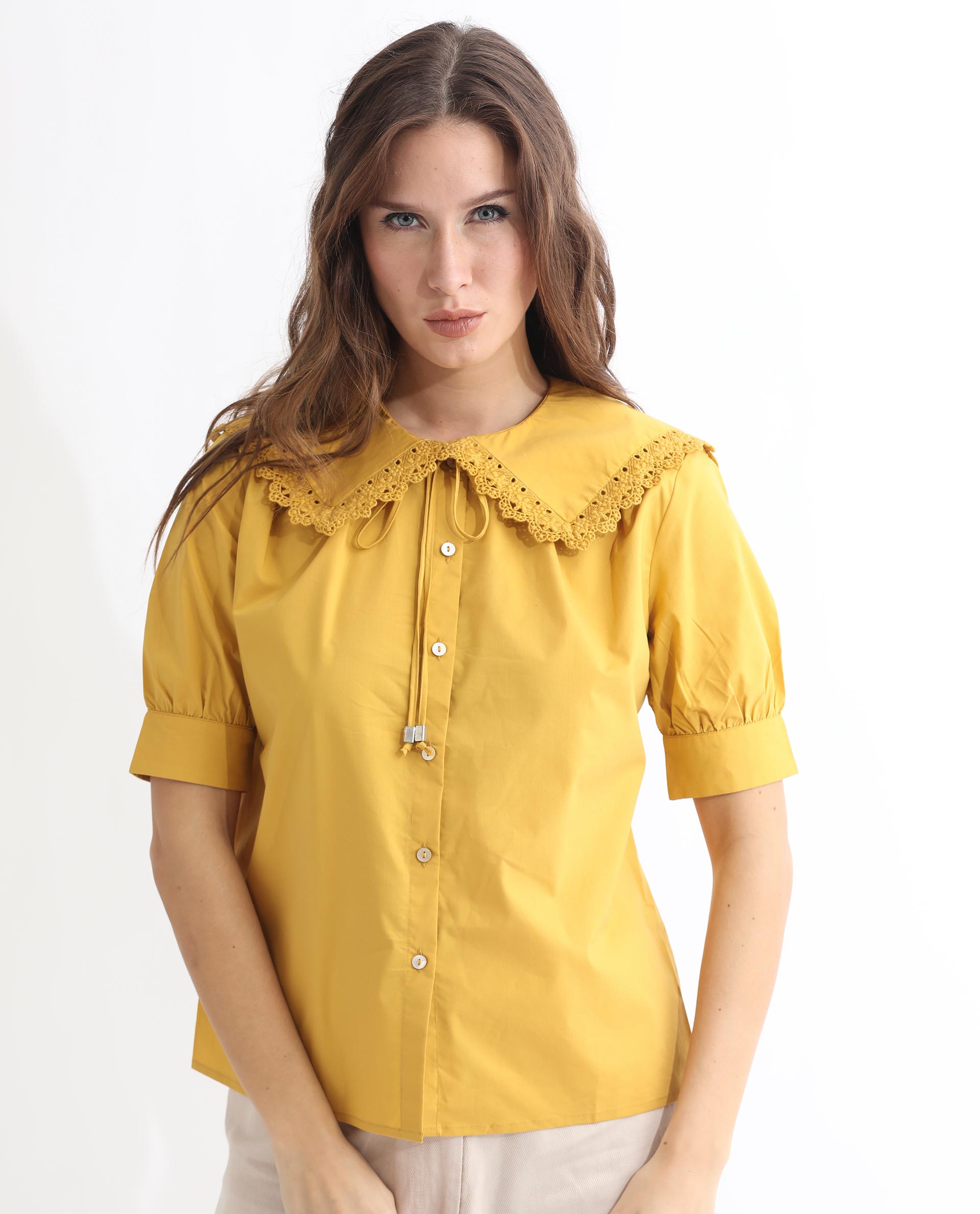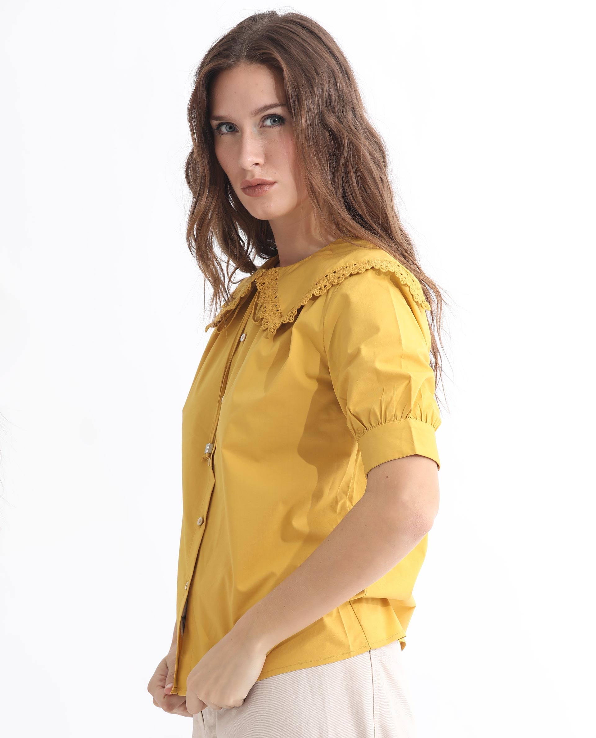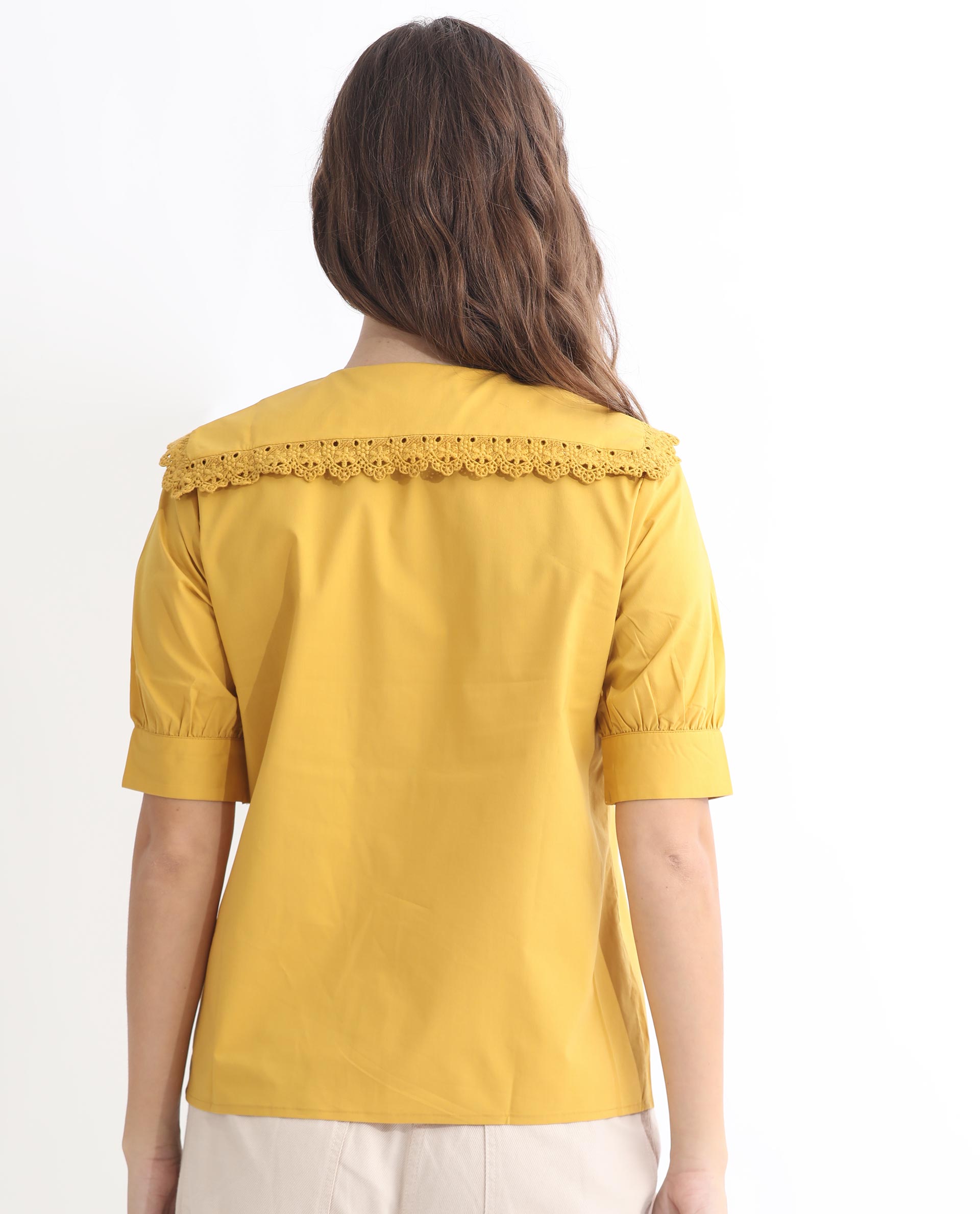 Rareism Women Farse Dark Yellow Polyester Fabric Regular Fit Shirt Collar Half Sleeves Solid Top