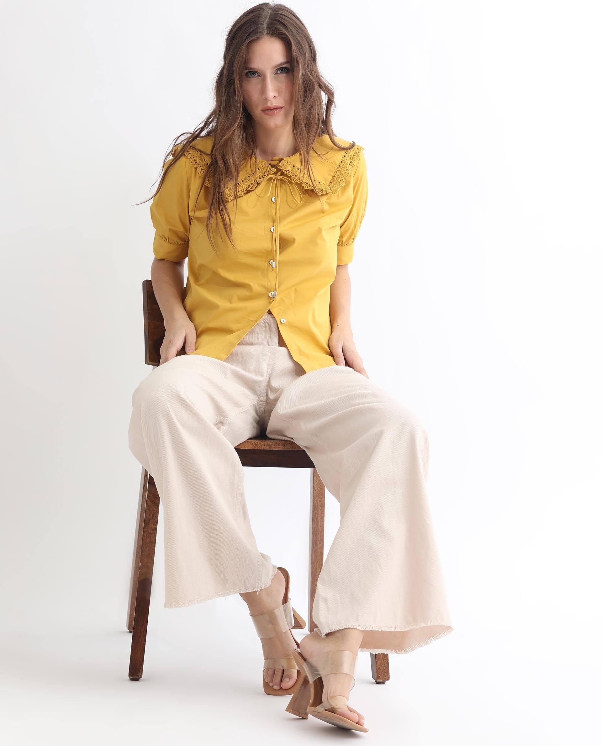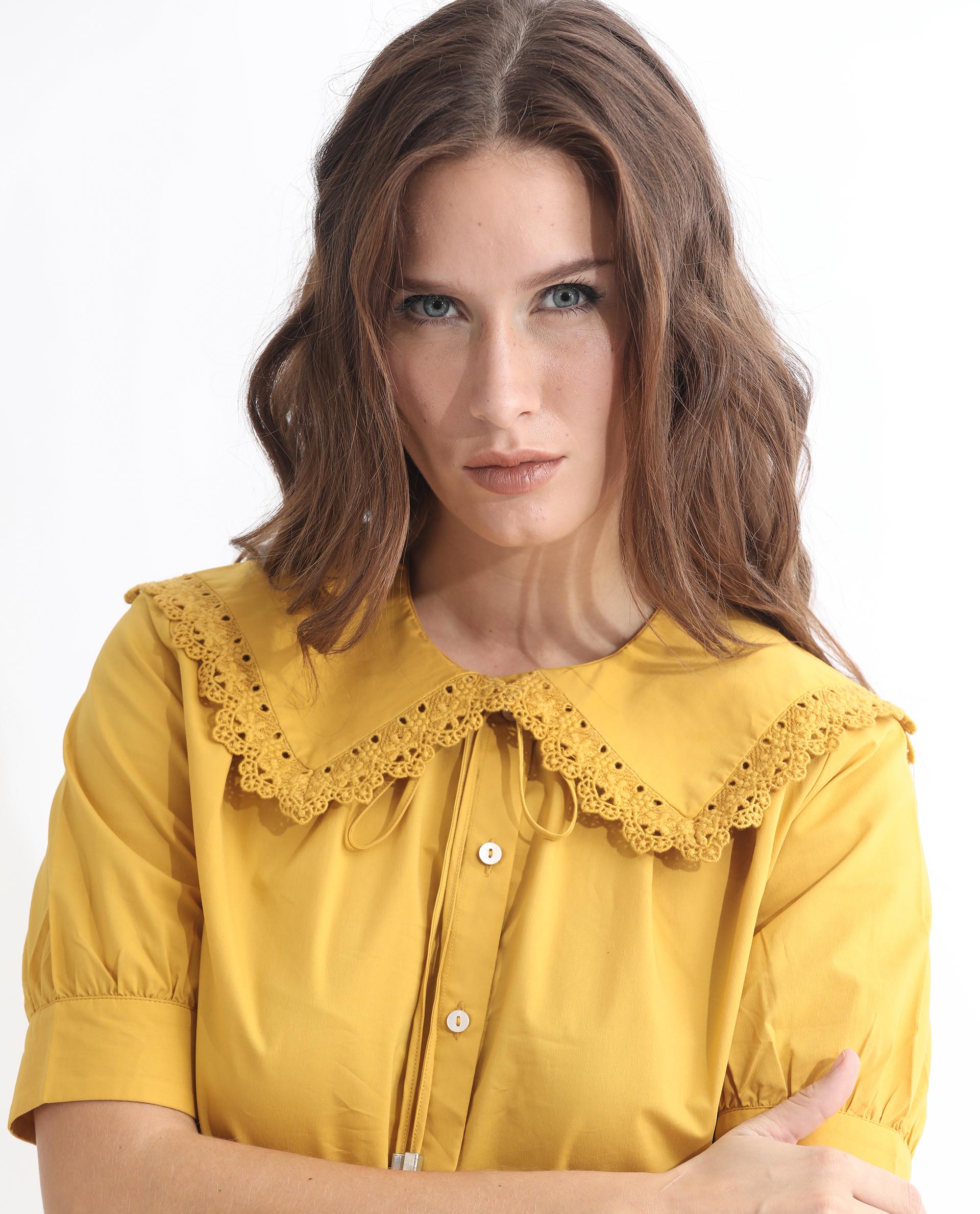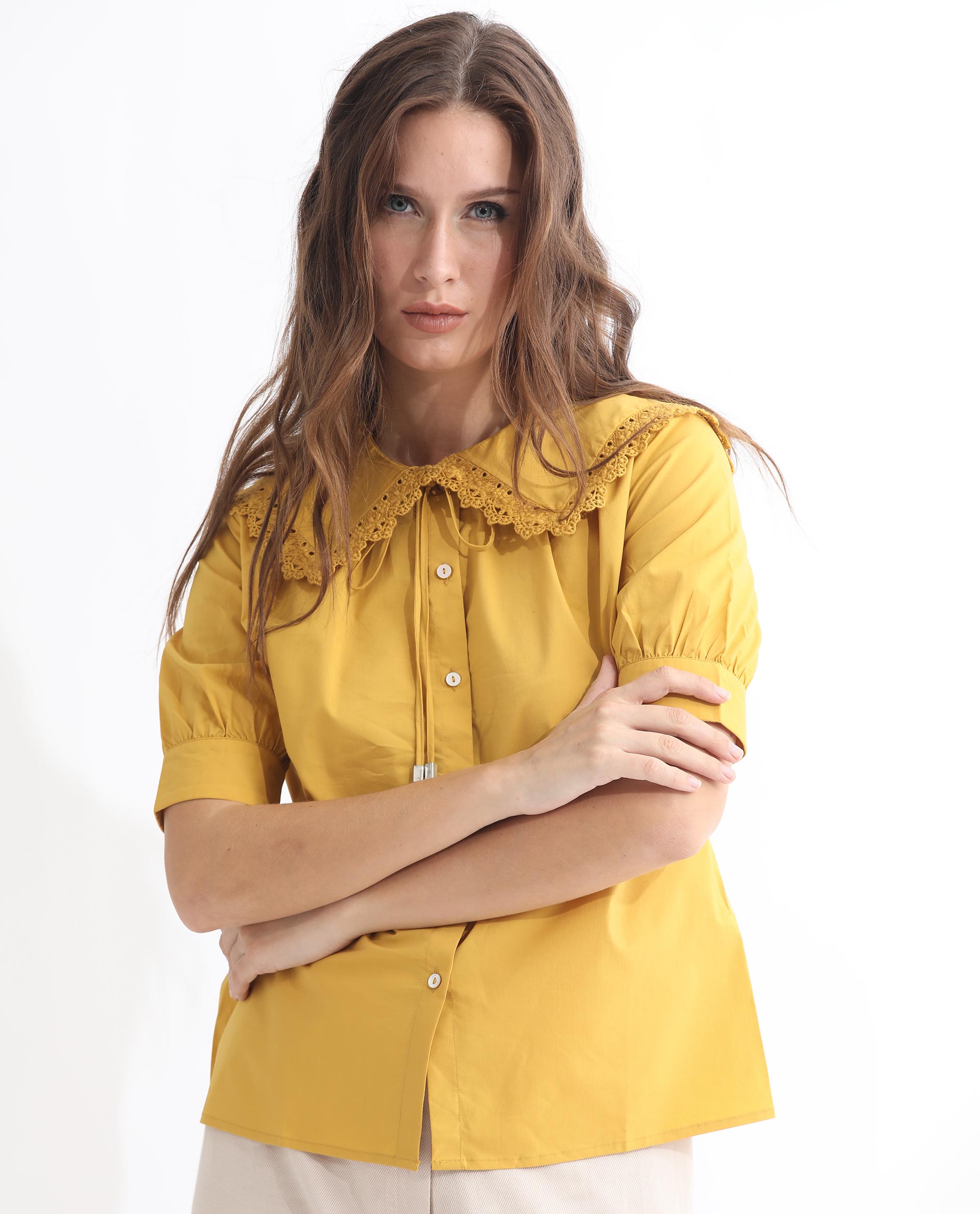 Rareism Women Farse Dark Yellow Polyester Fabric Regular Fit Shirt Collar Half Sleeves Solid Top