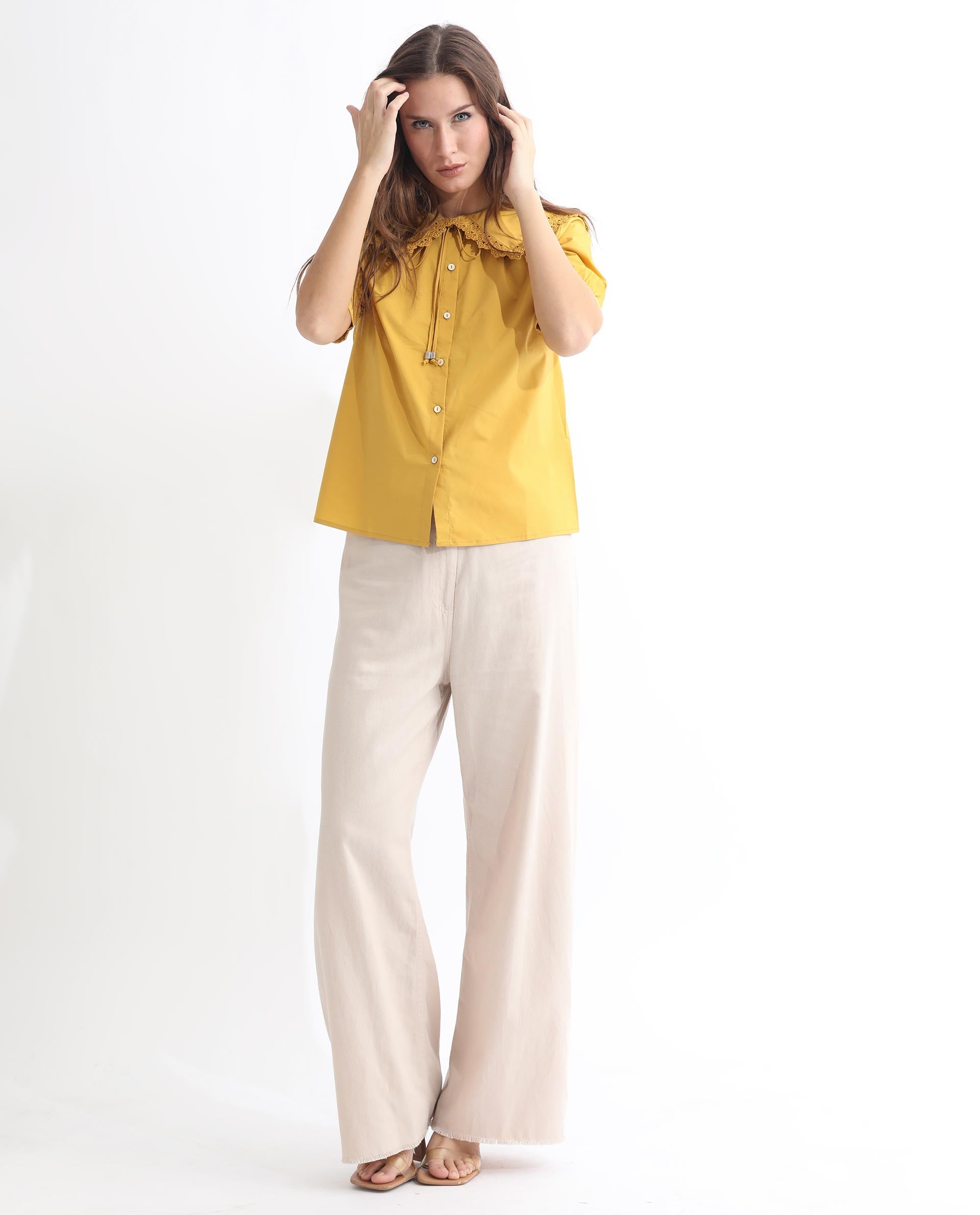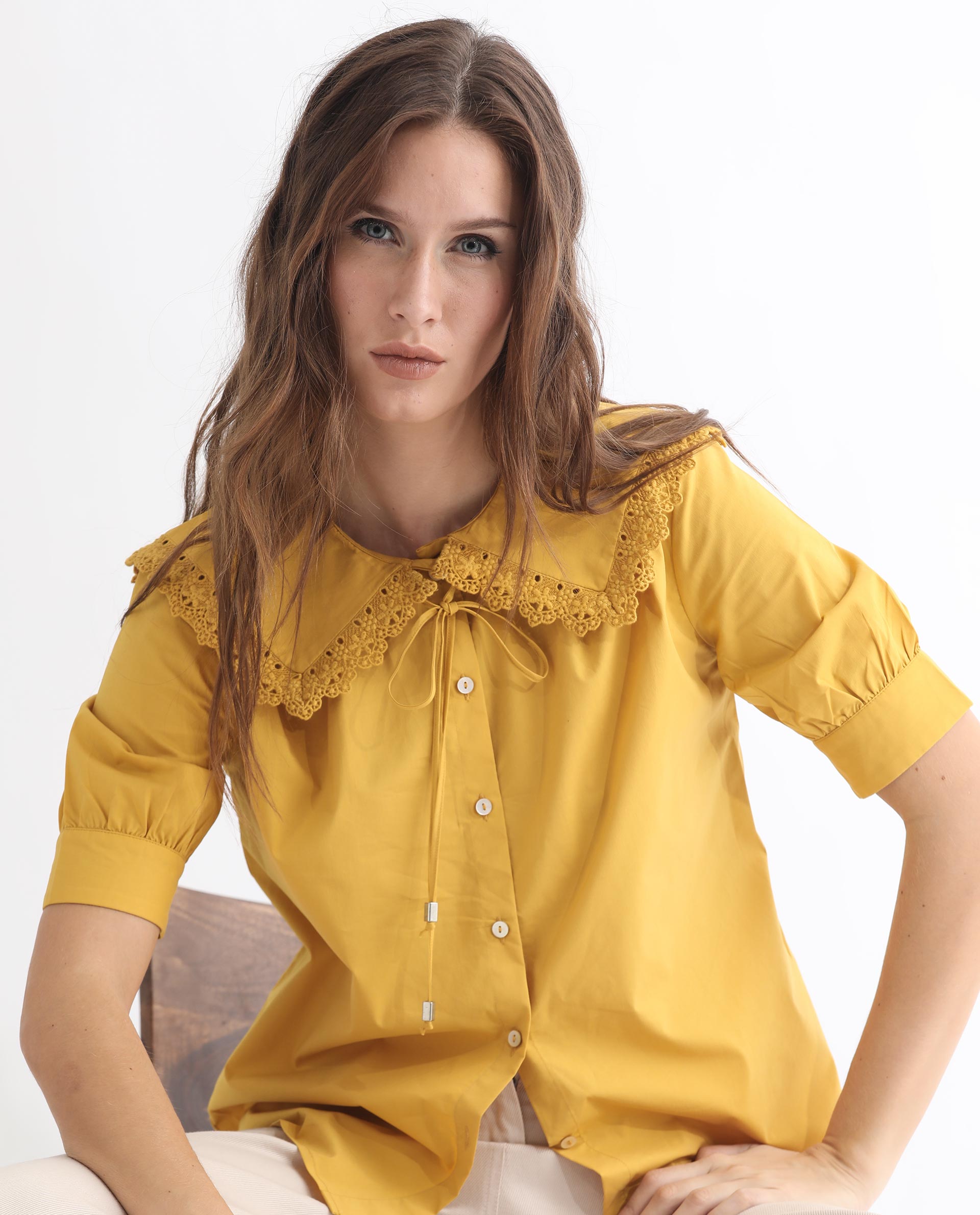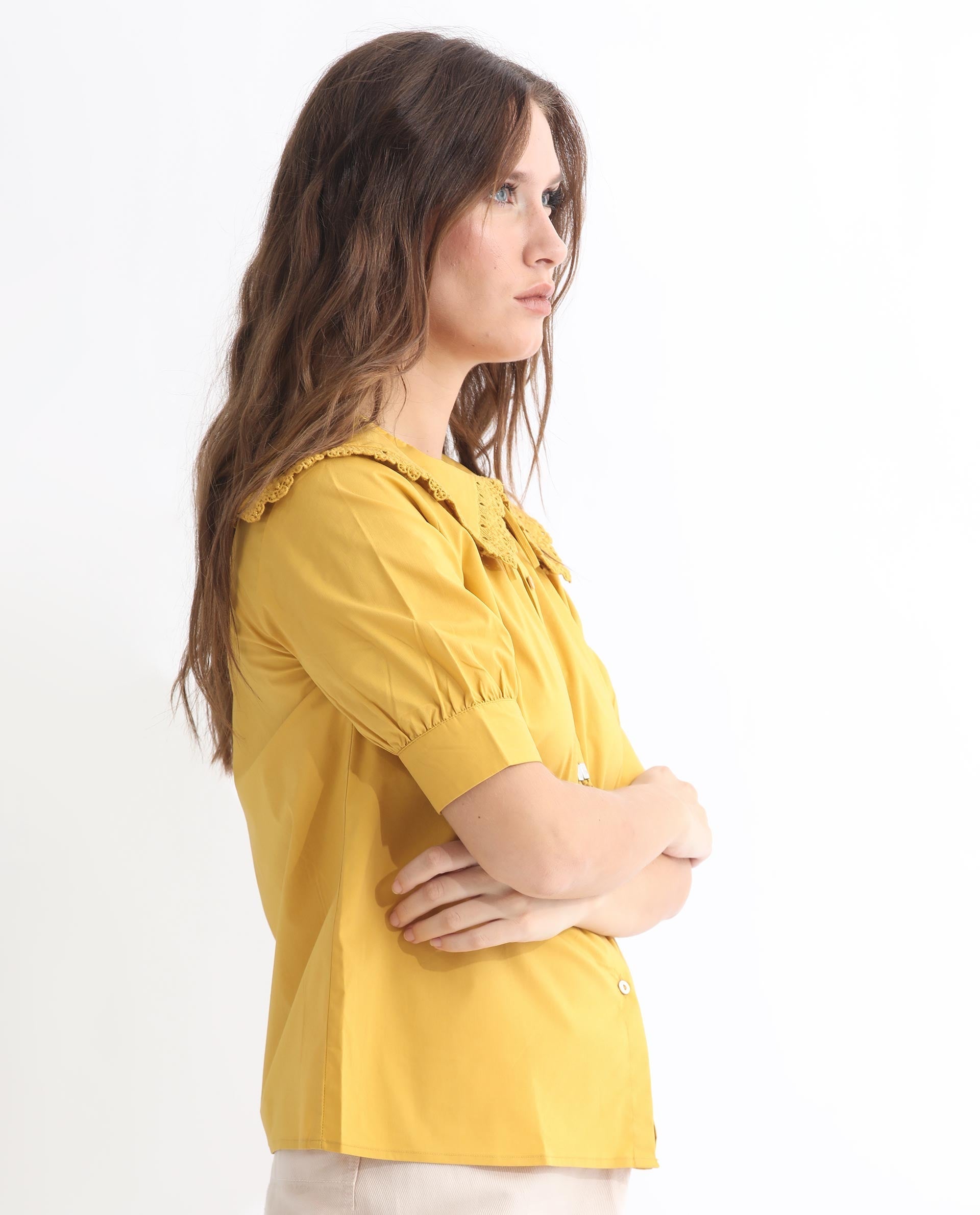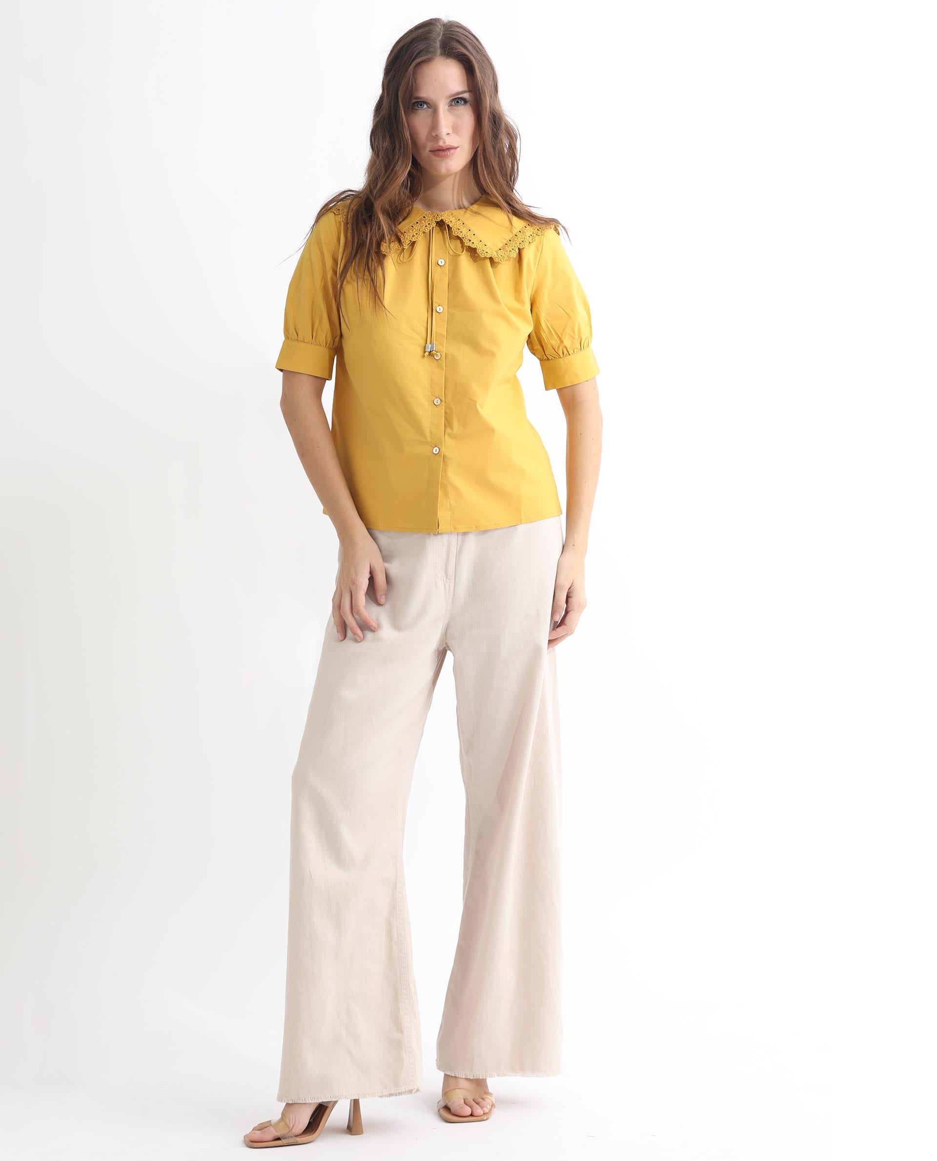 Rareism Women Farse Dark Yellow Polyester Fabric Regular Fit Shirt Collar Half Sleeves Solid Top