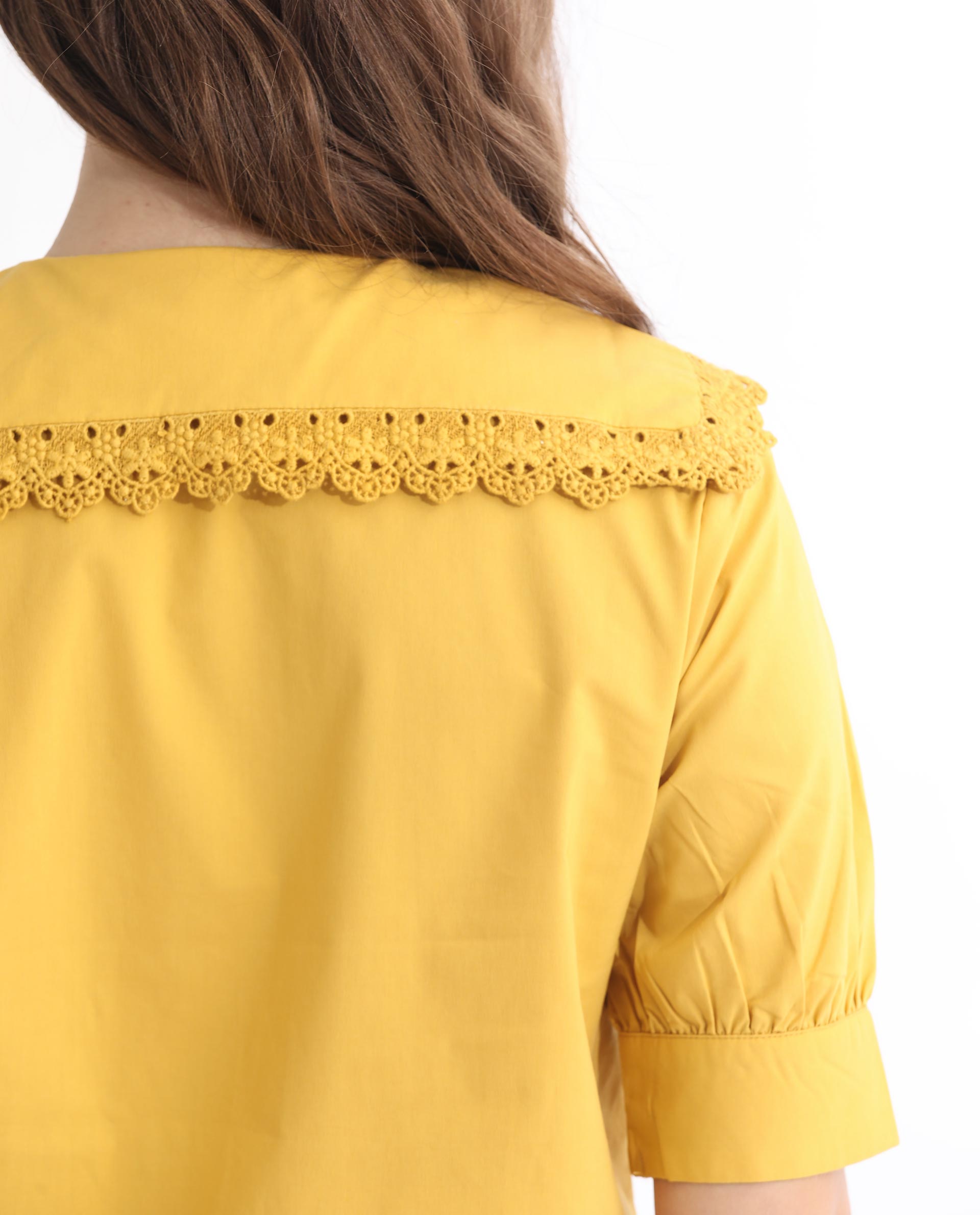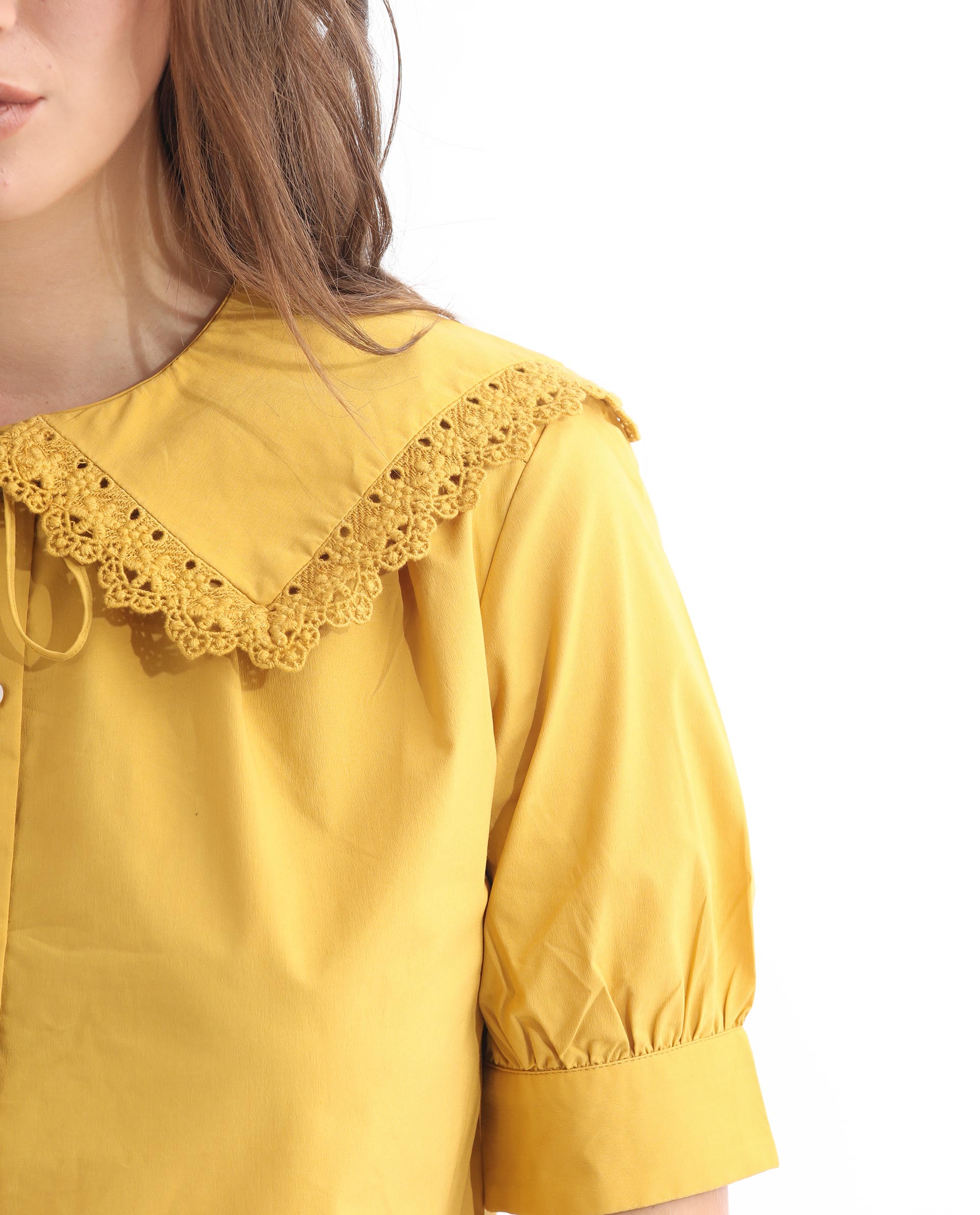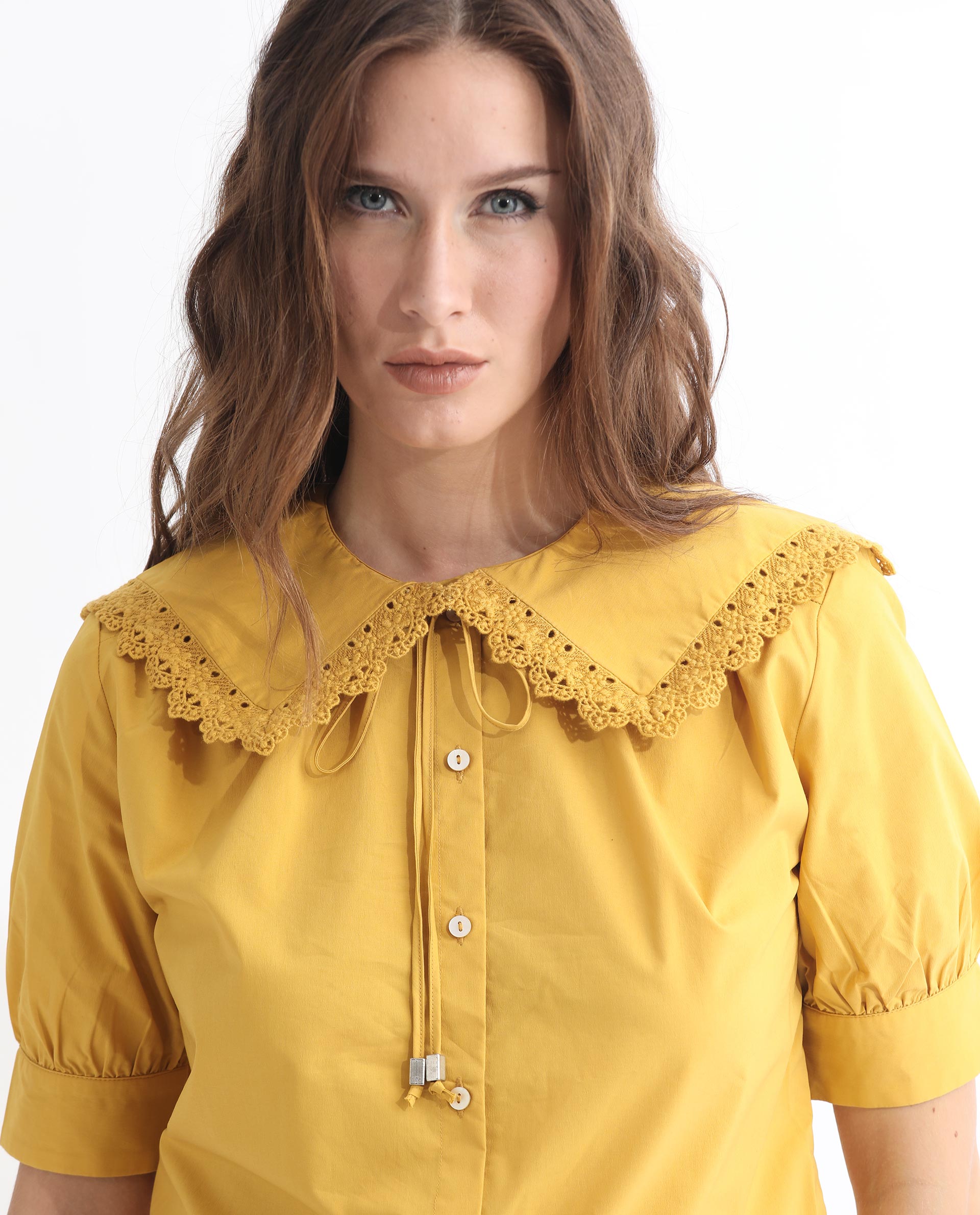 - with puffed sleeves and extended collar with lace and tie up detailing.