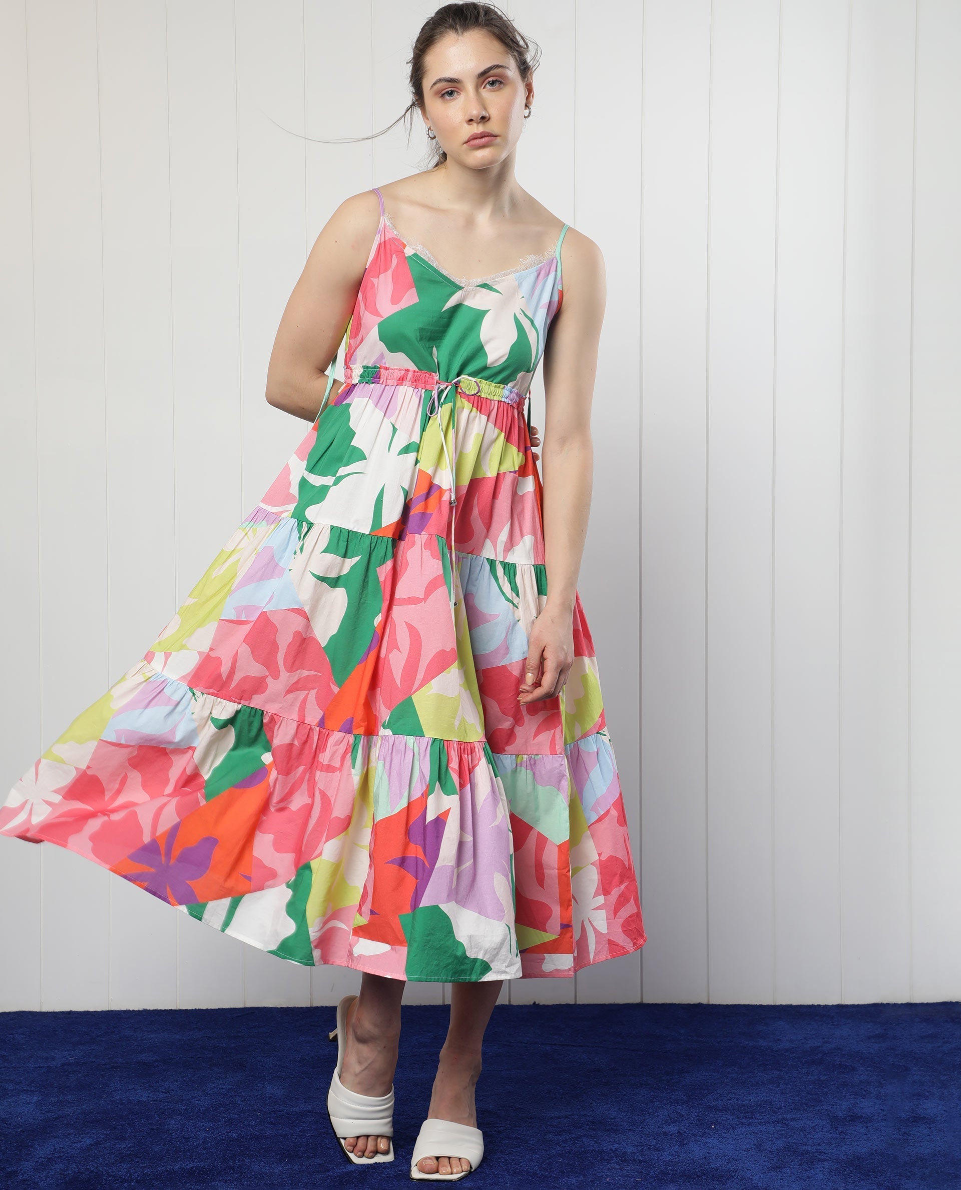 Rareism Women Grace Multi Cotton Fabric Sleeveless V-Neck Shoulder Straps Regular Fit Floral Print Knee Length Tiered Dress