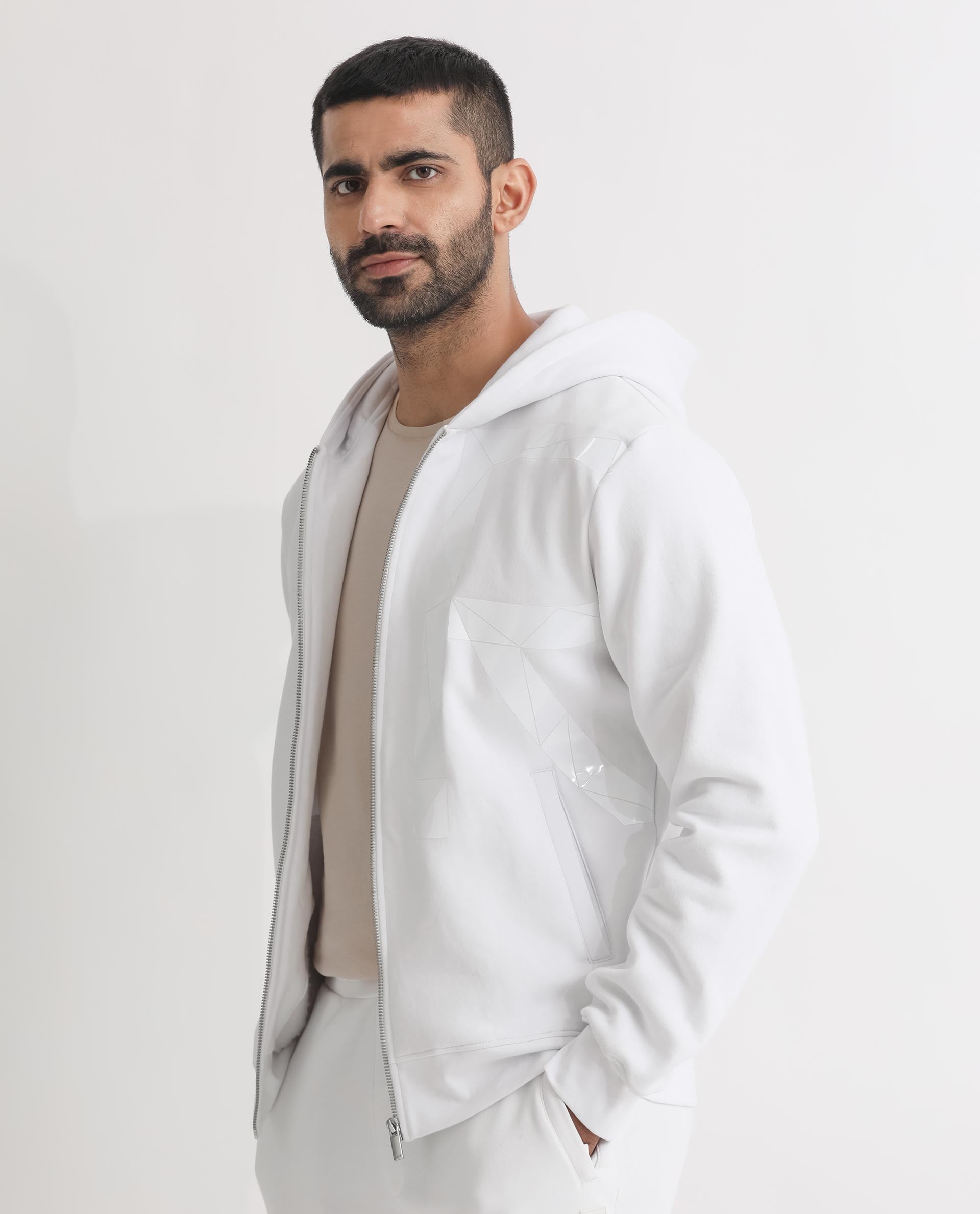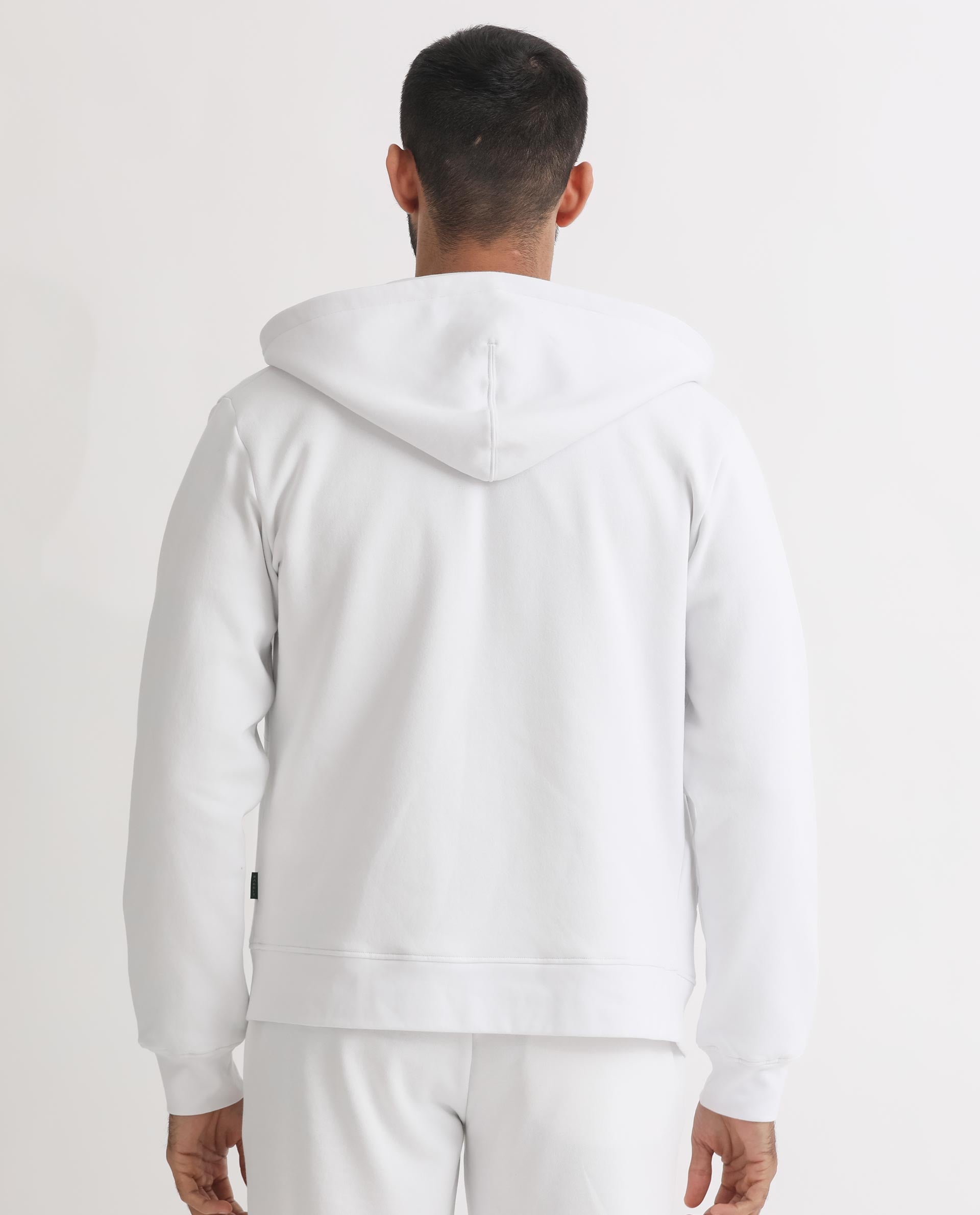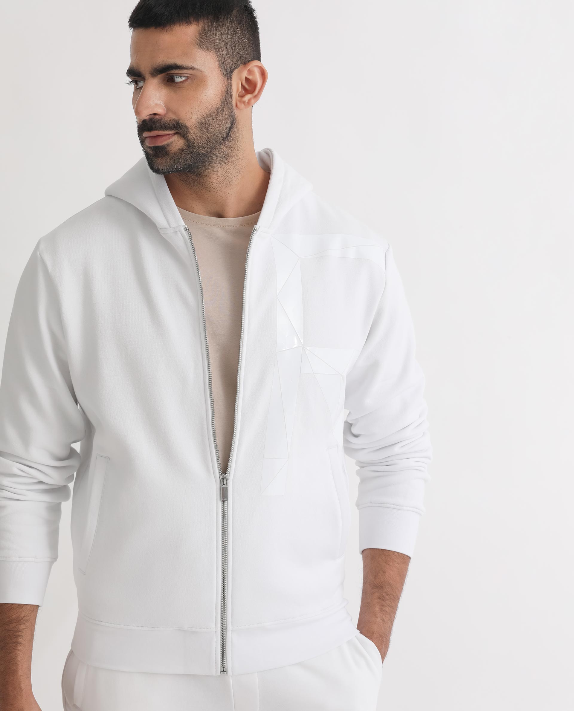 Rare Rabbit Men's Kaden White Cotton Polyester Fabric Full Sleeves Placement Foil Print Hooded Sweatshirt