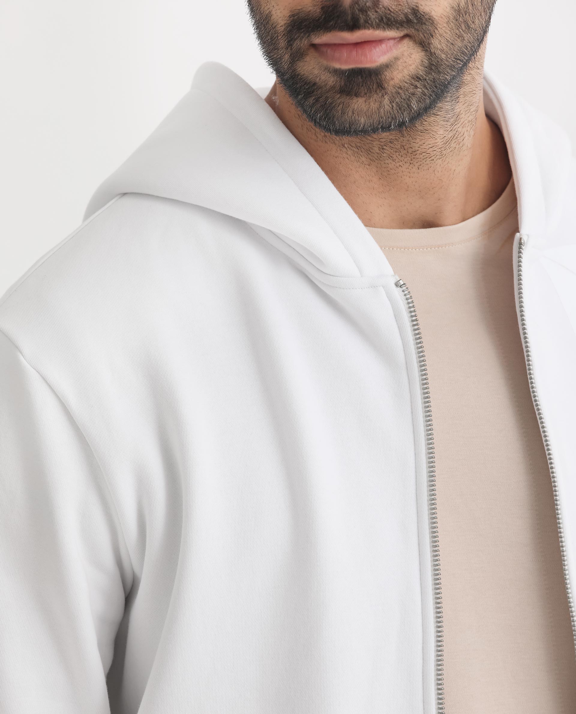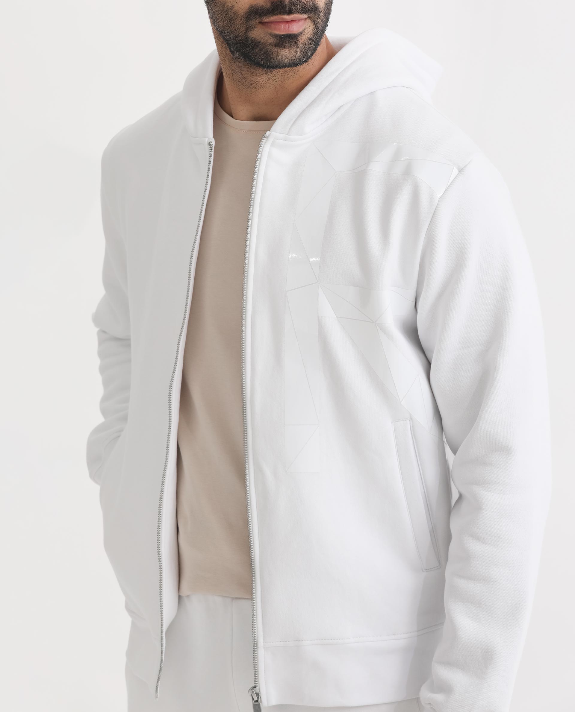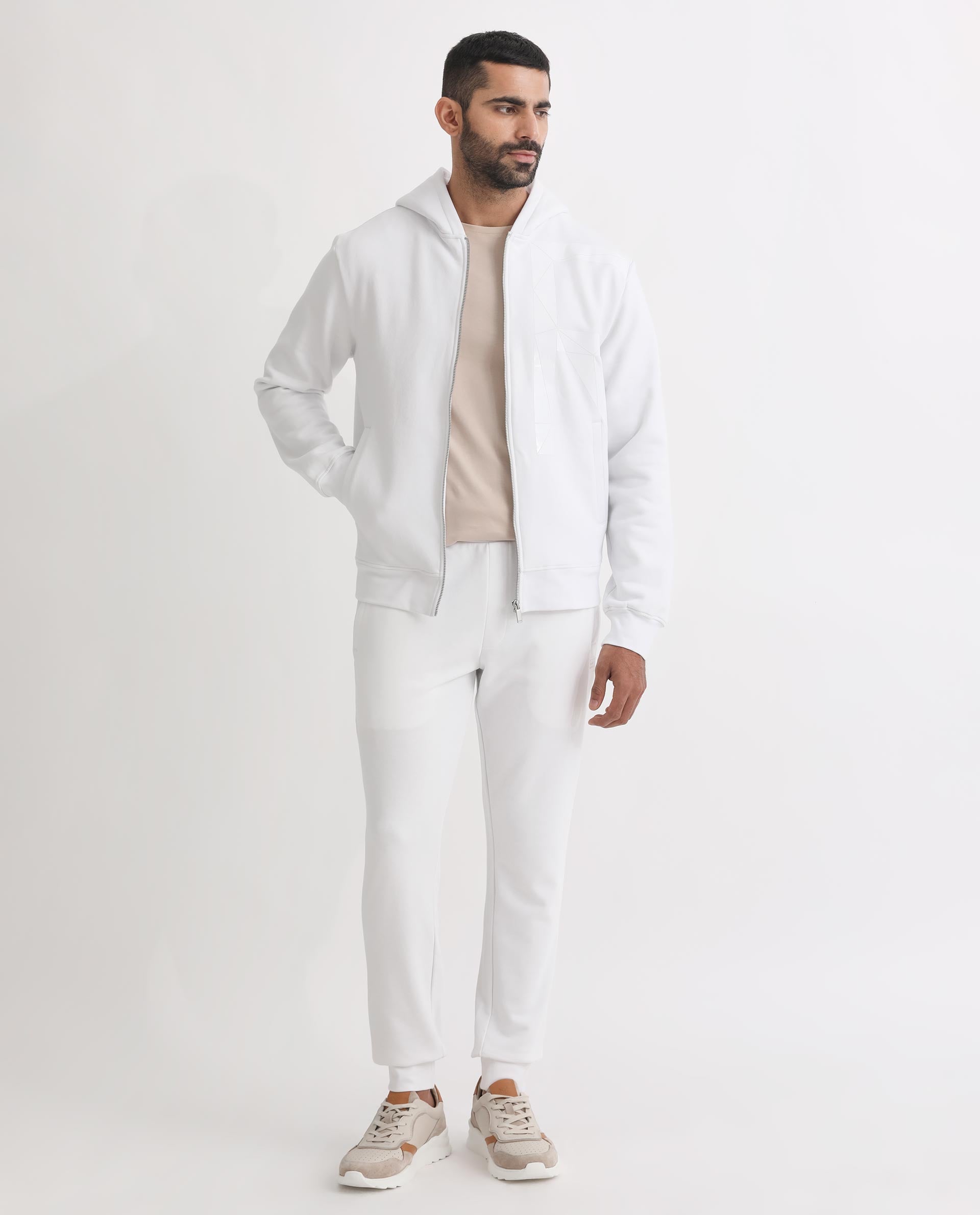 Rare Rabbit Men's Kaden White Cotton Polyester Fabric Full Sleeves Placement Foil Print Hooded Sweatshirt