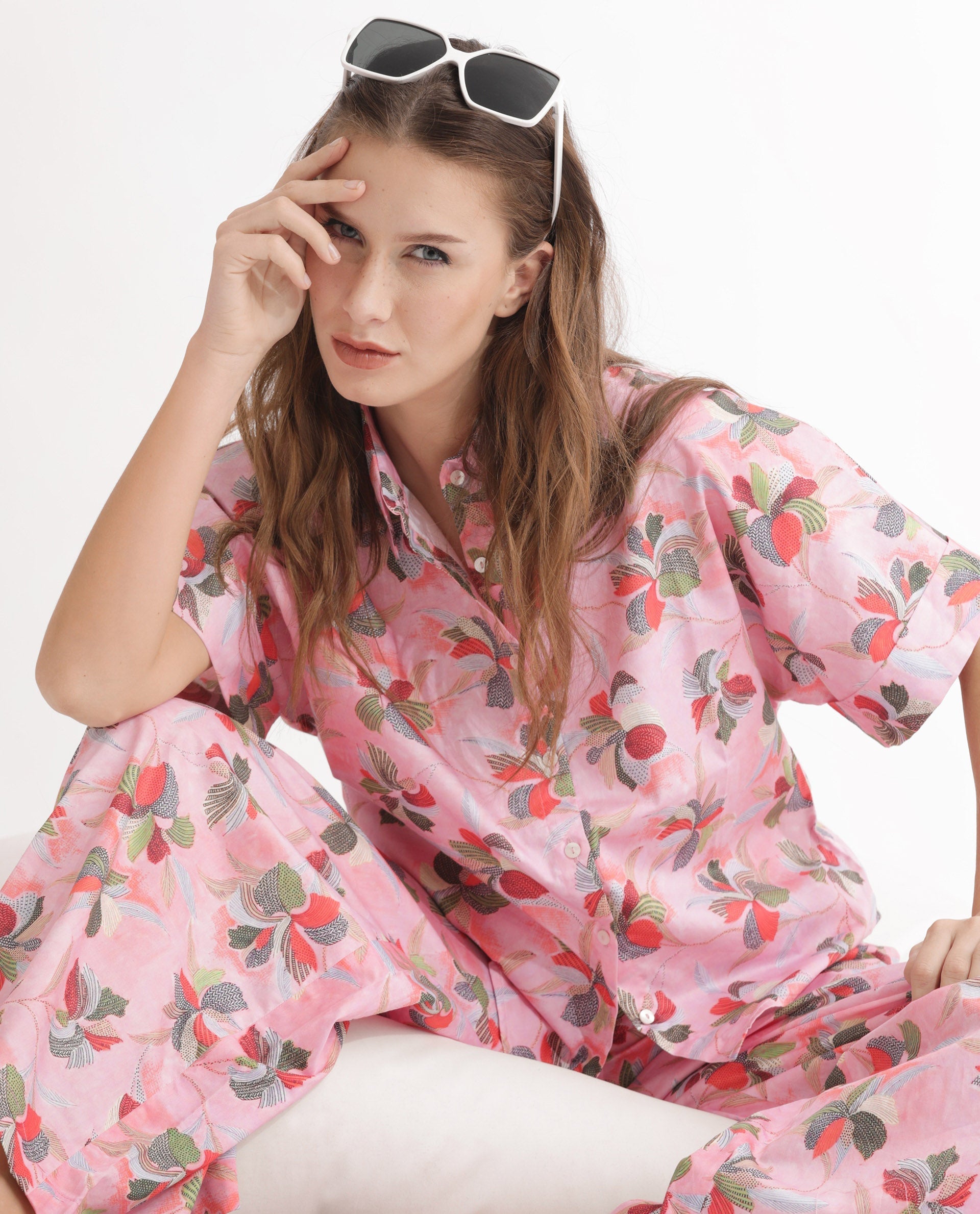 Rareism Women Kentoy-T Light Pink Cotton Fabric Short Sleeves Button Closure Shirt Collar Extended Sleeve Regular Fit Floral Print Top
