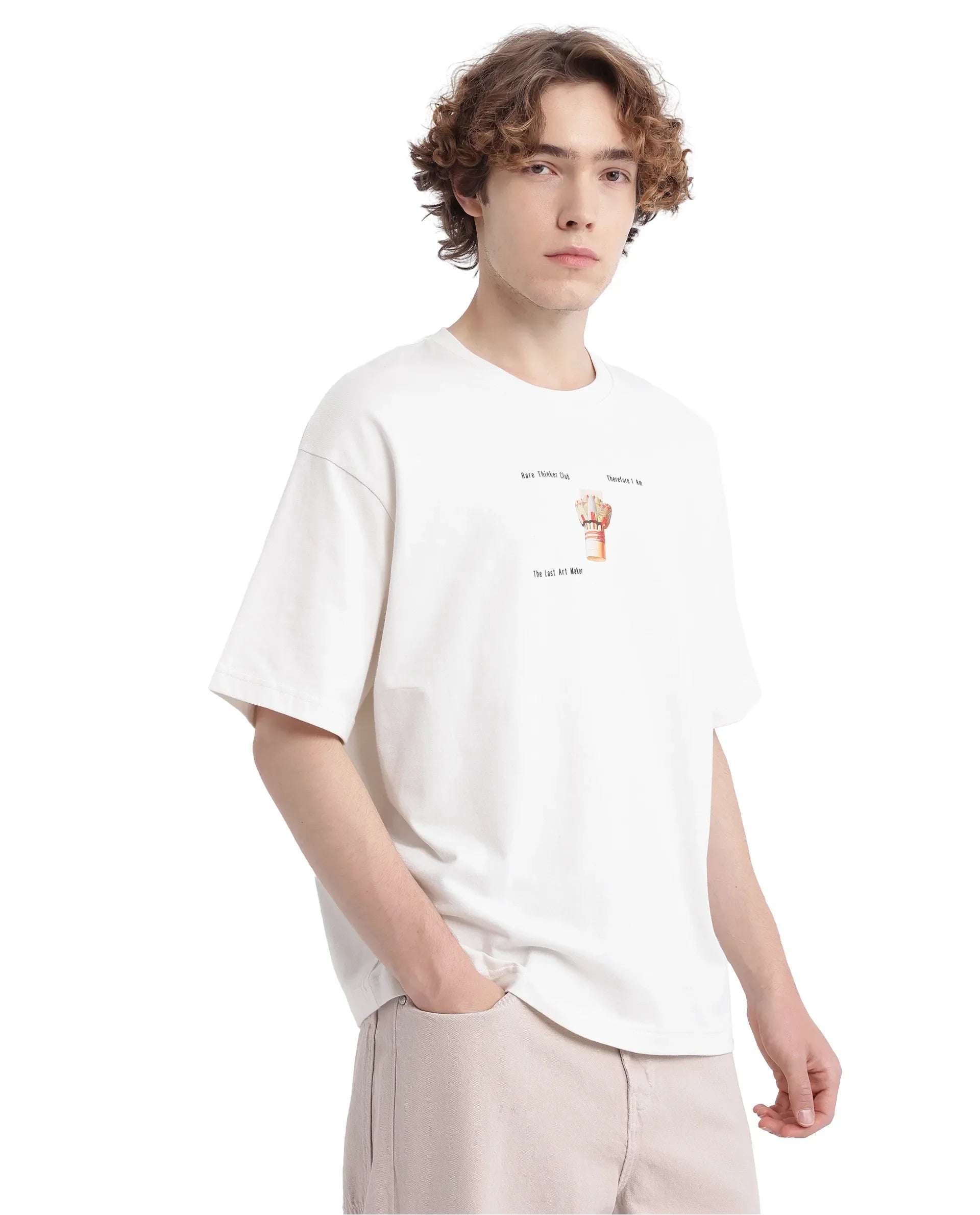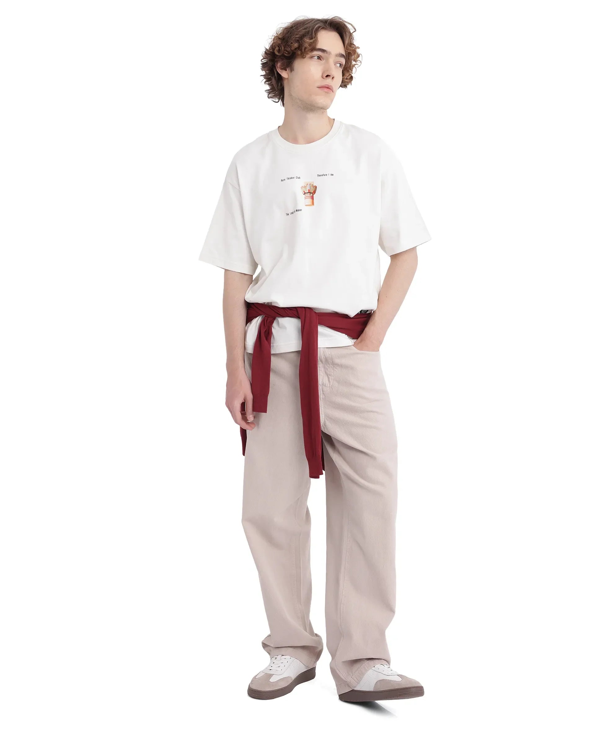 Rare Rabbit Men Laun Off White Cotton Fabric Short Sleeve Crew Neck Oversized Fit Off Placement HD Print T-Shirt