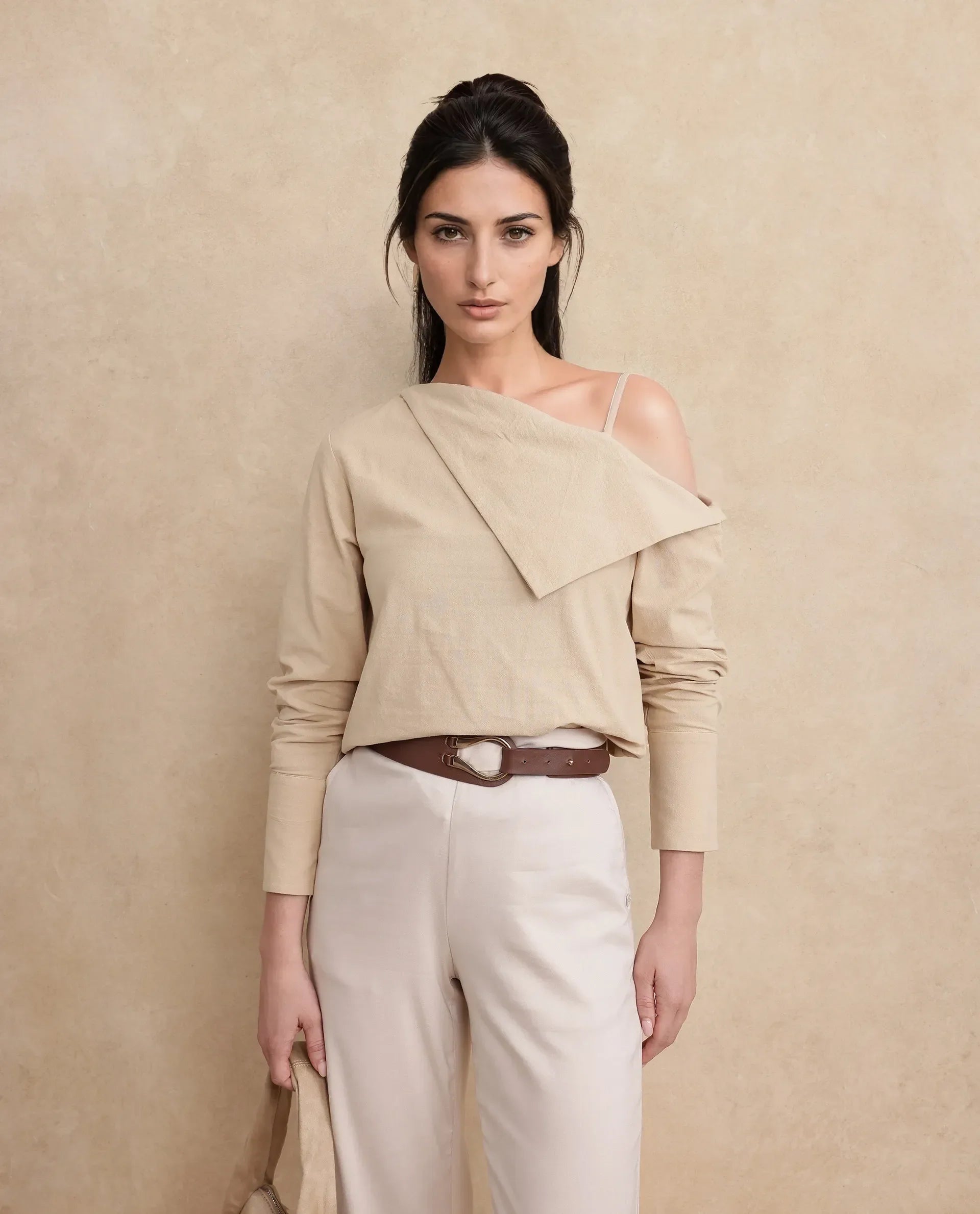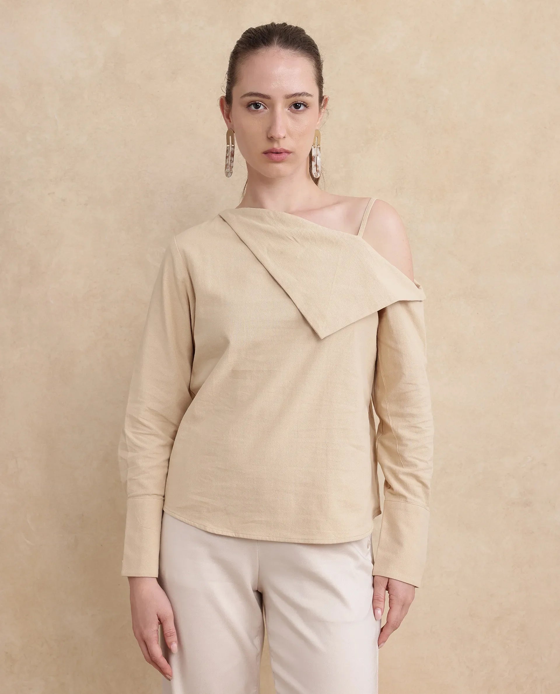 Rareism Women Nimlu Light Sand Cotton Fabric Bishop Sleeve Collarless Plain Top