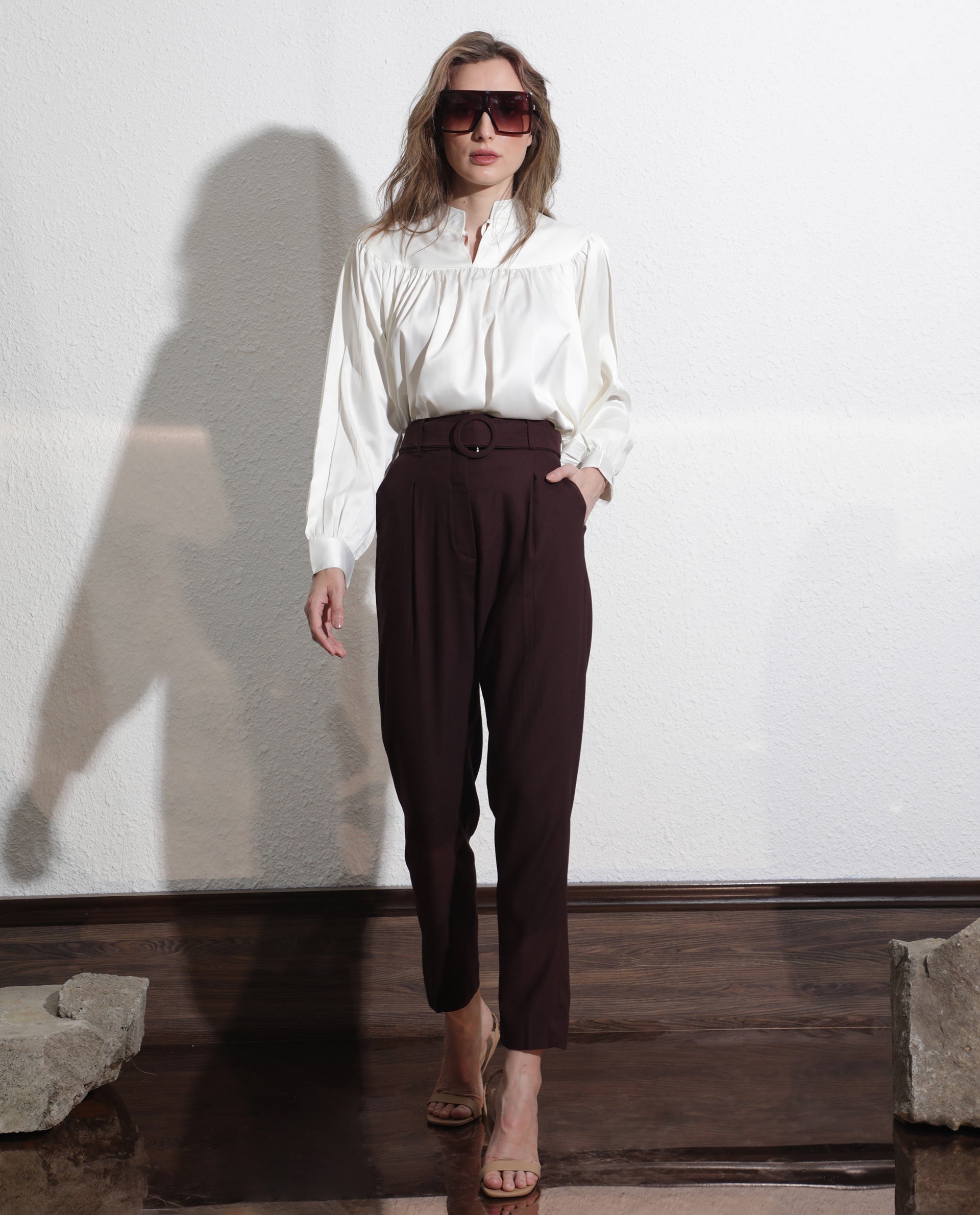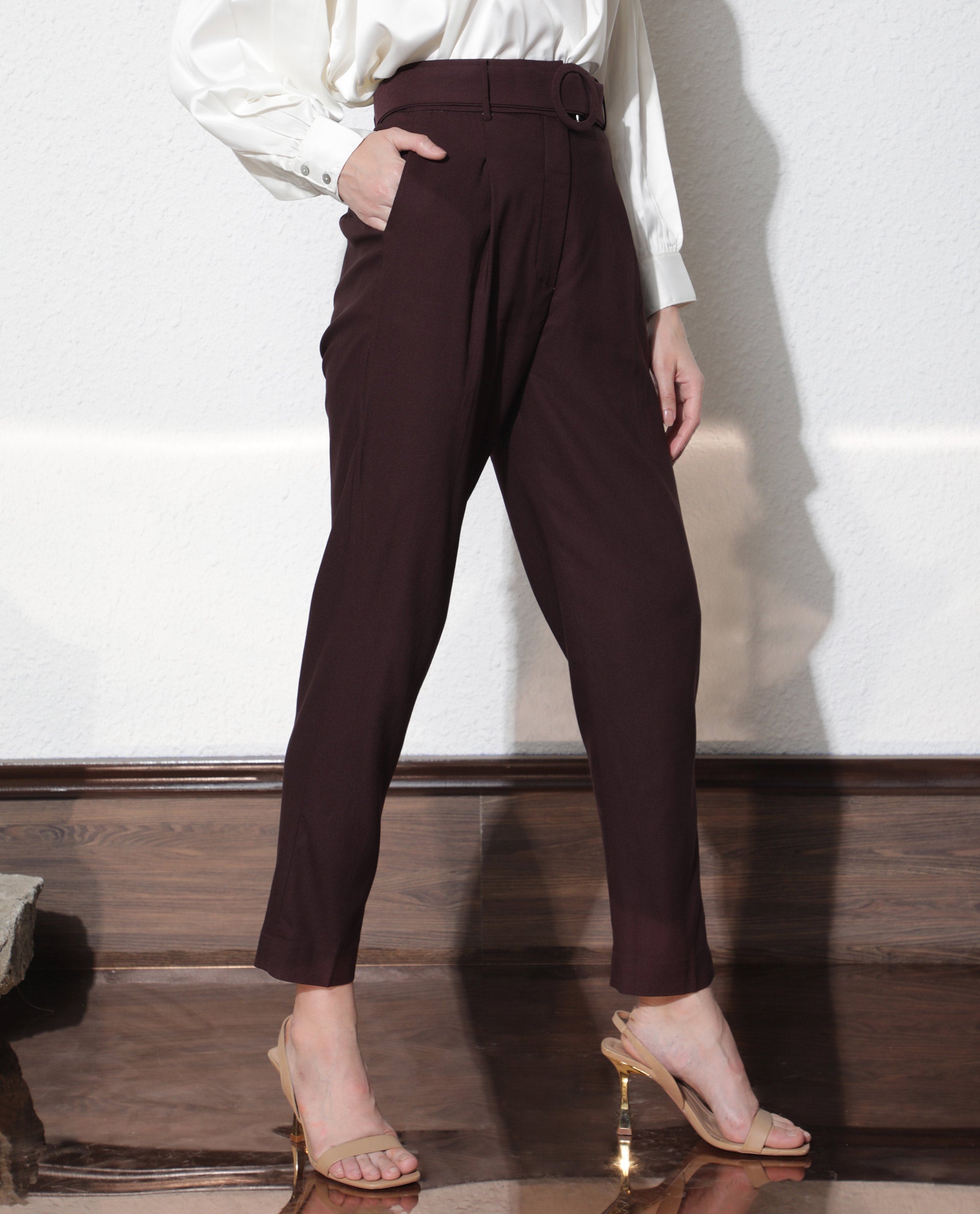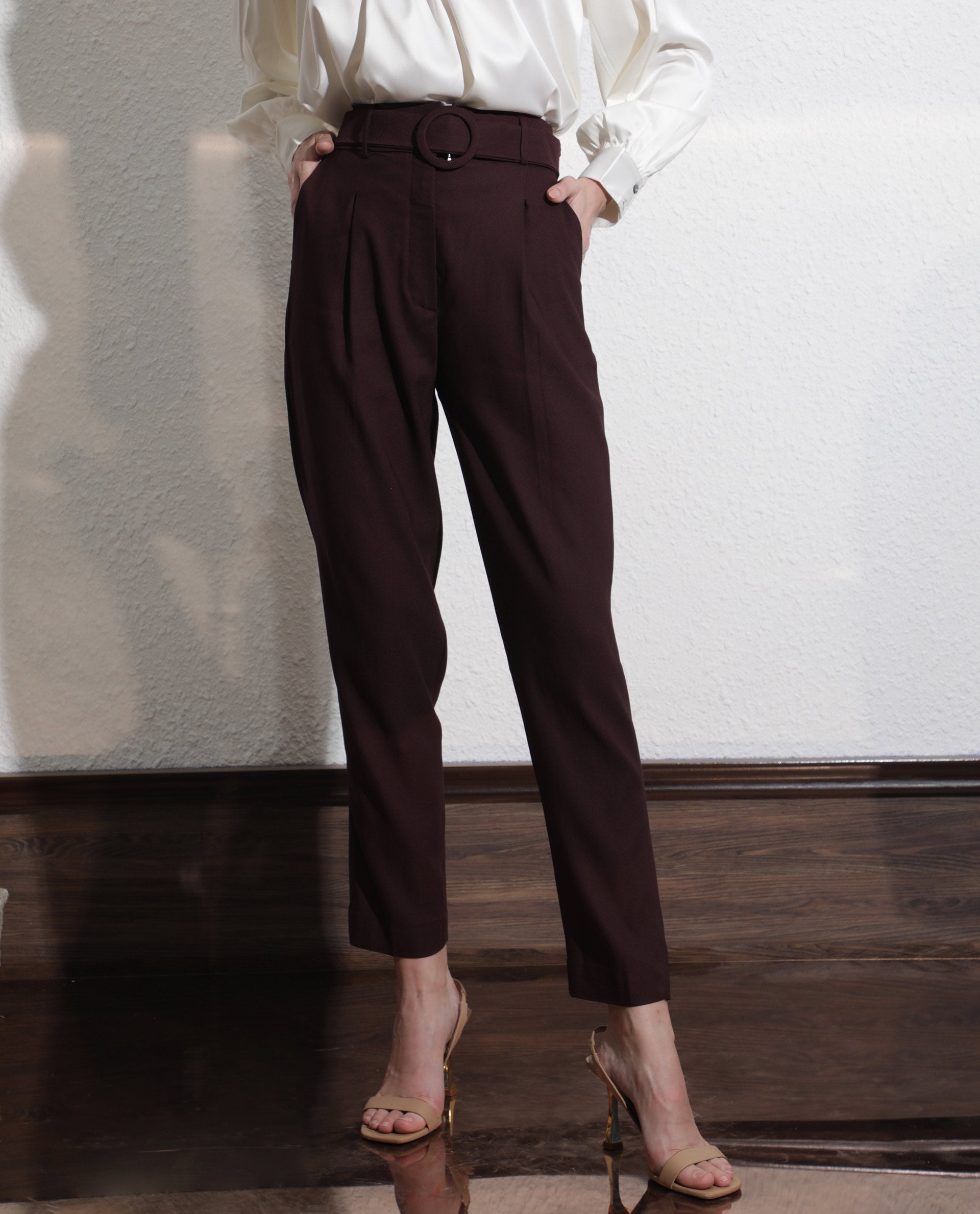 - High-waist trousers with a matching lined belt and statement buckle.