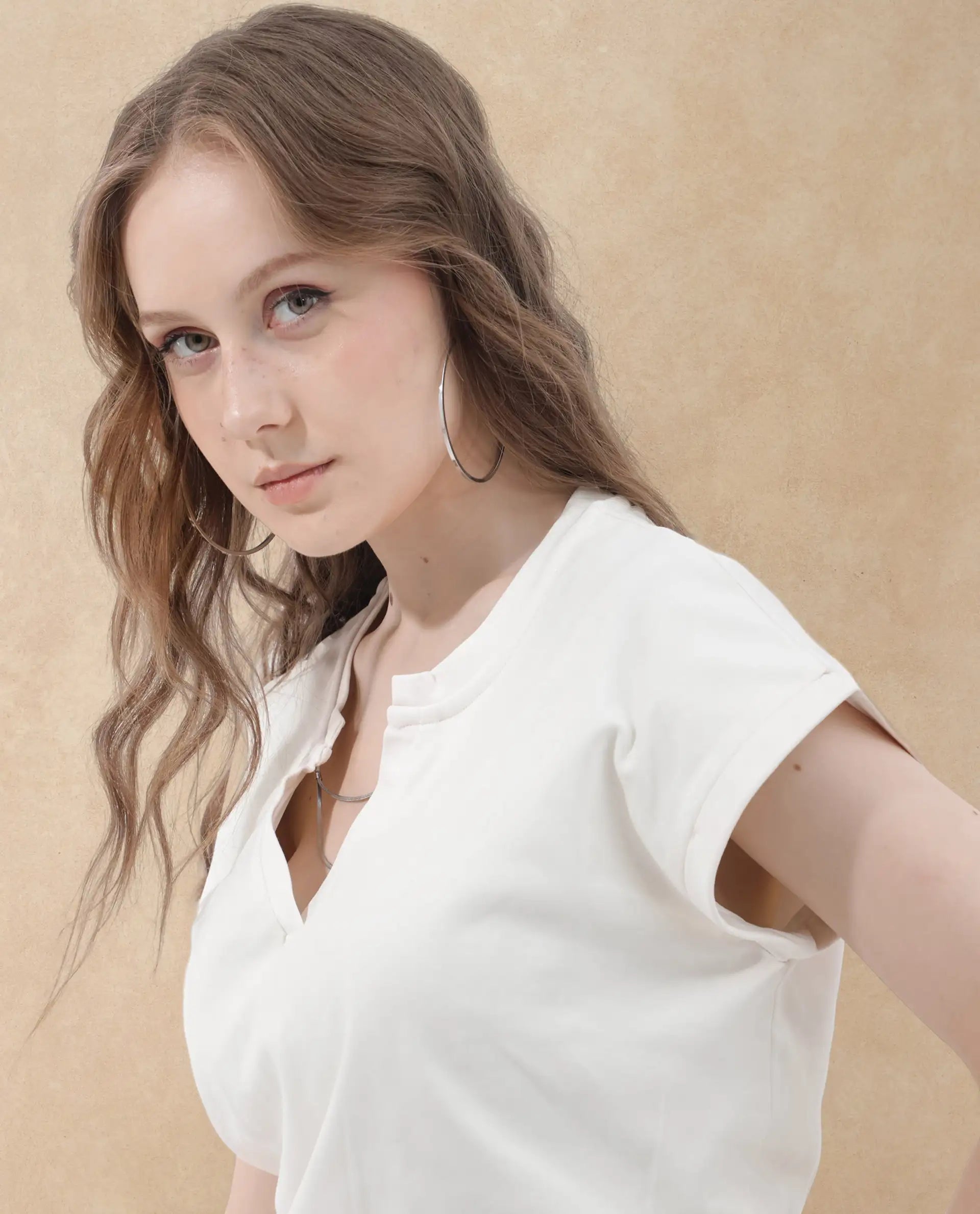 Rareism Women Sanderson Off White Cotton Fabric Short Sleeve V-Neck Solid Regular Fit Top